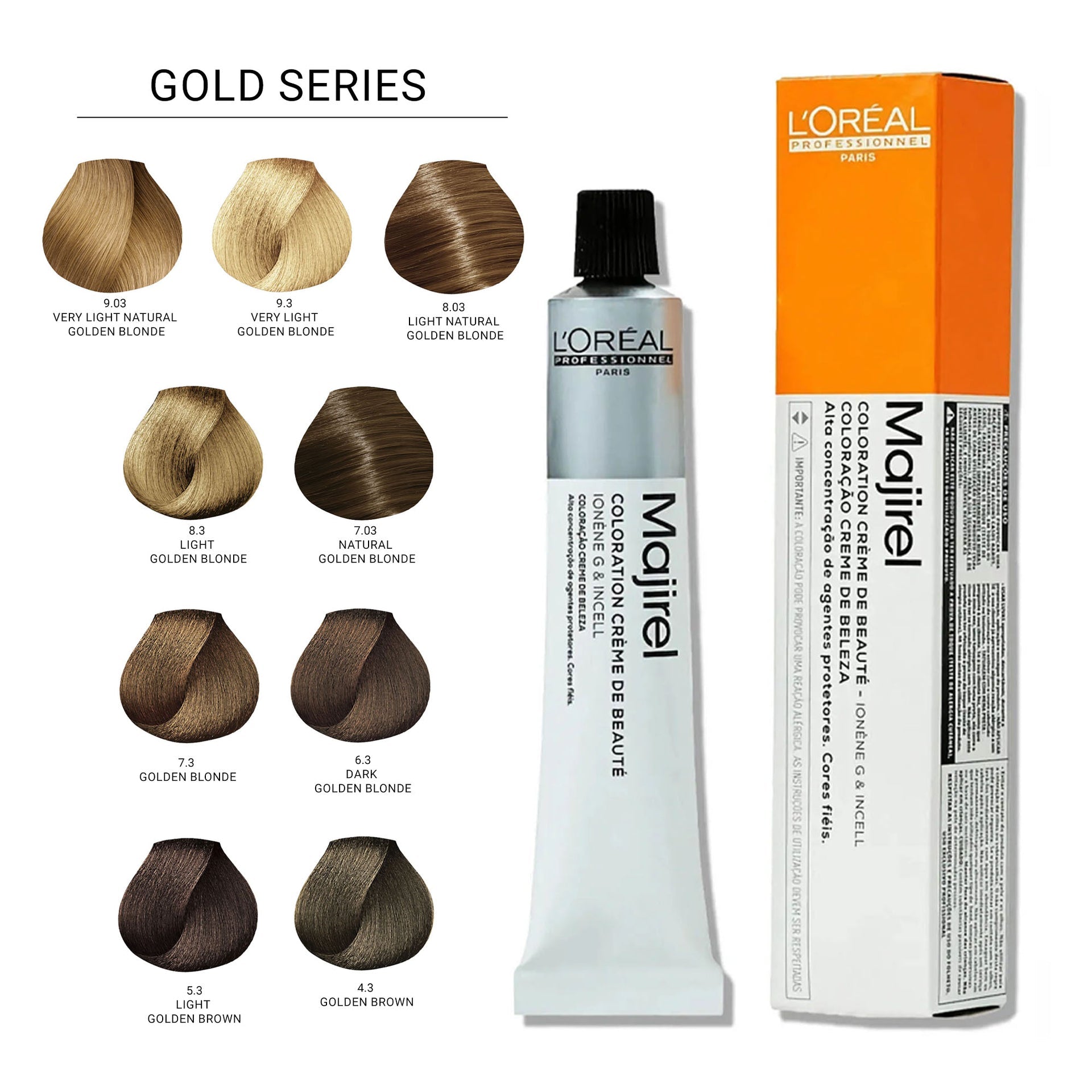 L'Oréal Professionnel Majirel Permanent Hair Colour Gold Series delivers vibrant, long-lasting colour with a rich selection of shades. Specially formulated to provide 100% grey coverage, it leaves hair feeling silky, soft, and healthy. Featuring the advanced Ionène G™ and Incell™ technologies, it targets all three levels of the hair structure, ensuring complete care from the core to the surface. This innovative system not only restores the hair’s natural strength and vitality but also enhances shine and smoothness for a truly luxurious finish.