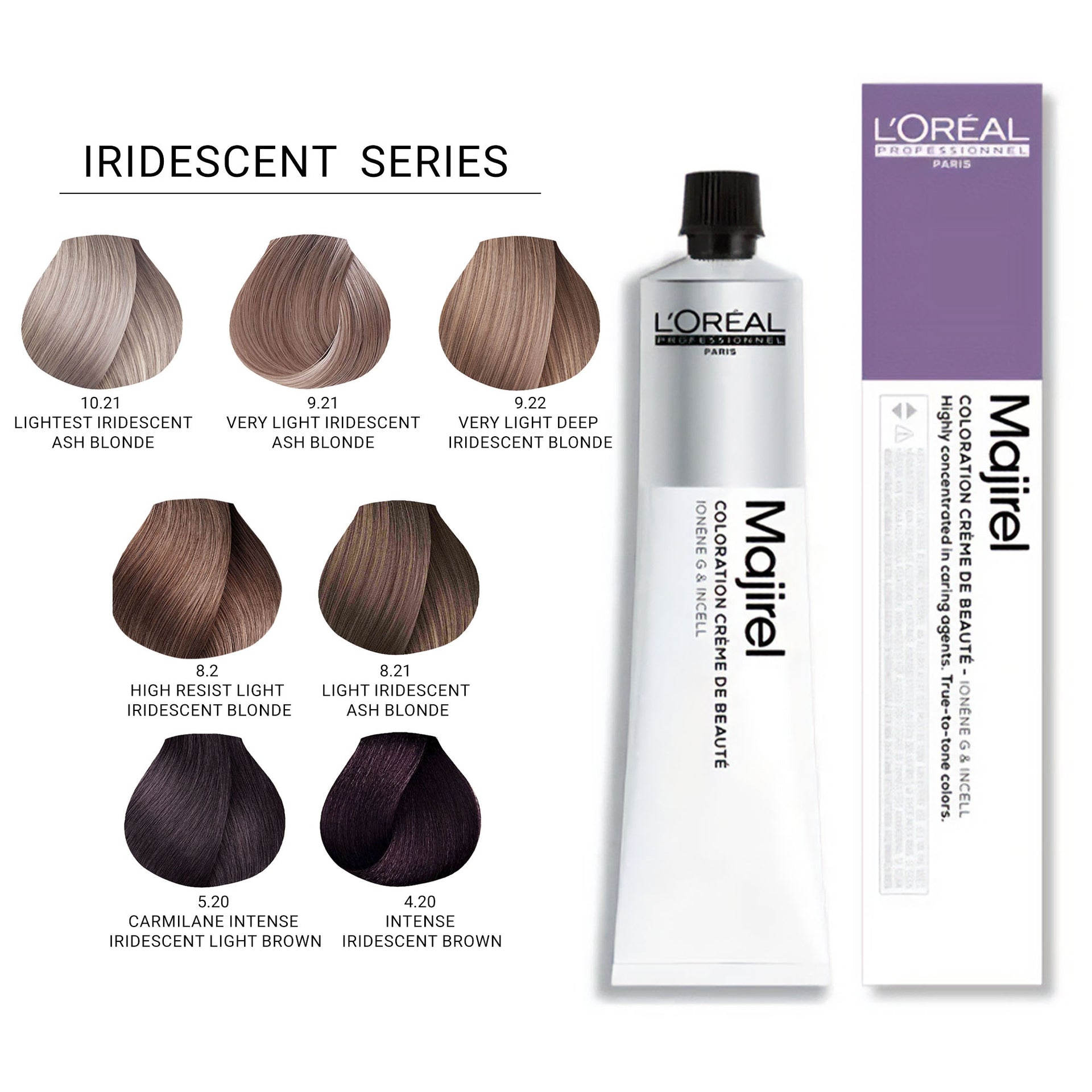 L'Oréal Professionnel Majirel Permanent Hair Colour Iridescent Series delivers vibrant, long-lasting colour with a rich palette of shades. Designed to cover 100% grey hair, it leaves hair feeling silky and soft, offering a luxurious finish. The advanced Ionène G™ and Incell™ technologies penetrate all three levels of the hair fibre, ensuring optimal care from within. This innovative formula not only restores the hair’s natural strength and beauty but also provides superior conditioning and shine, making it the perfect choice for professional use.