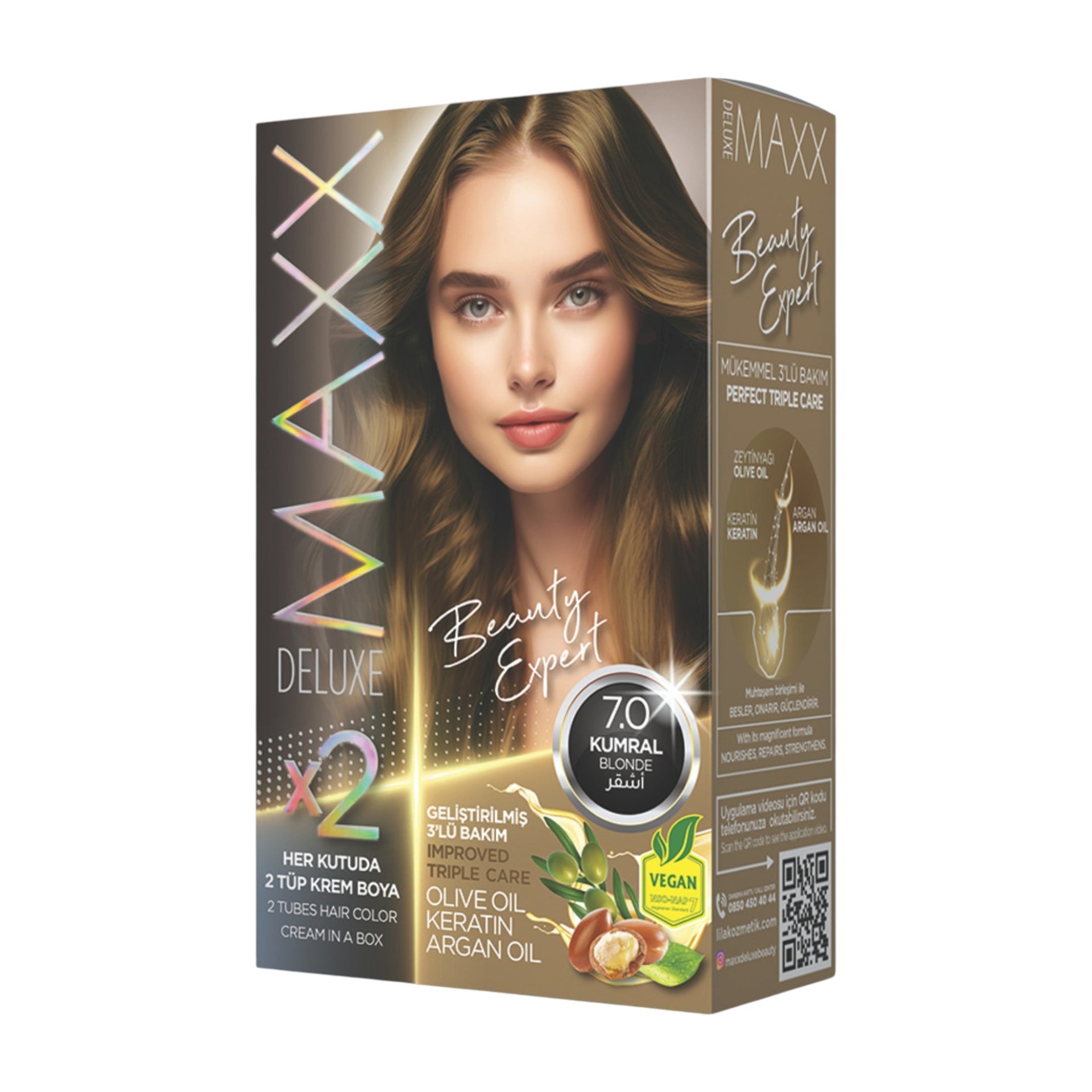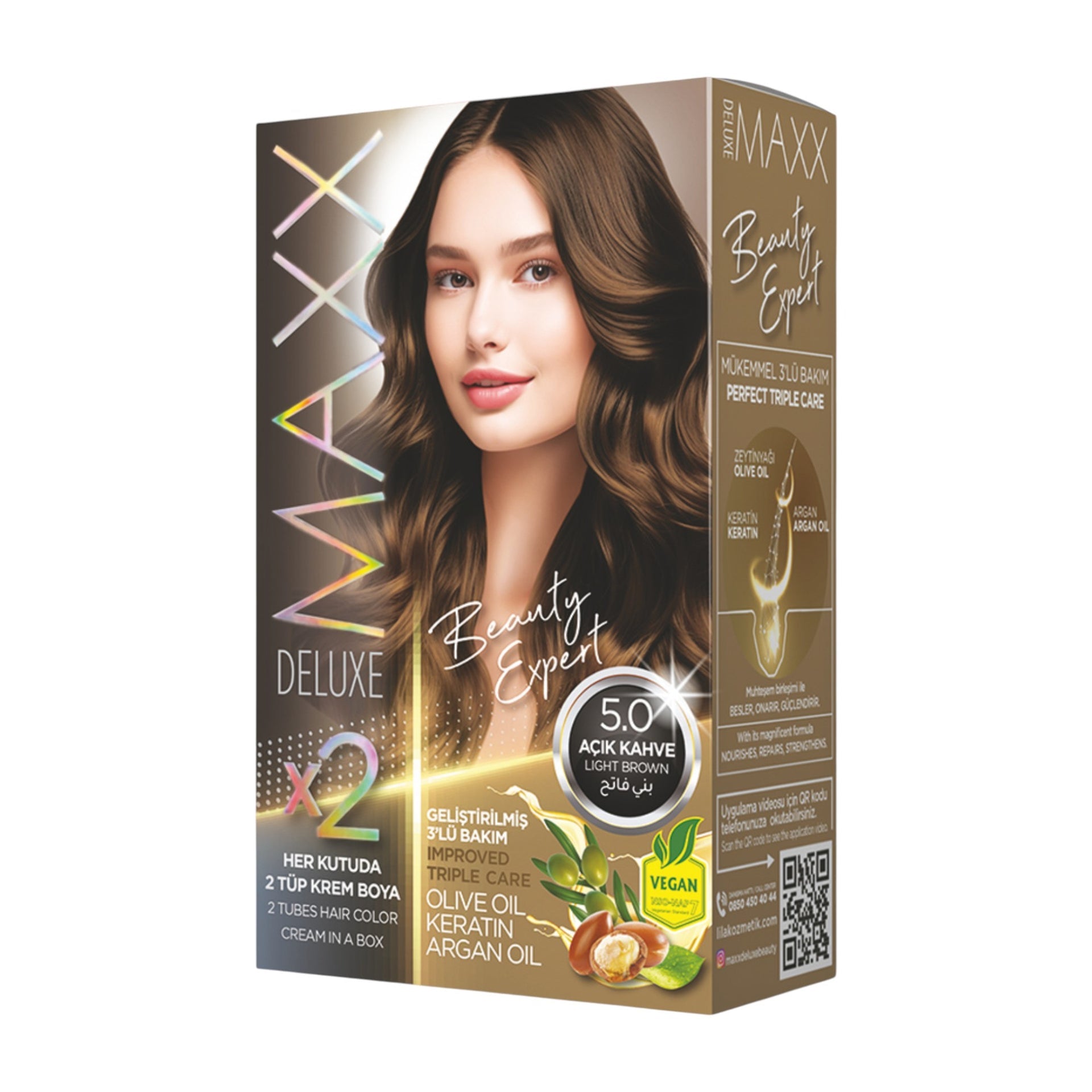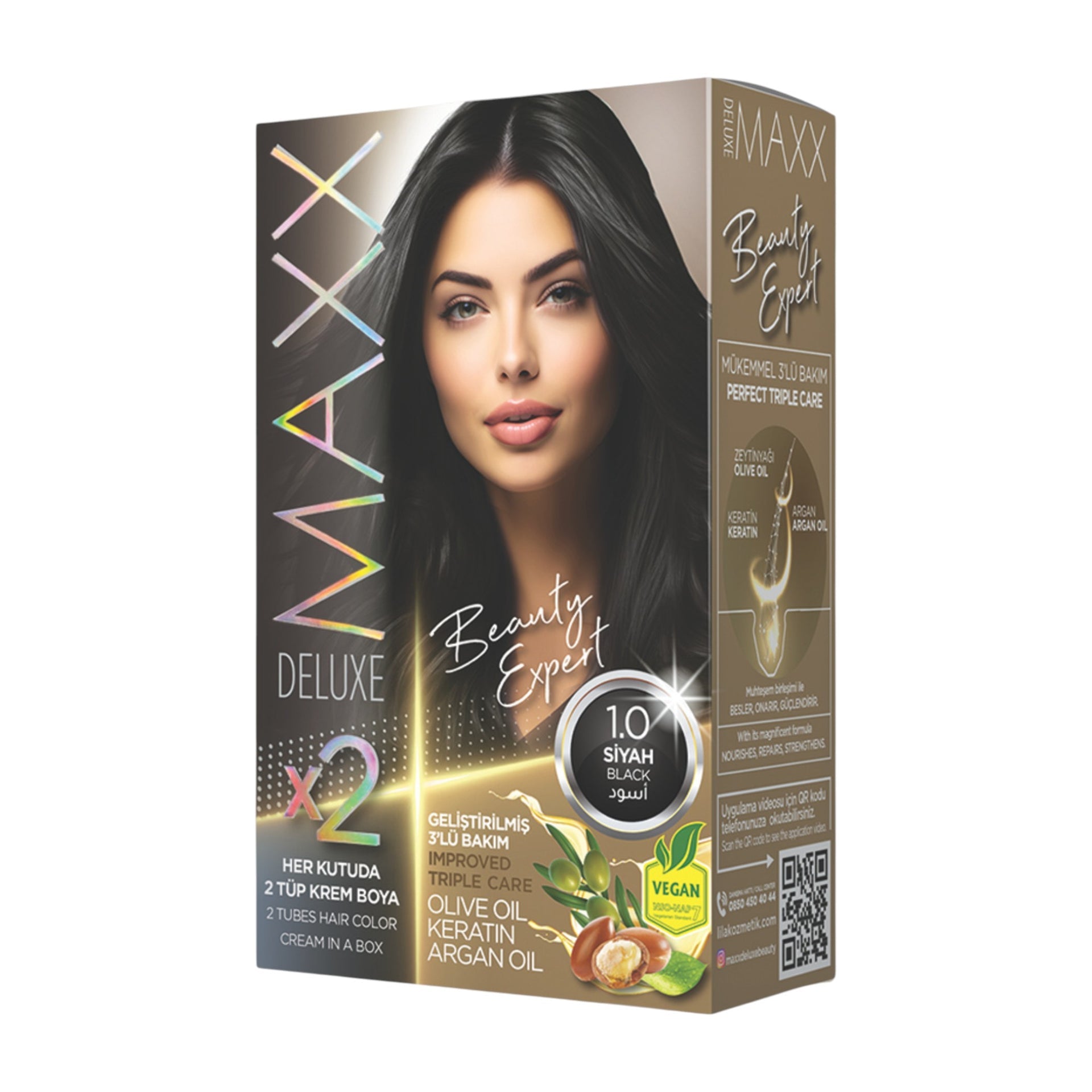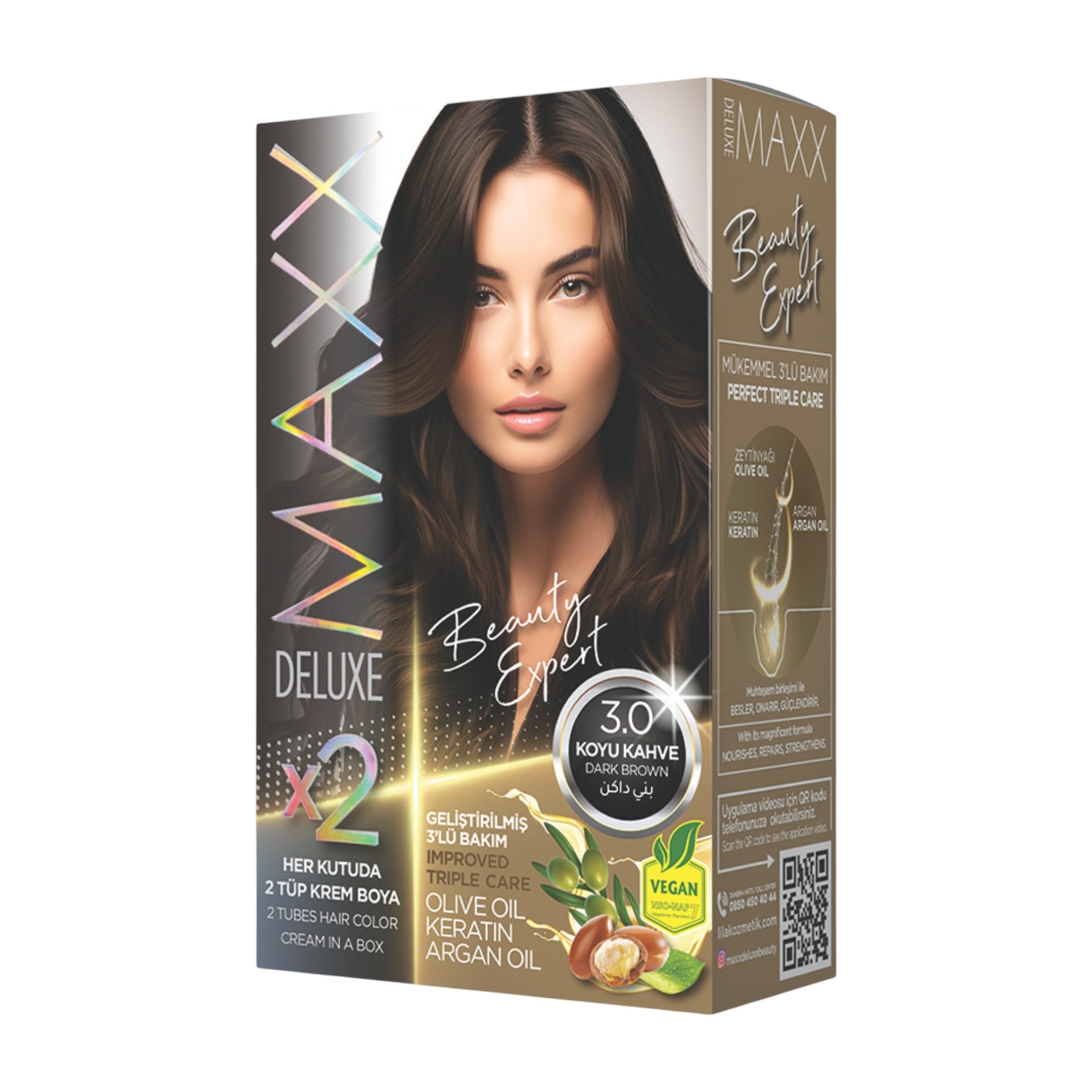 Experience beautiful, long-lasting results with the Maxx Deluxe - Beauty Expert Hair Colour (2 Applications), the ultimate permanent hair dye that provides a triple care treatment in every box. Its magnificent combination of nourishing ingredients is designed to care for your hair while you achieve a vibrant new shade. The permanent cream hair dye itself is enriched with Olive Oil, which works to protect and moisturise the hair during the colouring process. This ensures your hair maintains its softness and health while the colour develops.