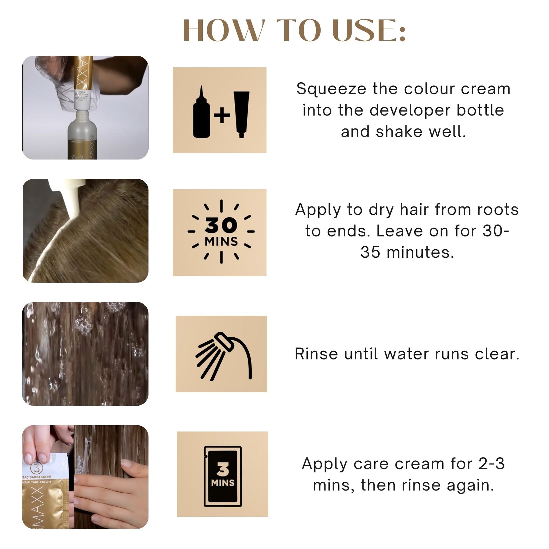 Mix one tube of the cream hair dye with one bottle of the developer in a non-metallic bowl. Apply to the hair, leave to develop as per the user's guide, then rinse and apply the hair care cream.