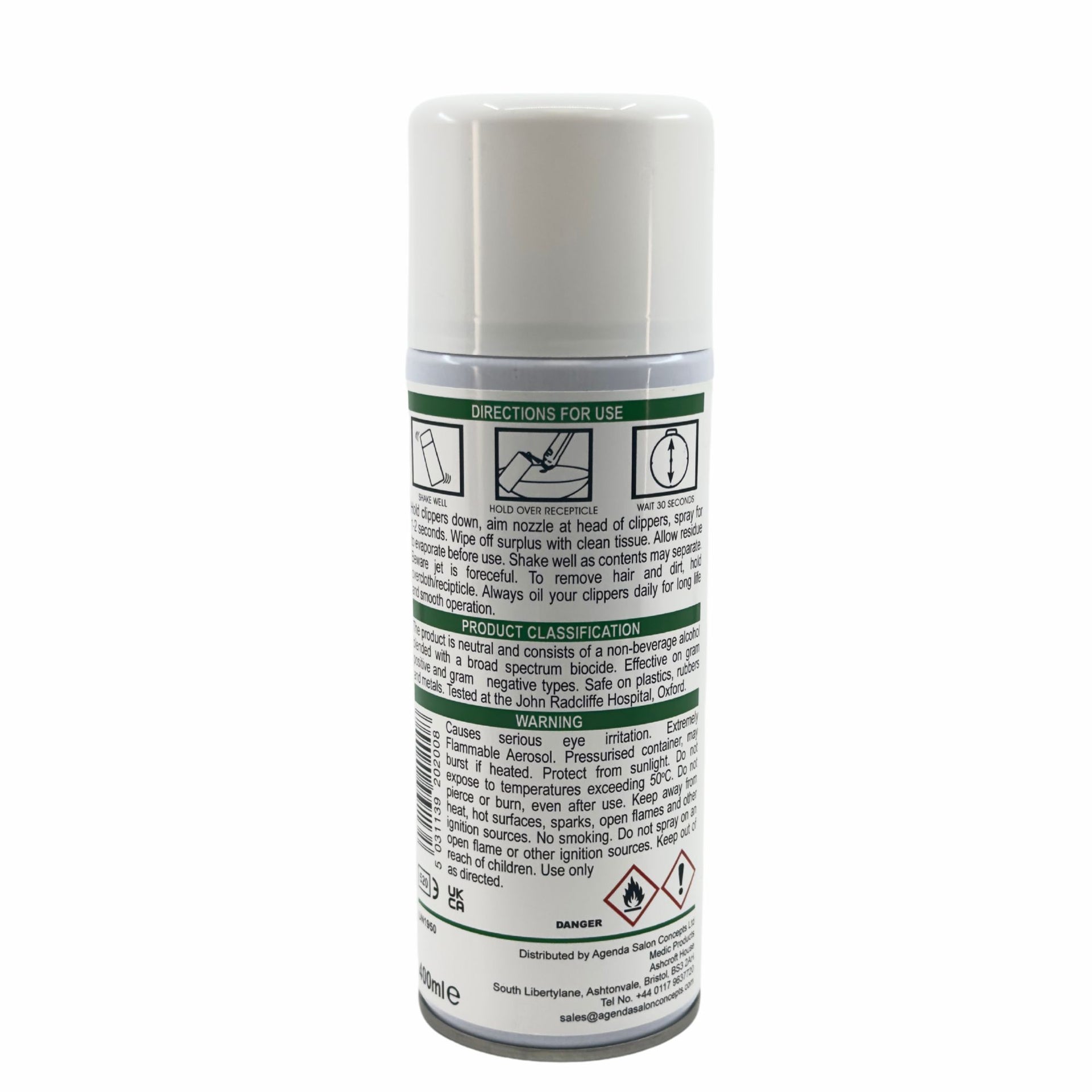Hold can approximately 15cm from clipper blades and spray directly onto the blades before every cut whilst the clipper is running; allow to penetrate for a few seconds before proceeding with cutting. For thorough maintenance, spray after the final client of the day, run the clipper for 10 seconds to distribute the formula, then wipe excess from the outer surfaces.