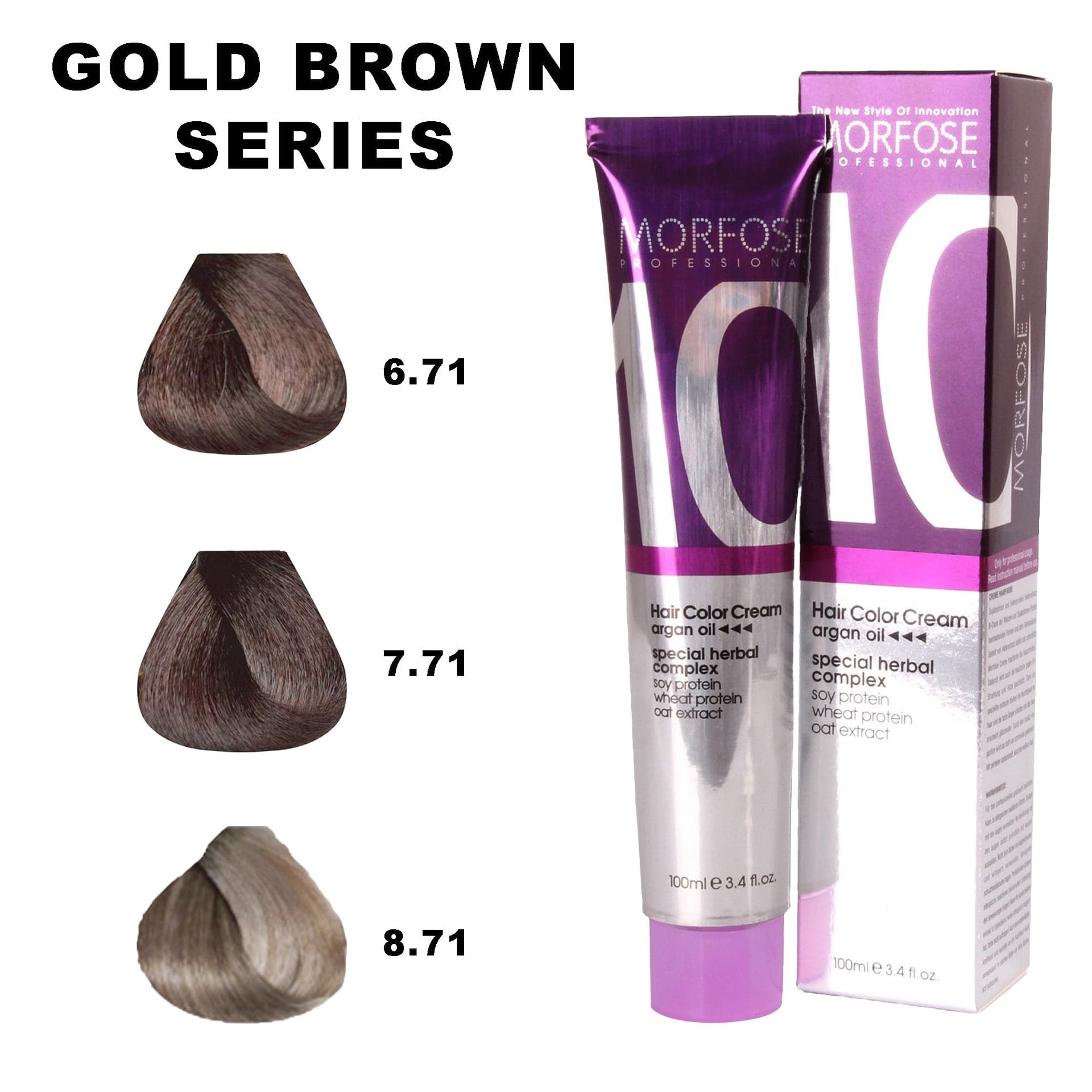 Step into a world of refined elegance with Morfose 10 Hair Colour Cream 100ml from the Gold Brown Series. This exquisite collection blends cool ash tones with hints of golden warmth, creating sophisticated, multi-dimensional browns that enhance any complexion. Each shade in this series is formulated with a powerful blend of nine essential oils, including Japanese Camellia, Macadamia, and Argan, ensuring your hair is not only beautifully coloured but also deeply nourished. The result is hair that radiates natural shine and vibrancy, offering a strikingly healthy look. Designed for long-lasting wear, these colours resist fading, maintaining their richness for weeks. Whether you're seeking a subtle change or a bold transformation, the Gold Brown Series offers the perfect balance of cool depth and golden warmth.