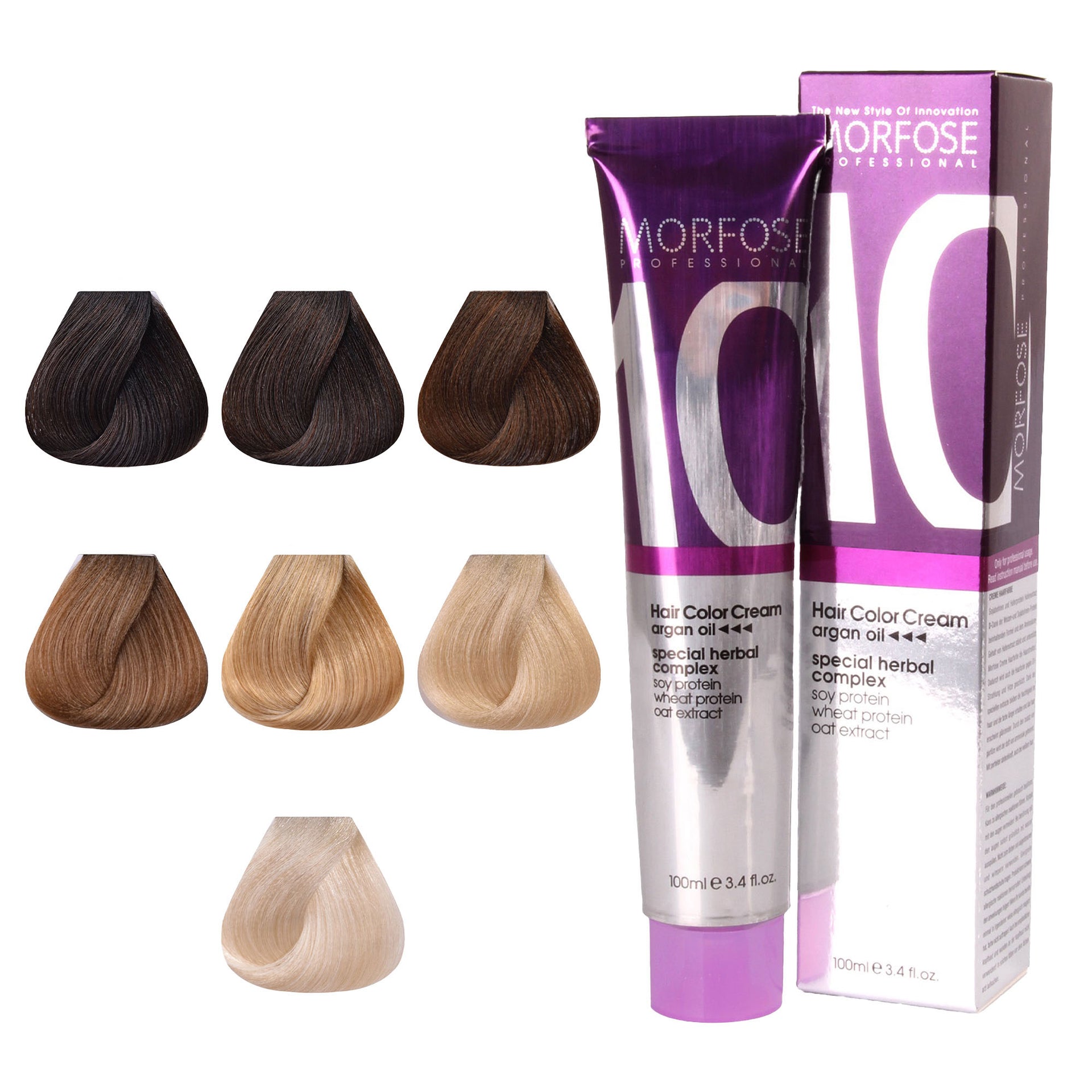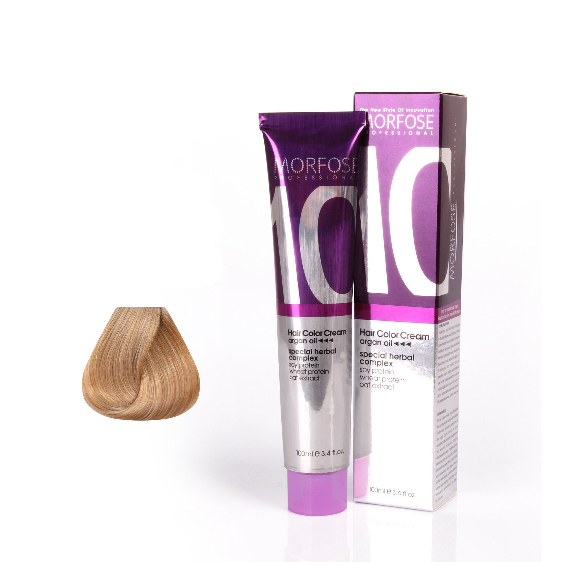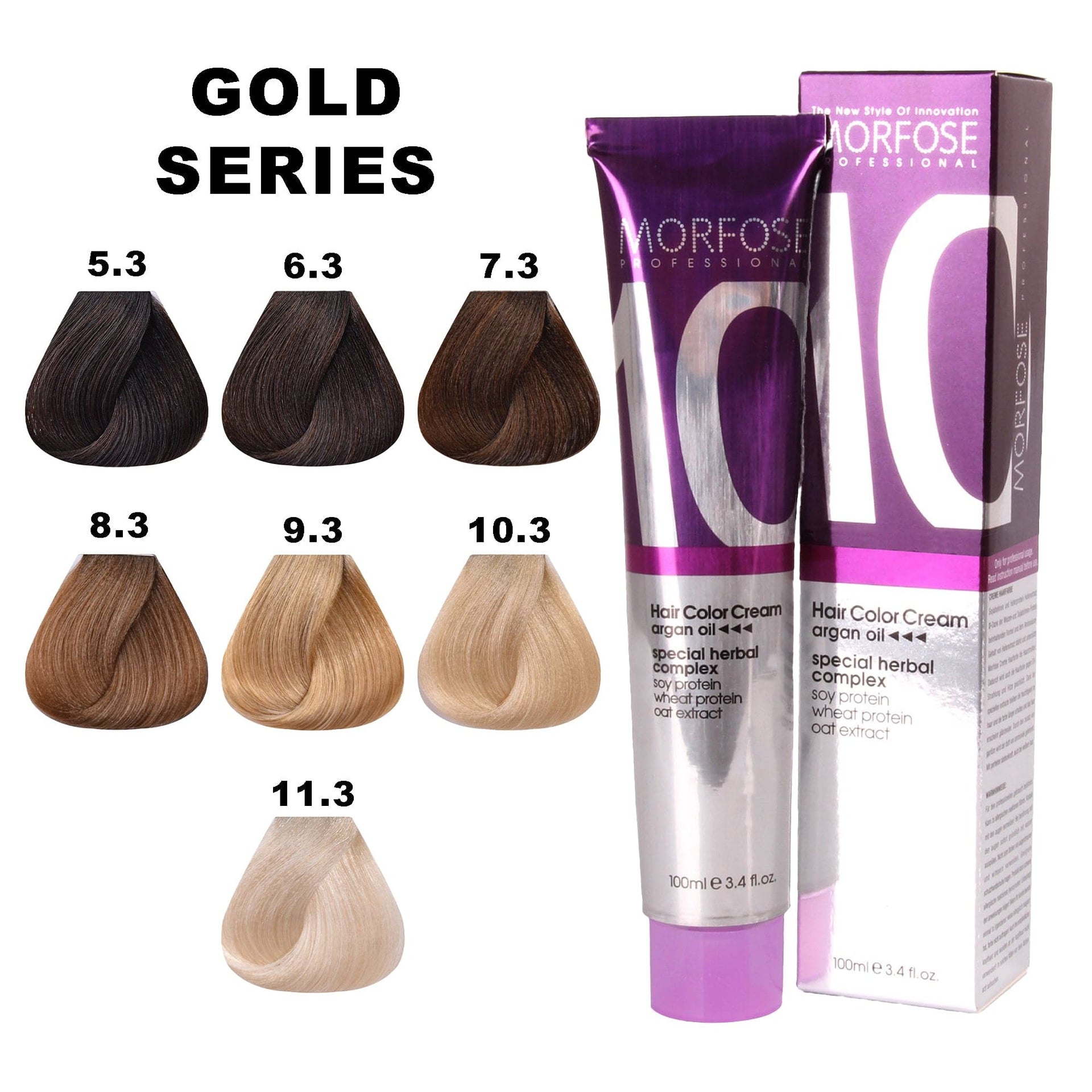 Unveil a radiant new you with Morfose 10 Hair Colour Cream 100ml from the Gold Series. This luxurious collection offers a stunning palette of golden shades, from Light Dore Brown to Extra Platinum Dore, providing a vibrant, sun-kissed glow to enhance your natural beauty. Infused with a rich blend of nine botanical oils, including Japanese Camellia, Macadamia, and Argan, this colour cream not only transforms your hair’s shade but also deeply conditions it, leaving your locks silky, nourished, and glossy. Whether you're looking for a subtle golden hue or a bold platinum finish, this series delivers beautiful, long-lasting results while keeping your hair healthy and vibrant. The advanced formula ensures complete grey coverage, rejuvenating your hair’s appearance with an effortless golden shine.