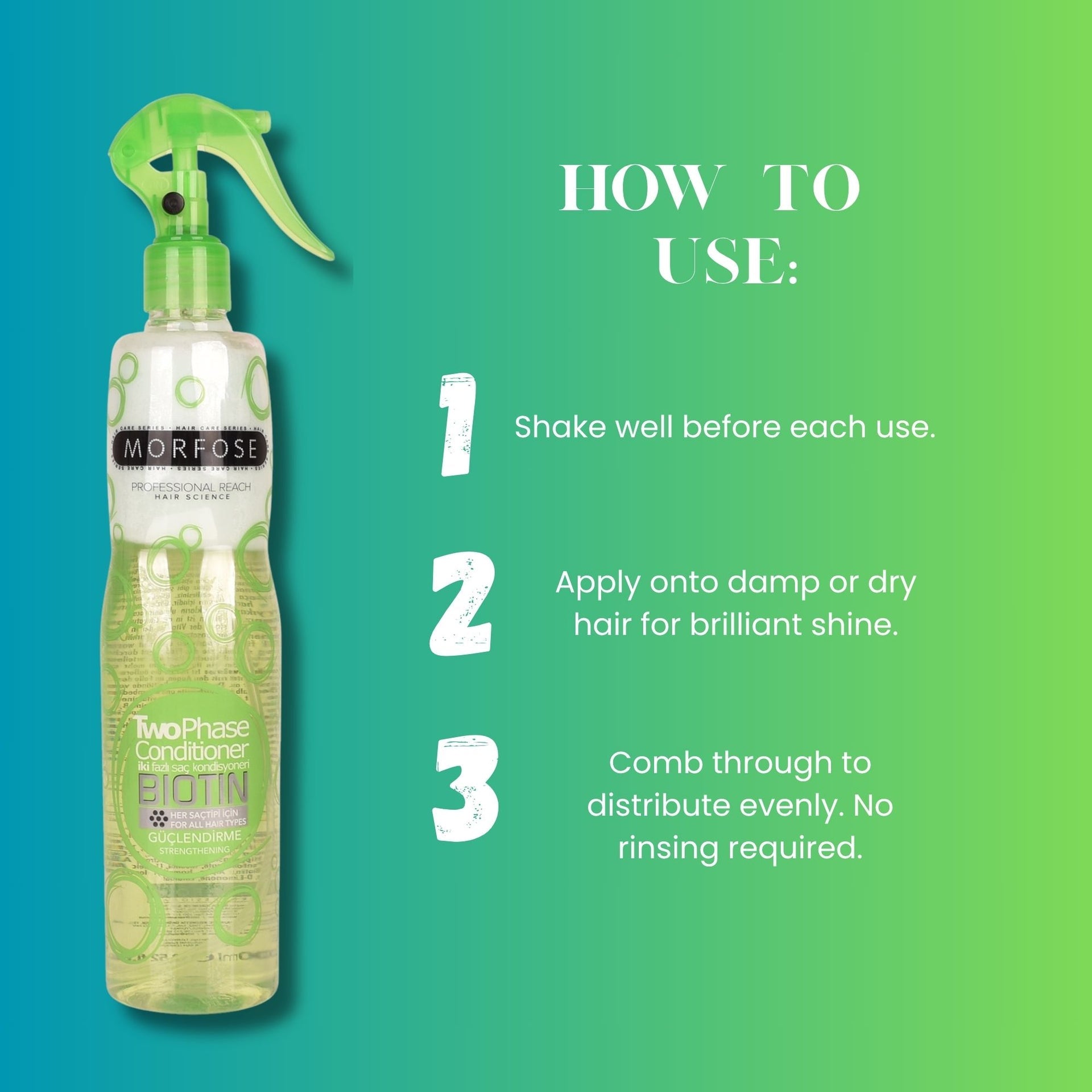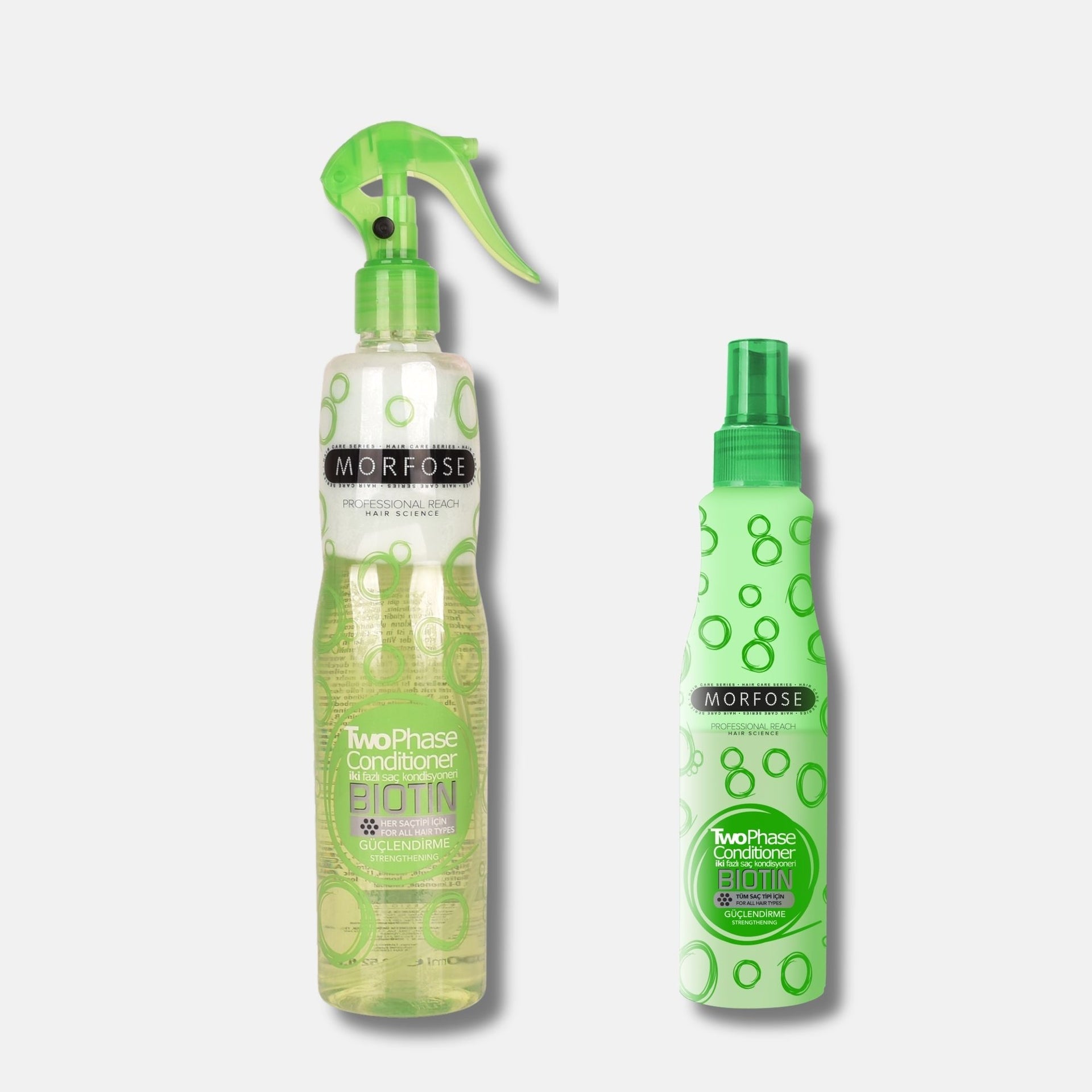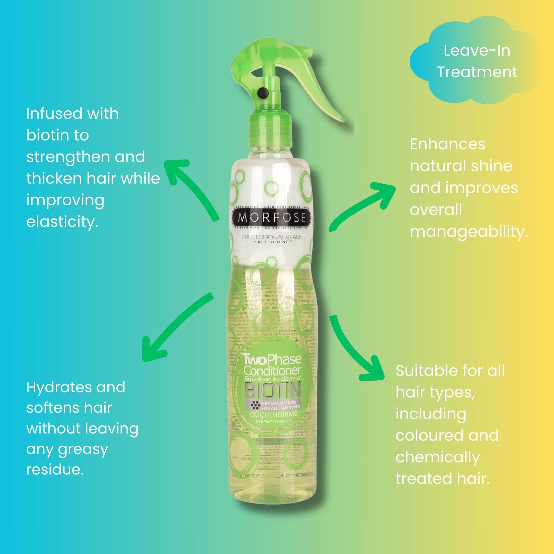 The unique system of the Morfose - Biotin Two Phase Hair Conditioner works in harmony to deliver visible results, leaving hair feeling thicker, more manageable, and with a vibrant natural shine. Suitable for coloured and chemically treated hair, this conditioner is an effortless way to care for your hair daily. It is the perfect daily solution for achieving stronger, fuller, and more beautiful hair.