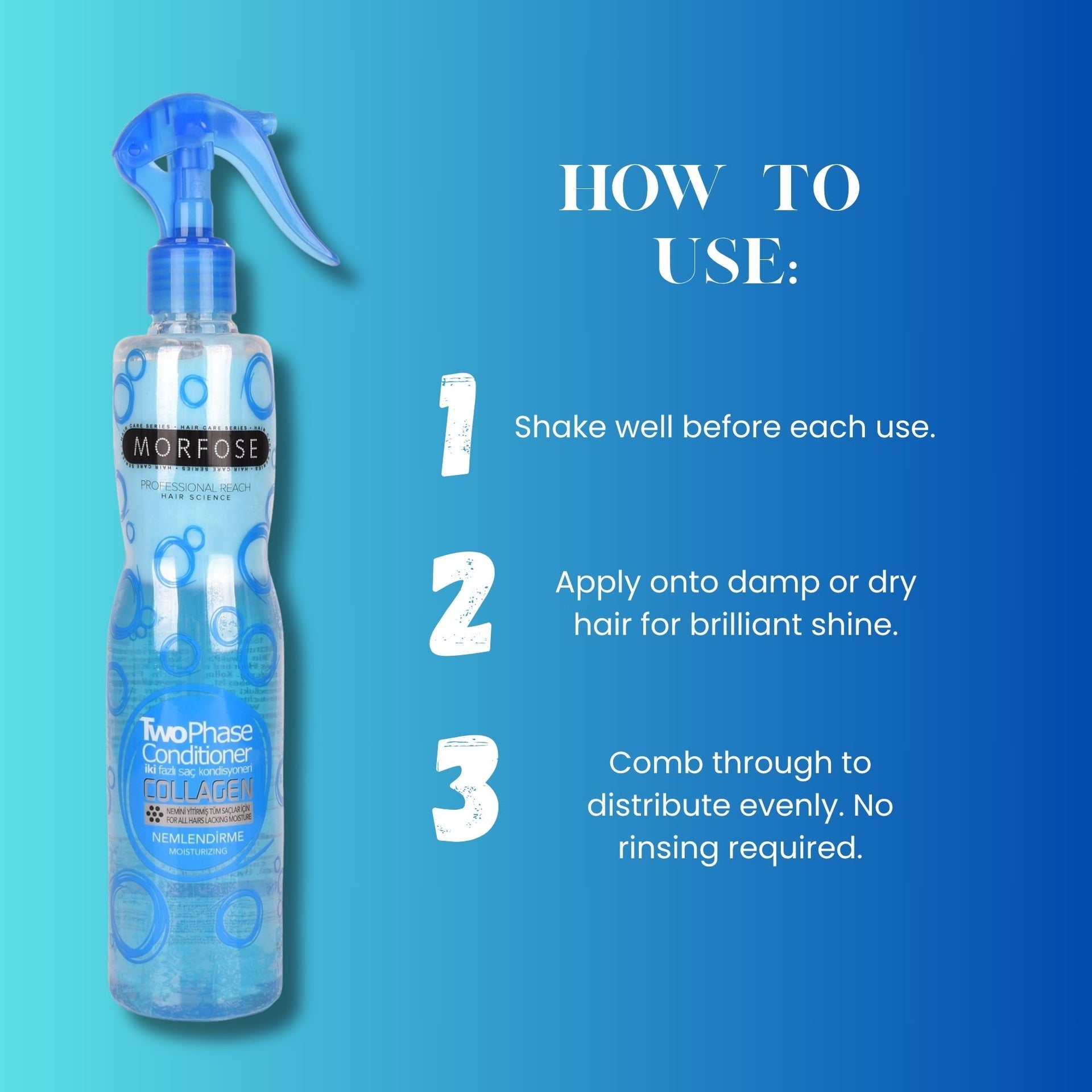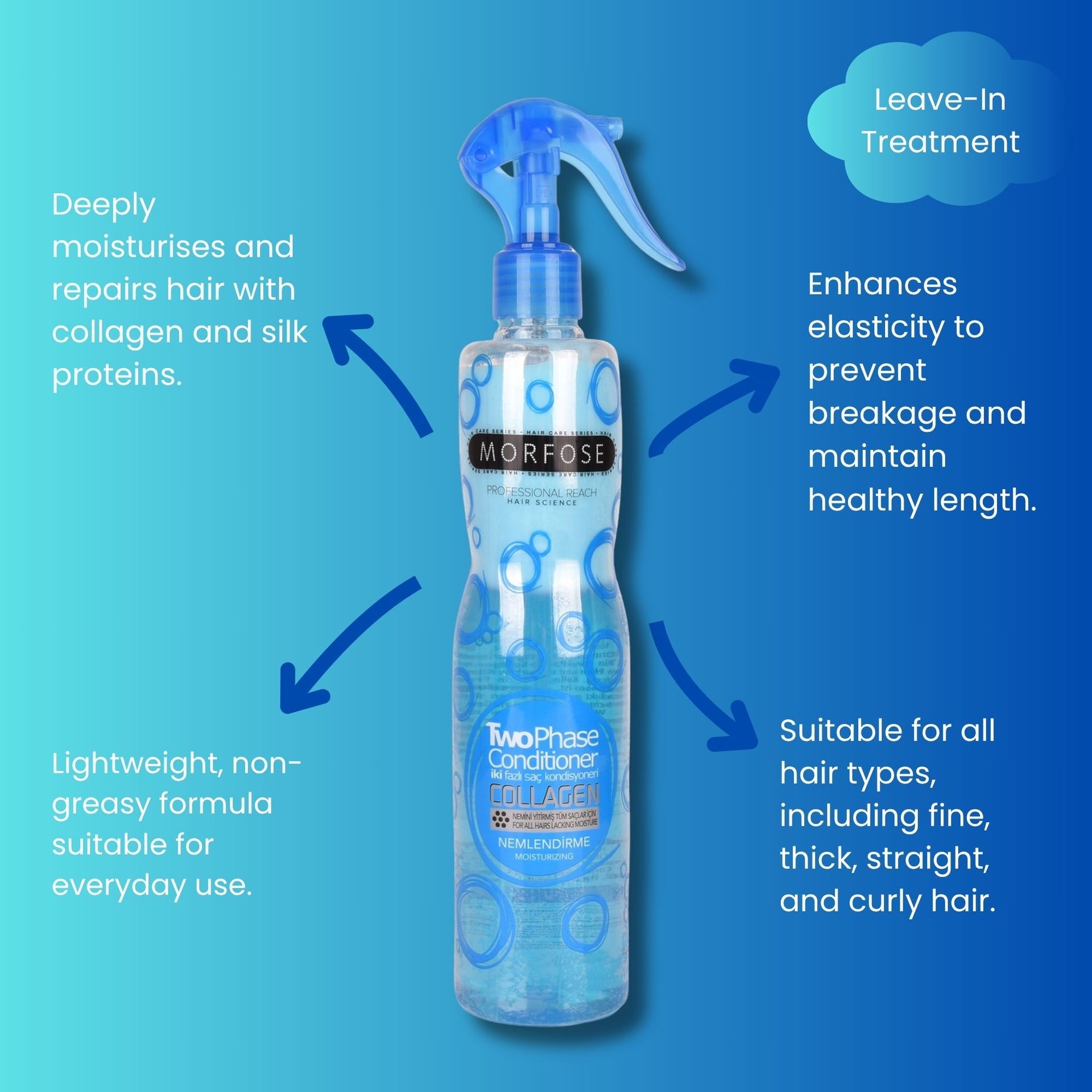 With consistent use, the Morfose - Collagen Two Phase Conditioner helps to rebuild your hair's structure, providing long-lasting hydration and resilience. It smooths the hair's texture to tame frizz, leaving you with beautifully soft and manageable hair that is easy to style. Revitalise your locks and enjoy the confidence that comes with healthy, protected, and beautiful hair. It is the perfect solution for soft, strong, and wonderfully revitalised hair.