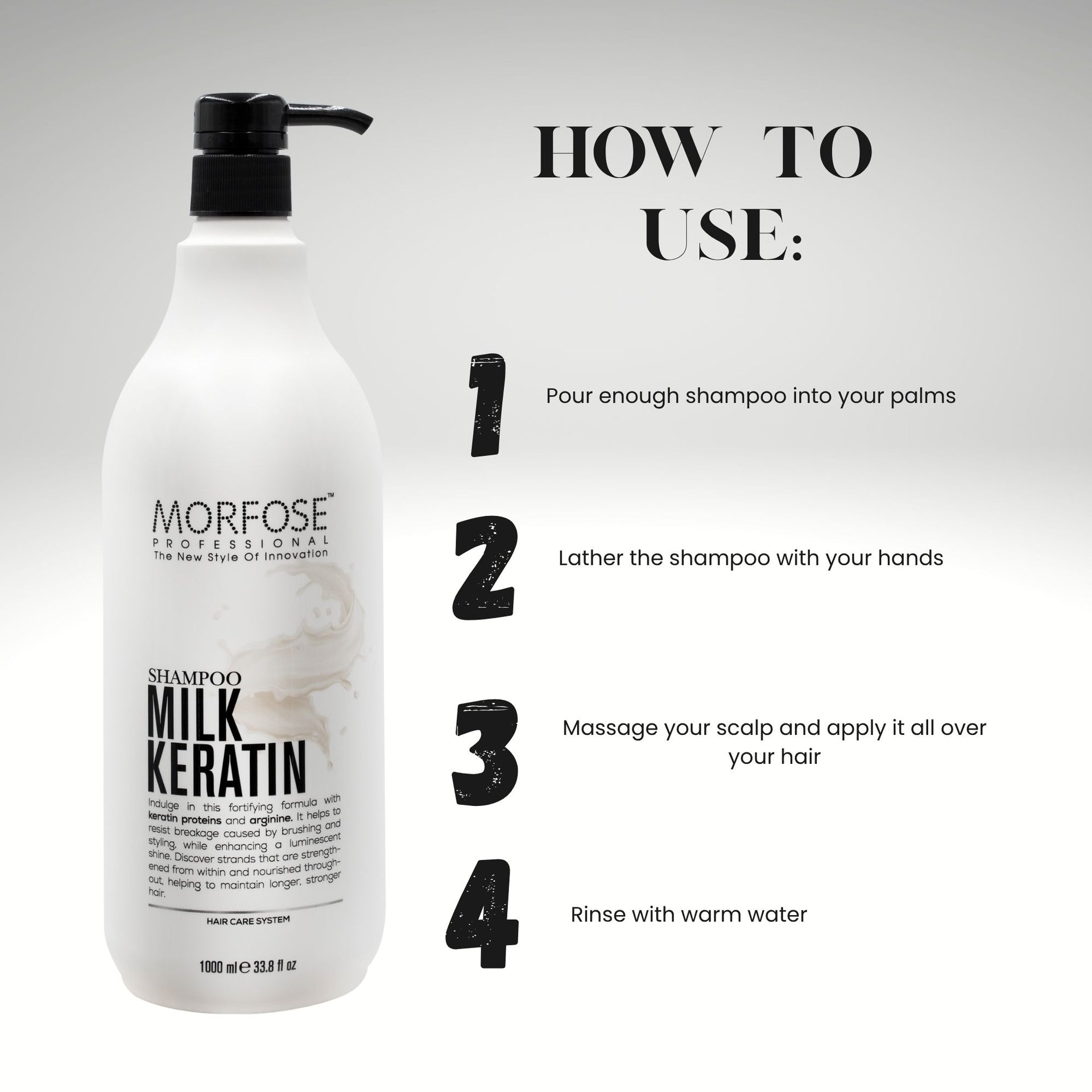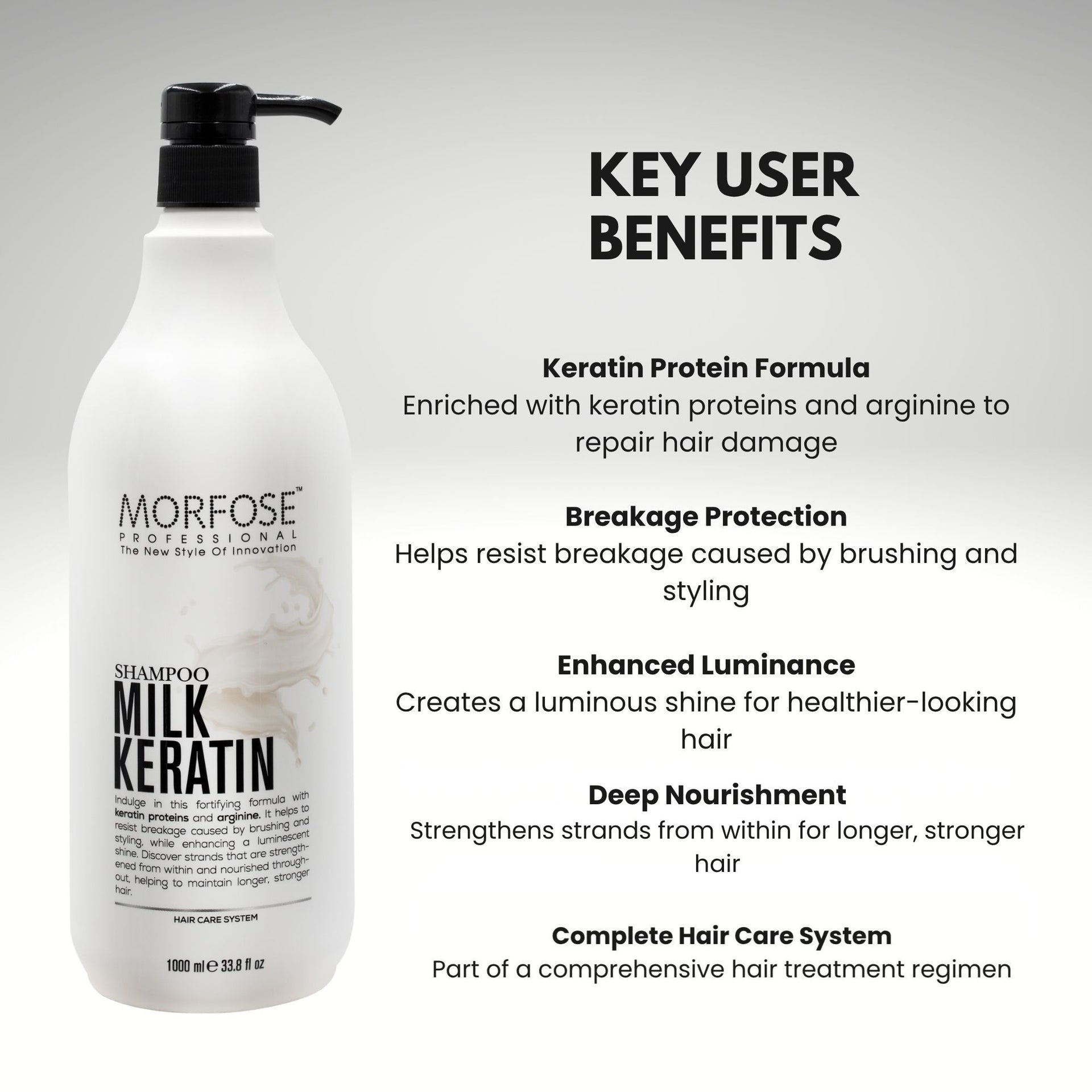 The Morfose - Milk Keratin Shampoo 1000ml helps to maintain longer, stronger hair by actively reducing breakage and nourishing the hair from root to tip. With regular use, it works to create an enhanced, luminous shine for a fuller and healthier-looking appearance. Supplied in a professional salon-size bottle, it offers excellent value and is suitable for daily use to continuously care for and repair your hair. It is the perfect foundation for a comprehensive hair treatment regimen.