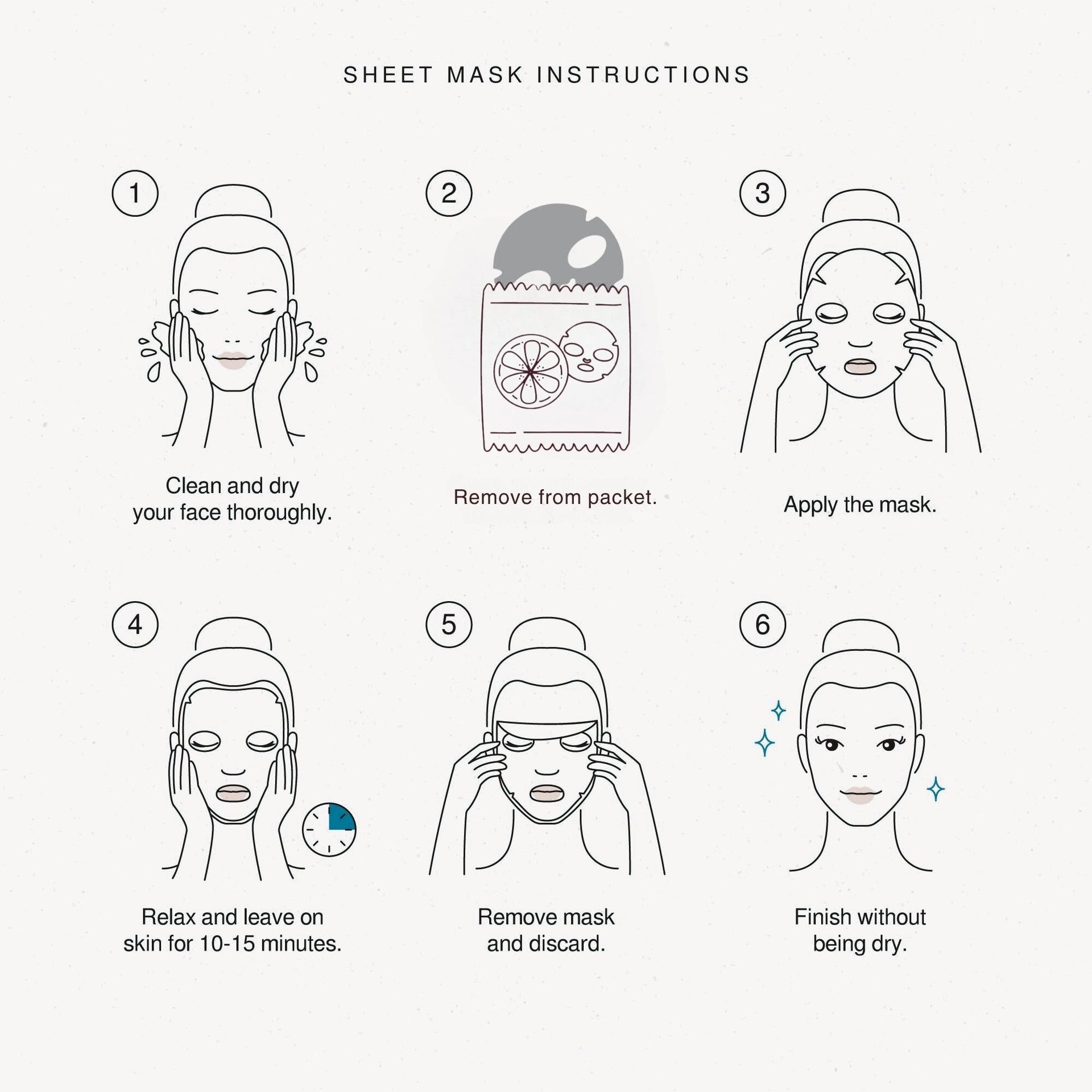 Apply the mask to a clean, dry face and leave it on for 10-20 minutes. After removing, gently massage any remaining serum into the skin until fully absorbed; no rinsing is needed.
