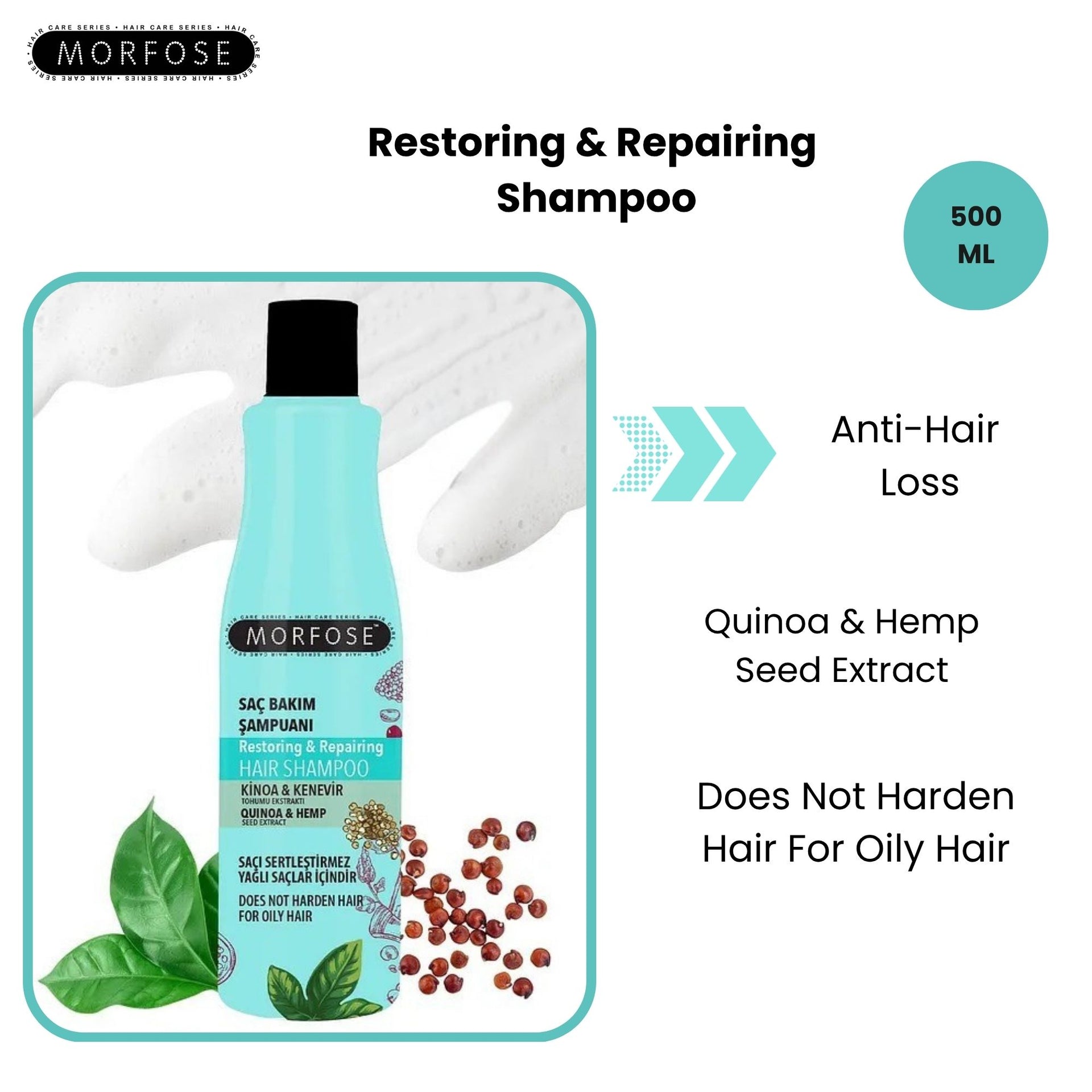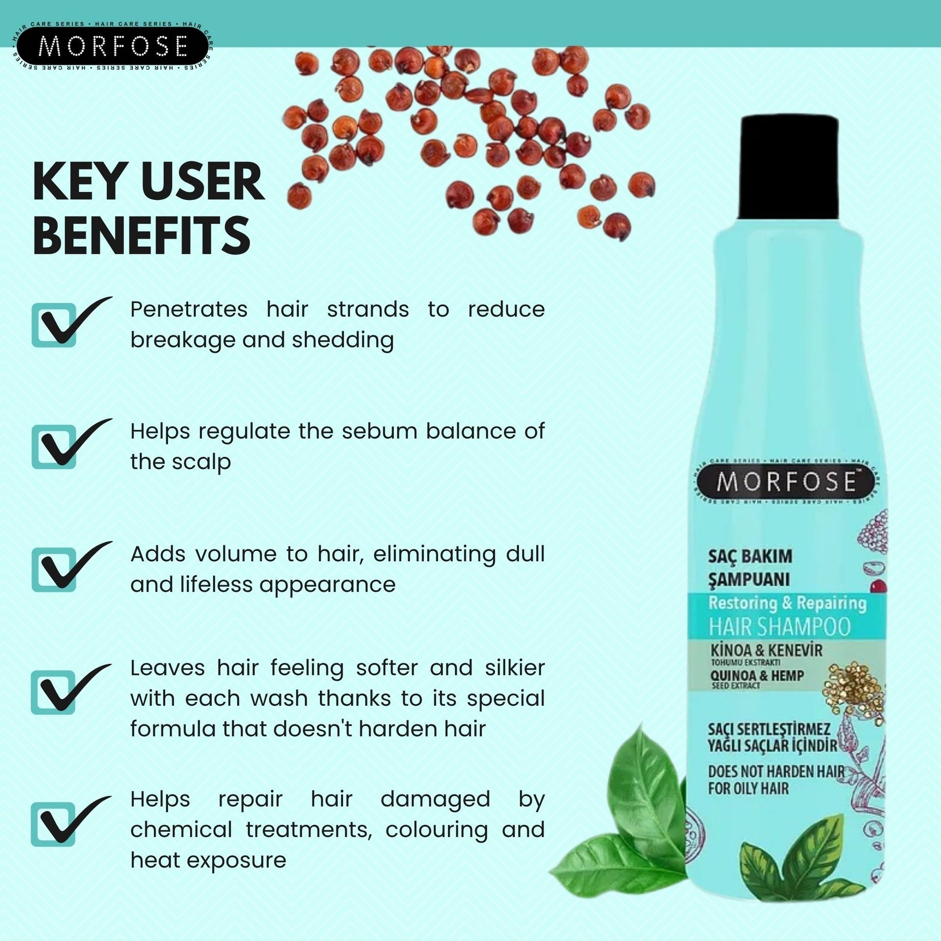 The Morfose - Quinoa & Hemp Restoring & Repairing Shampoo 500ml is a professional solution expertly designed to breathe new life into damaged, dull, and lifeless hair. Its advanced formula, enriched with nourishing Quinoa and Hemp Seed extracts, penetrates deep into the hair strands to help reduce breakage and shedding. This shampoo is specifically formulated to help repair the damage caused by chemical treatments, frequent colouring, and heat exposure. It gently cleanses while working to restore your hair's natural strength and vitality from within.