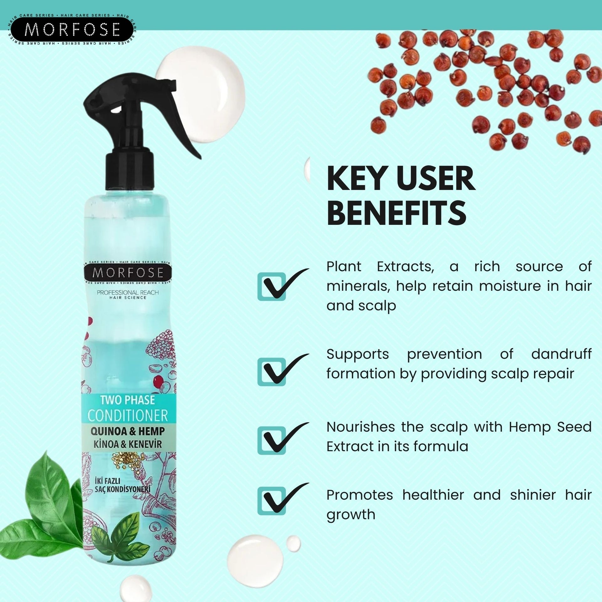 Discover the revitalising benefits of the Morfose - Quinoa & Hemp Two Phase Conditioner, an expertly formulated leave-in treatment designed to lavish your hair and scalp with essential nutrients and profound moisture. This innovative conditioner works diligently to detangle stubborn knots, soften each strand, and provide a protective shield, making daily hair management a more effortless experience. Its remarkably lightweight nature ensures that it conditions effectively without weighing the hair down, leaving your locks feeling wonderfully refreshed, airy, and looking exceptionally vibrant. The unique dual-action formula activates instantly when shaken, blending powerful ingredients that cater to the overall health of your hair.