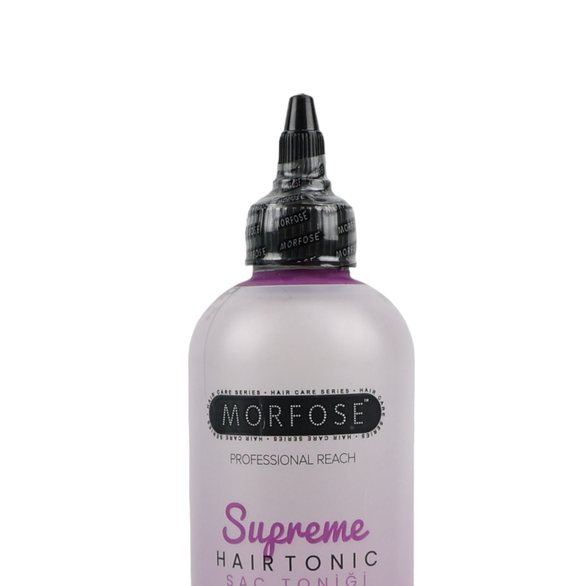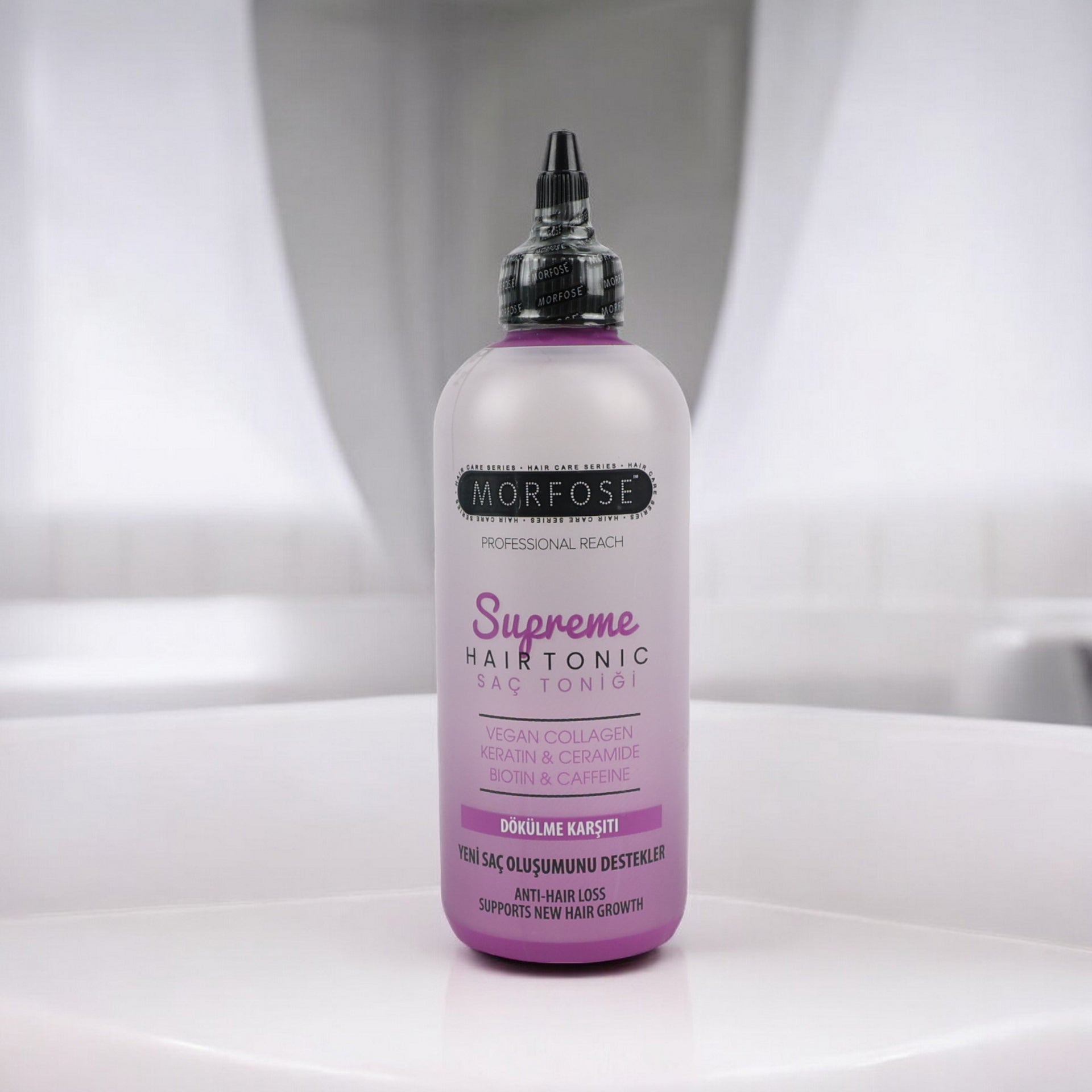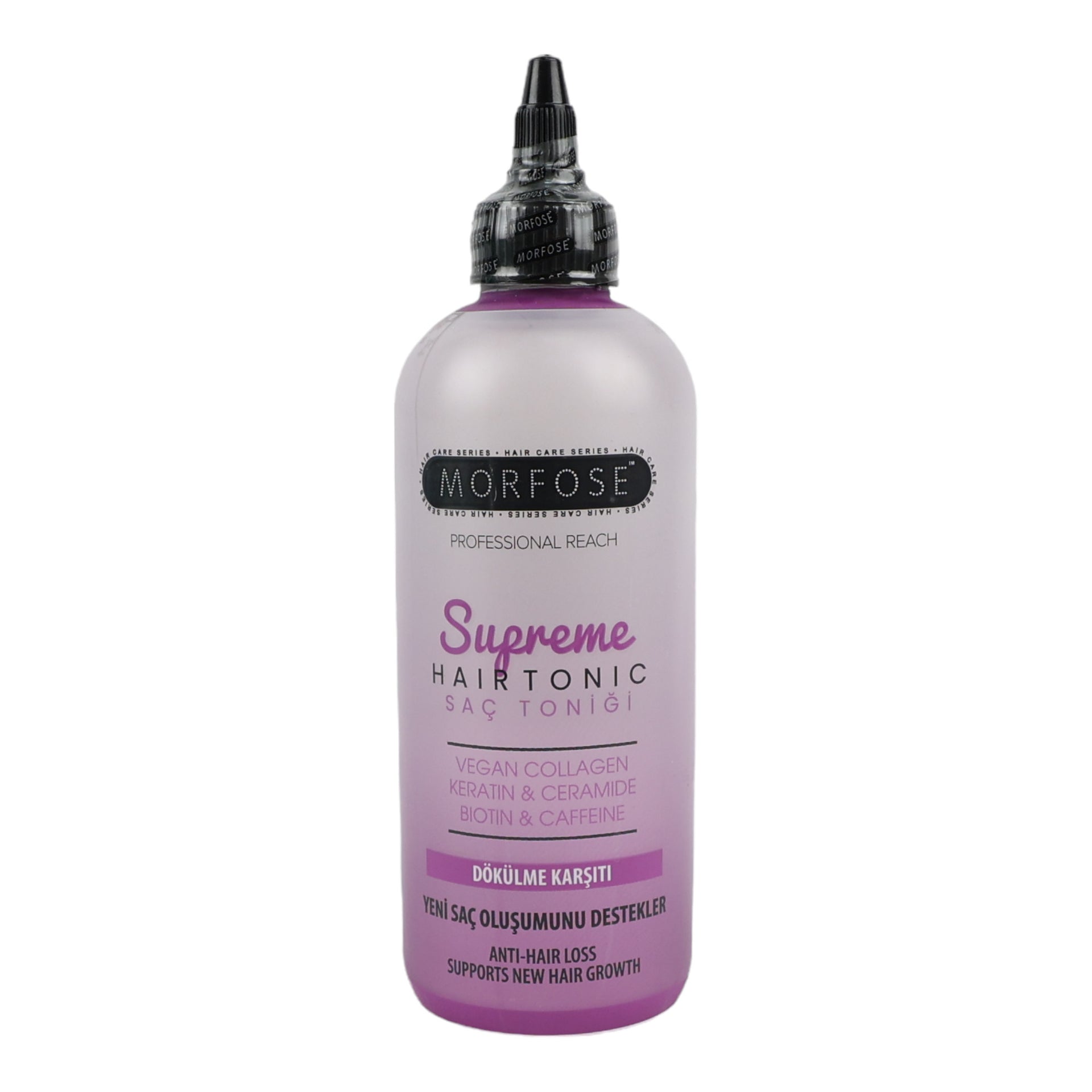The Morfose - Supreme Hair Tonic Anti-Hair Loss 300ml is a premium, advanced formula designed to actively combat hair loss and encourage the growth of healthier, stronger hair. It is enriched with a powerful blend of targeted ingredients including Collagen, Ceramide, and Biotin, which work in synergy to deeply nourish your scalp and strengthen each hair strand right from the root. The inclusion of caffeine helps to stimulate the scalp, enhancing circulation and supporting the natural growth process for thicker, fuller-looking hair. This professional tonic is your first line of defence in the fight against thinning hair.