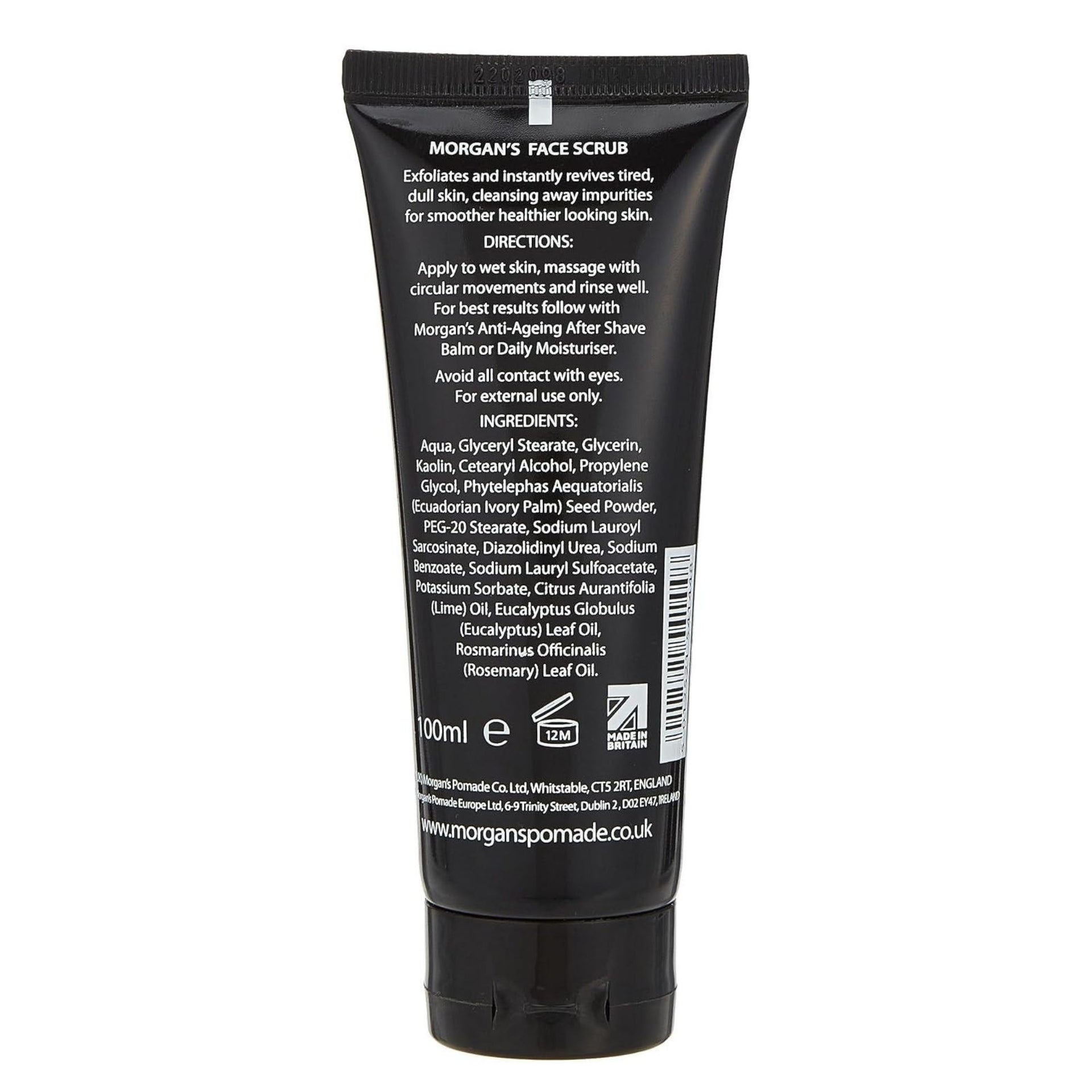 Revive tired, dull complexions with Morgan's - Exfoliating Face Scrub 100ml, the crucial second step in your daily skincare regime. This invigorating treatment is expertly formulated to exfoliate gently, removing dead skin cells and deep-seated impurities to reveal a smoother, healthier appearance. Unlike harsh synthetic alternatives, it contains no plastic microbeads, relying instead on natural exfoliants to unclog pores effectively without damaging the environment. The creamy texture glides over the skin, providing a thorough cleanse that prepares the face for closer shaving or moisturising.