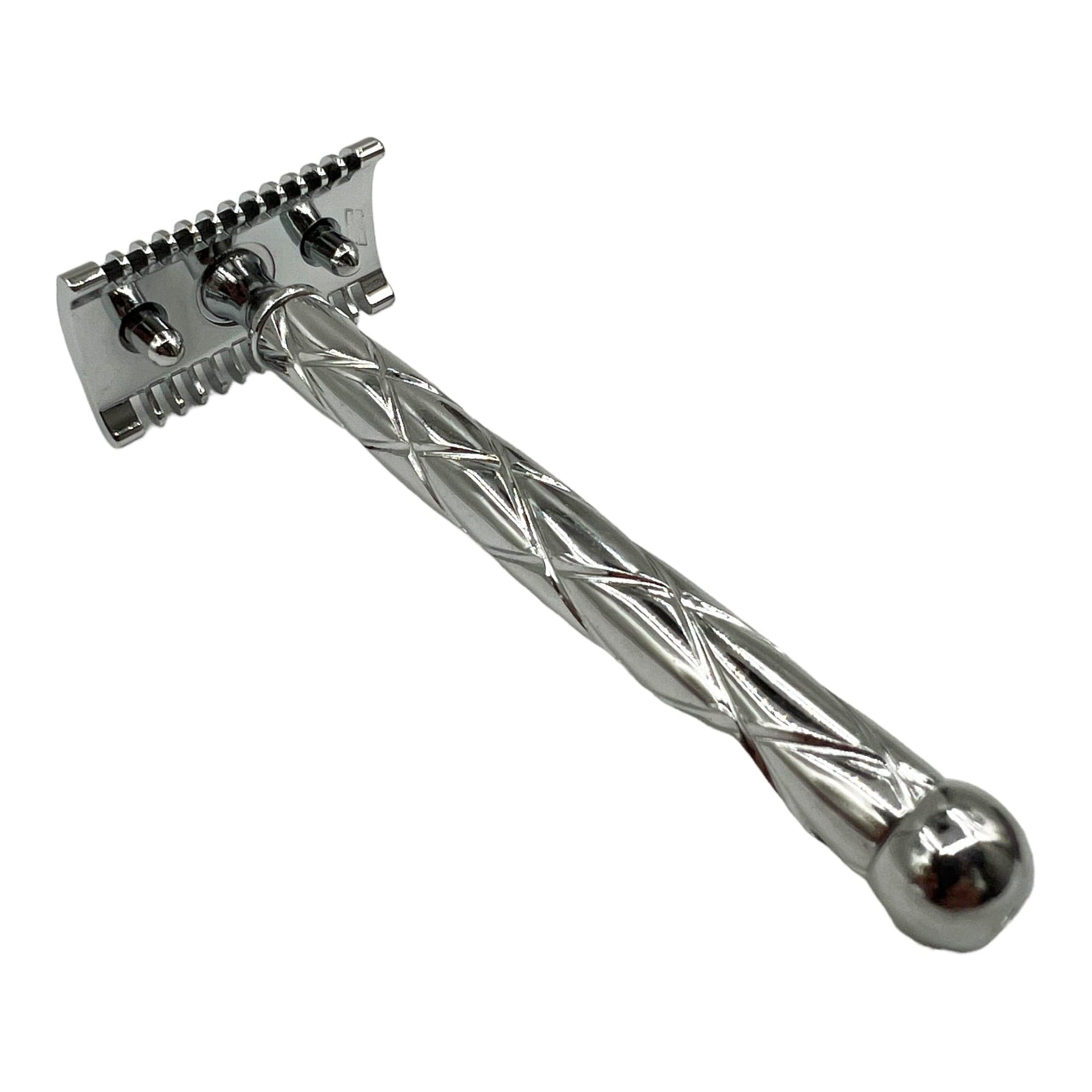 The design features sleek, polished stainless steel with distinctive, tactile diamond pattern handles, enhancing both the aesthetic and functional aspects of the razor.