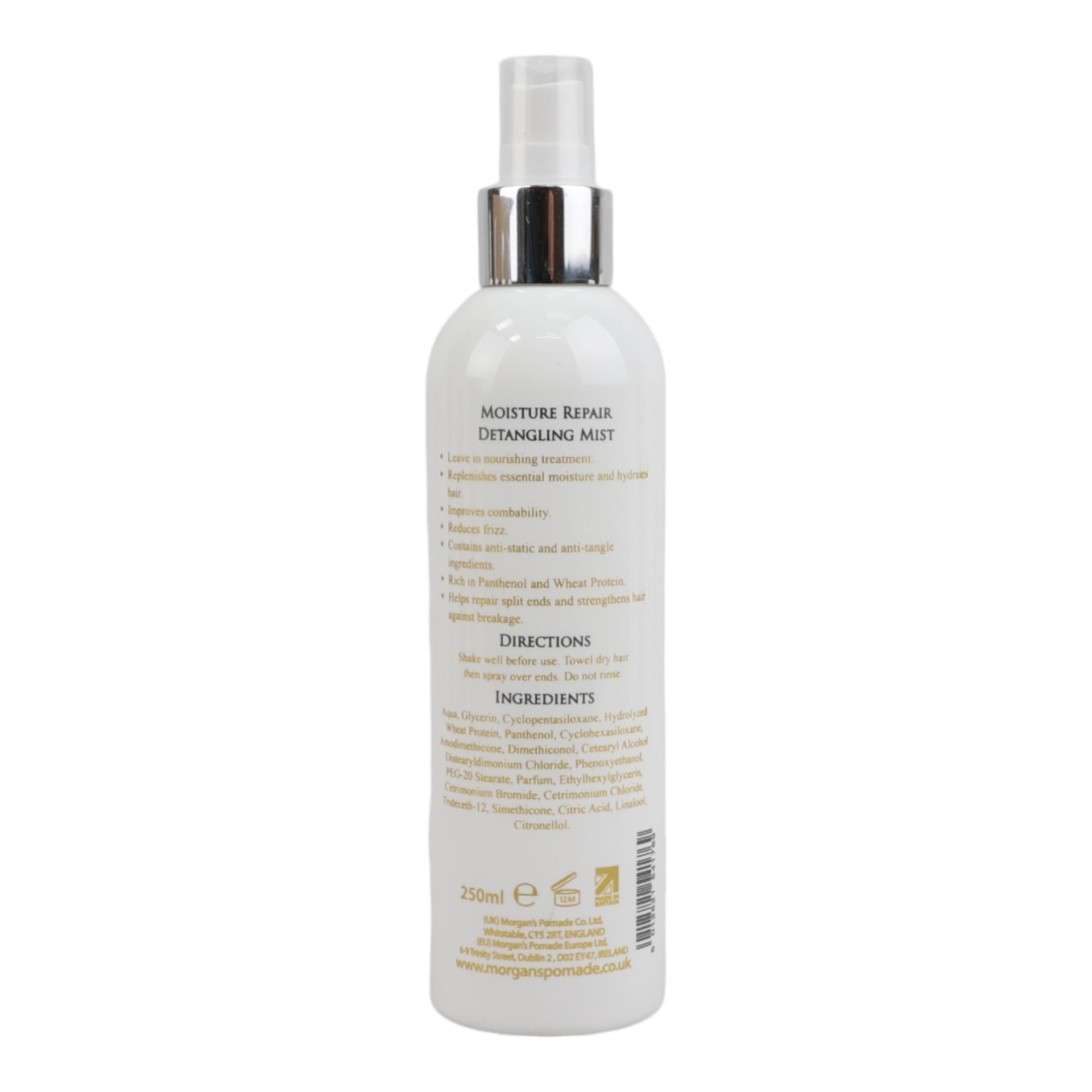 Transform your hair care routine with Morgan's Moisture Repair Detangling Mist, a lightweight yet powerful spray designed to improve combability and reduce frizz. Formulated with rich conditioning agents, this mist helps to detangle even the most stubborn knots, leaving your hair soft, smooth, and easier to manage. Infused with Panthenol and Wheat Protein, it strengthens each strand, helping to repair split ends and prevent further damage. With added anti-static and anti-tangle properties, this mist ensures your hair stays sleek and manageable throughout the day.