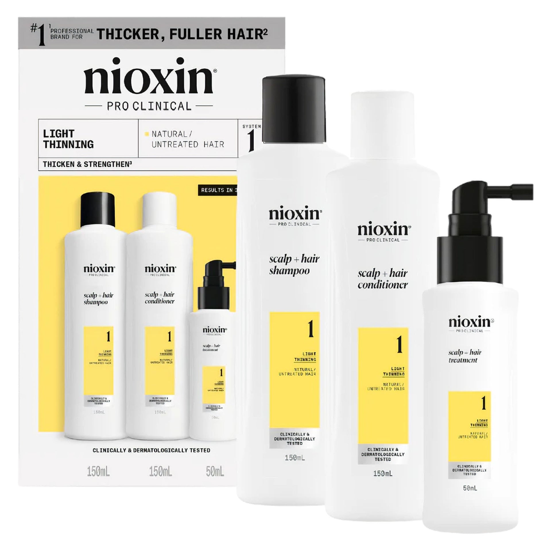 Nioxin Scalp + Hair Thickening System 1 Kit offers a comprehensive solution specifically formulated for natural, untreated hair experiencing light thinning. This professional three-step system combines scientifically advanced ingredients to create the optimal scalp environment for thicker, fuller-looking hair with visible results in just 30 days. Each component works synergistically—the Cleanser Shampoo removes follicle-clogging sebum and environmental residues, the Scalp Therapy Conditioner provides lightweight moisture whilst strengthening hair against breakage, and the Scalp & Hair Treatment delivers essential nutrients directly to the scalp and hair follicles. Unlike generic volumising products that merely coat the hair temporarily, Nioxin System 1 addresses the underlying scalp conditions that contribute to thinning, creating a foundation for healthier, more resilient hair growth with clinically proven density-building results.