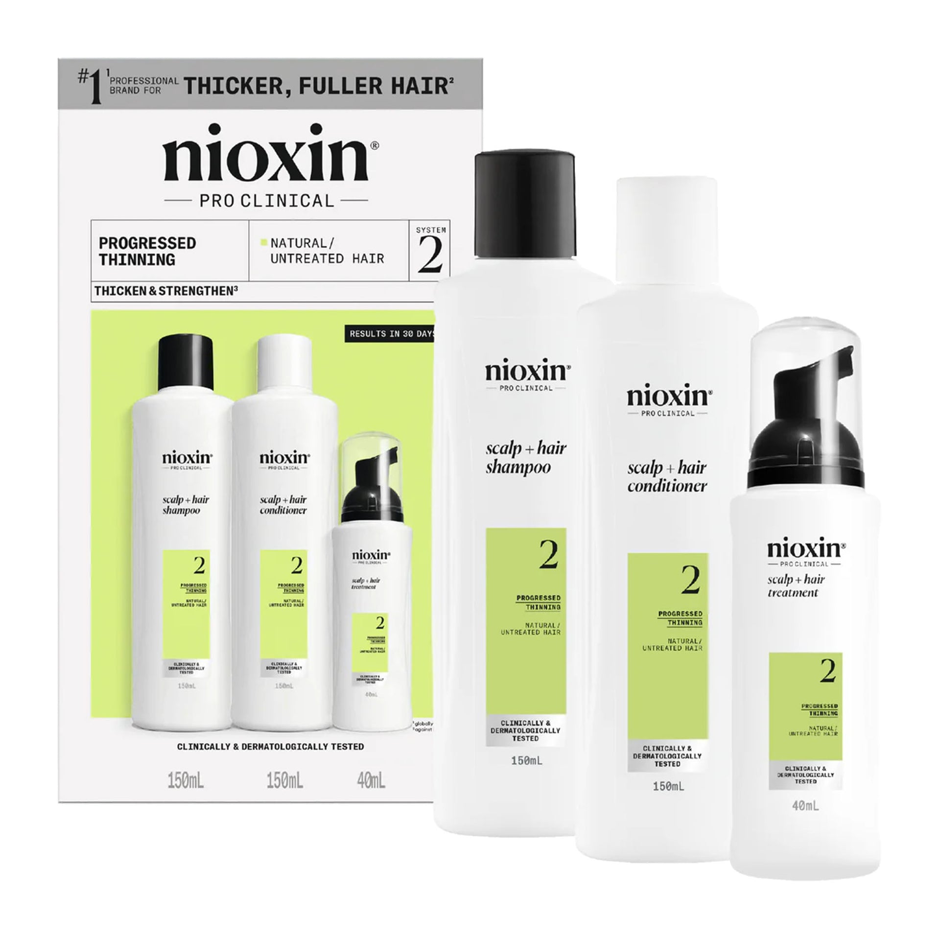 Nioxin Scalp + Hair Thickening System 2 Kit delivers professional-grade treatment specifically formulated for natural, untreated hair experiencing progressed thinning. This comprehensive three-step system combines advanced technology with potent ingredients to create the optimal scalp environment for visibly thicker, fuller hair with clinically proven results in just 30 days. Each component works synergistically—the Cleanser Shampoo deeply purifies the scalp by removing follicle-clogging sebum and environmental residues, the Scalp Therapy Conditioner provides targeted lightweight moisture whilst strengthening hair against breakage, and the Scalp & Hair Treatment delivers essential nutrients and UV protection directly to the scalp and hair follicles. Unlike temporary volumising products, Nioxin System 2 addresses the underlying scalp issues contributing to progressed thinning, creating a foundation for healthier, more resilient hair growth with measurable density-building results.