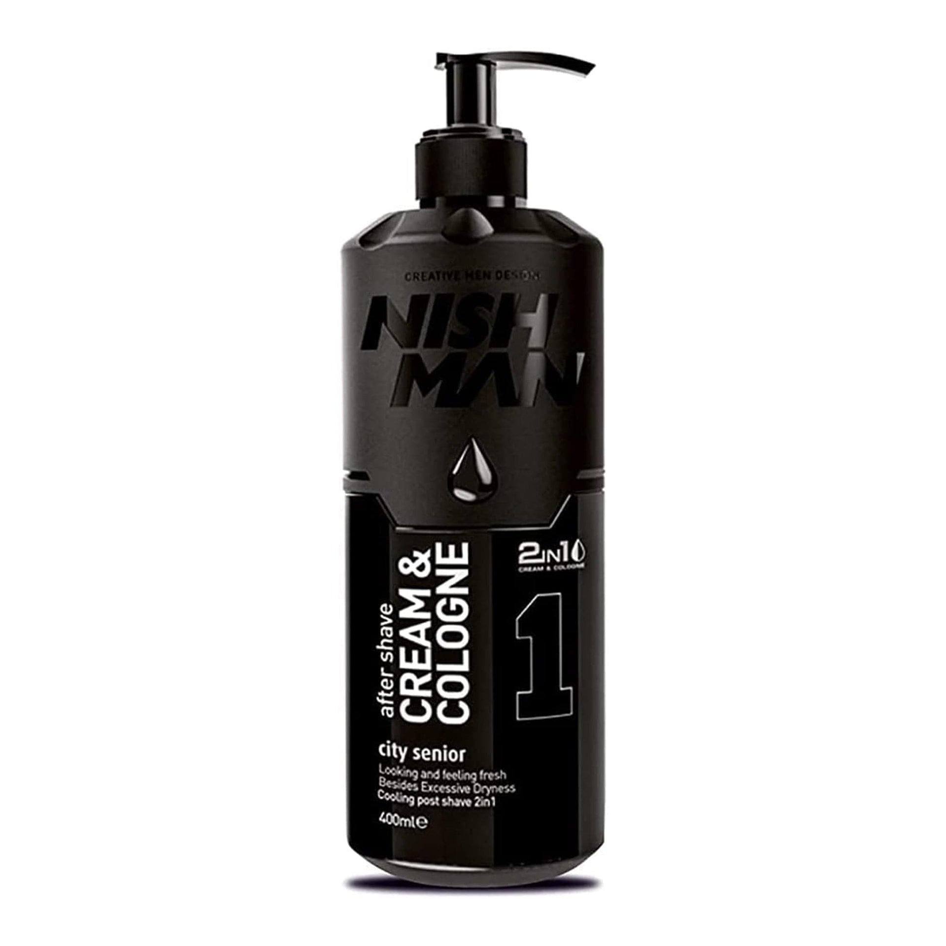 NISHMAN After Shave Cream & Cologne 2-in-1 No.1 City Senior 400ml is an essential addition to any man's shaving kit. This unique formula combines the benefits of a rich, creamy aftershave and a refreshing cologne, suitable for all skin types. The cream is quickly absorbed, reducing dryness and providing a long lasting feeling of freshness. With natural active ingredients, it protects against razor bumps, redness and inflammation, keeping your skin moisturised and protected all day long.