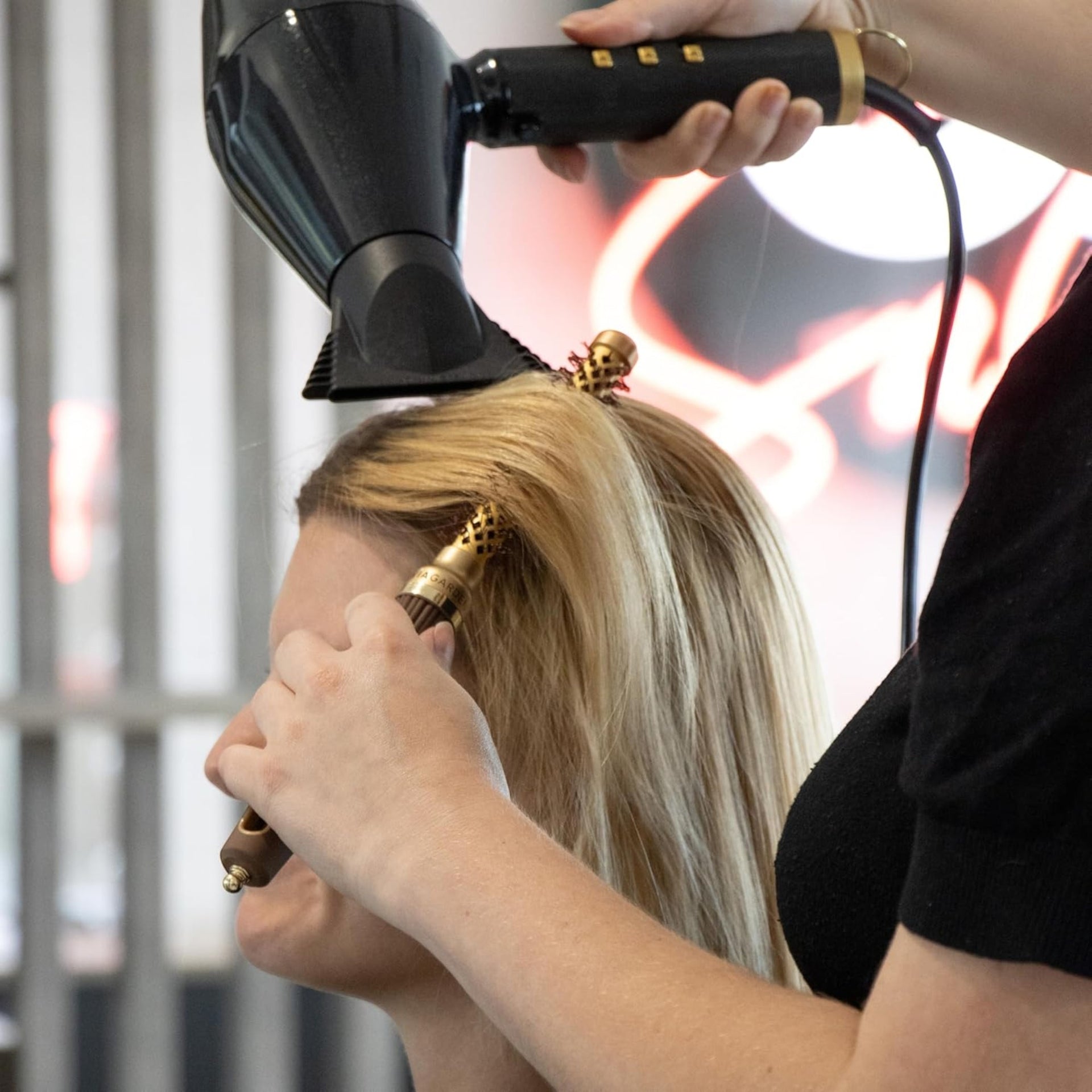 Use with a hairdryer on small sections of damp hair, rotating the brush while directing airflow down the hair shaft to smooth, curl, or add volume to short lengths and fringes.