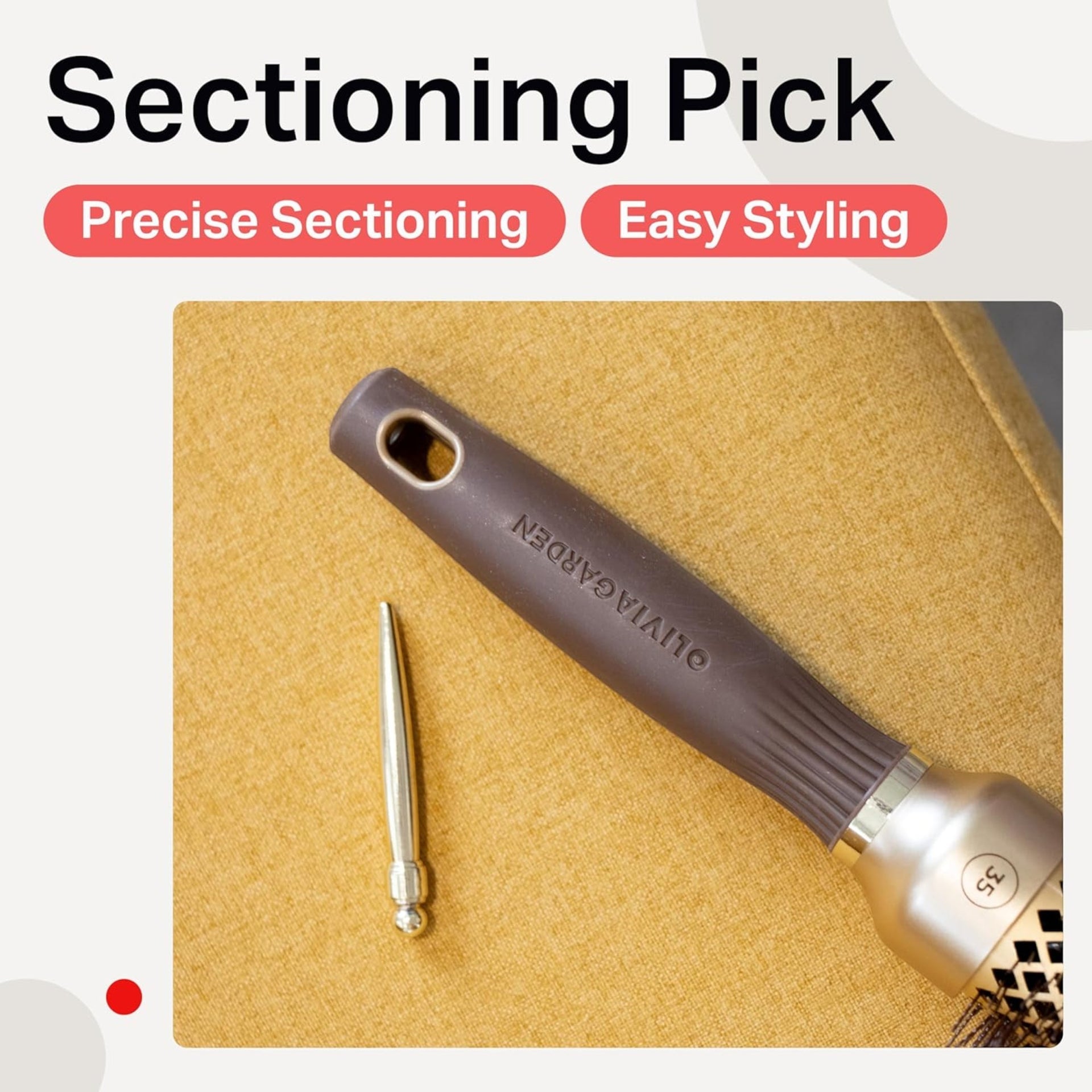 The brush barrel can become hot when used with a hairdryer; avoid direct contact with skin. Clean the brush regularly to remove hair and product build-up. Please keep the sectioning pick retracted when not in use.