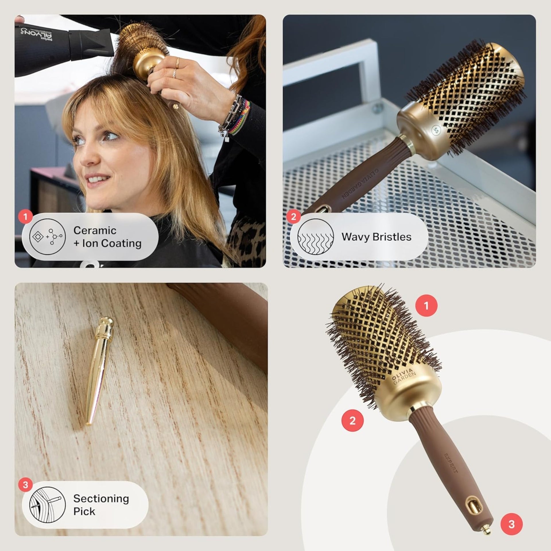 Engineered with unique wavy bristles, this brush offers superior grip and tension, ensuring complete control even when working with large sections of long hair. This feature allows you to easily create sleek, straight styles, add impressive volume, or form beautiful, large, flowing waves. Despite its size, the Olivia Garden - Expert Blowout Shine 55mm is surprisingly lightweight, featuring an ergonomic handle for comfortable, fatigue-free styling. The integrated retractable sectioning pick adds extra convenience for effortless parting. It is the definitive brush for mastering voluminous, shiny styles on long hair.