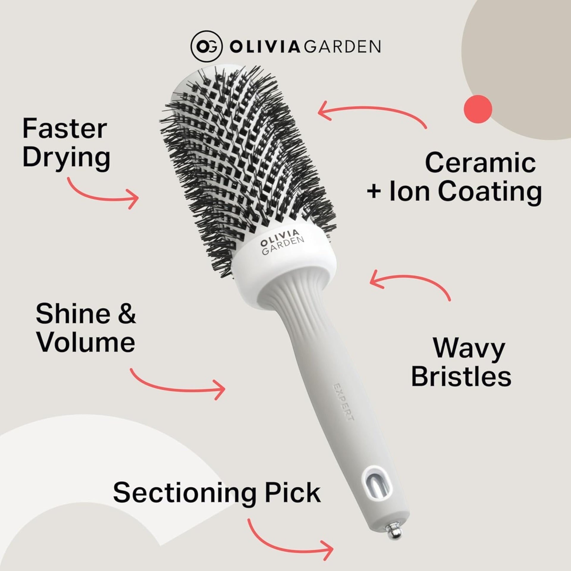 Achieve salon-quality blowouts with the Olivia Garden - Expert Blowout Shine Wavy Bristles White & Grey 45mm, a professional tool designed to deliver impeccable smoothness and volume. This brush features a technologically advanced ceramic and ion-coated barrel that ensures even heat distribution, preventing hot spots that can damage hair while significantly reducing drying time. The unique wavy bristle design provides superior tension and grip, allowing you to control the hair effortlessly for a polished, sleek finish. By releasing negative ions during styling, it actively seals the hair cuticle to lock in moisture and eliminate frizz, resulting in a lustrous, healthy shine that lasts all day.