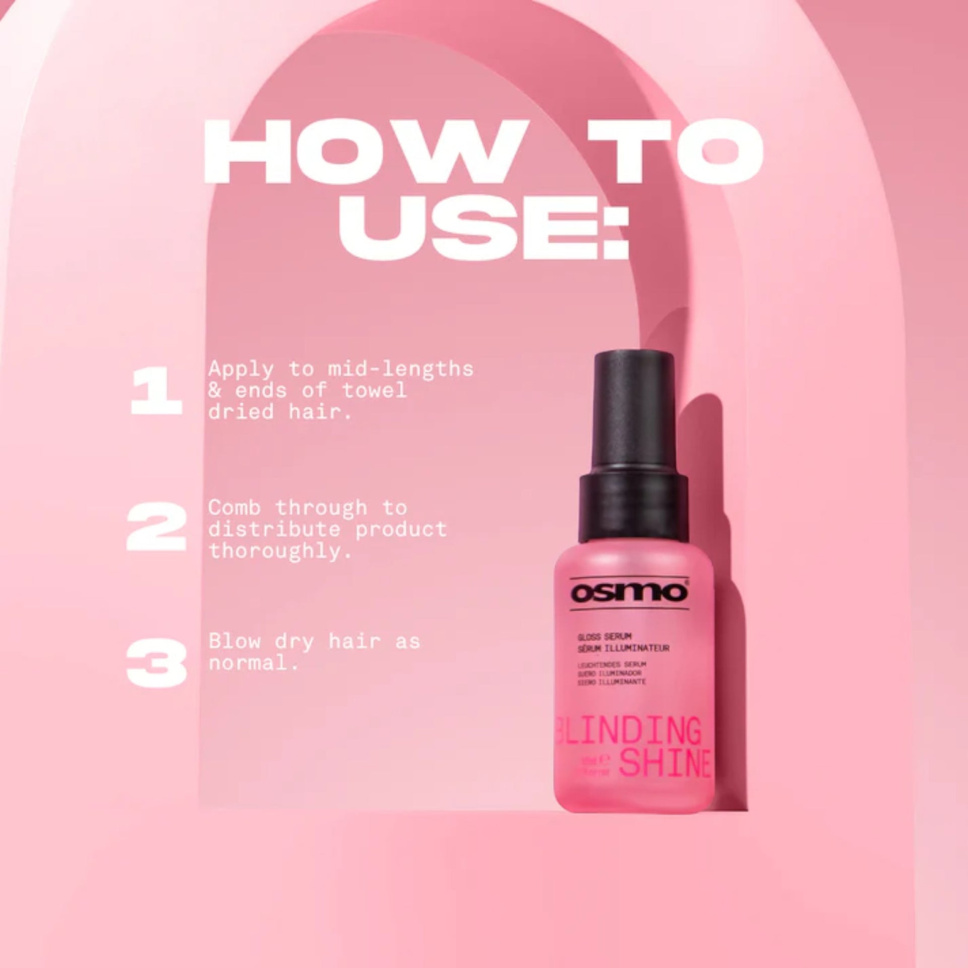 The Osmo - Blinding Shine Gloss Serum 50ml is a lightweight gloss serum designed to give your hair the ultimate shine and a flawless, frizz-free finish. Its nourishing formula, infused with Moringa Oil and protective UV filters, works to create glossy, healthy-looking hair. This serum is the perfect finishing product for taming both straight and curly hair, locking in shine and fighting off frizz with ease. The result is a stunning, glossy, mirror-shine finish that looks incredibly healthy and polished without any greasy residue.
