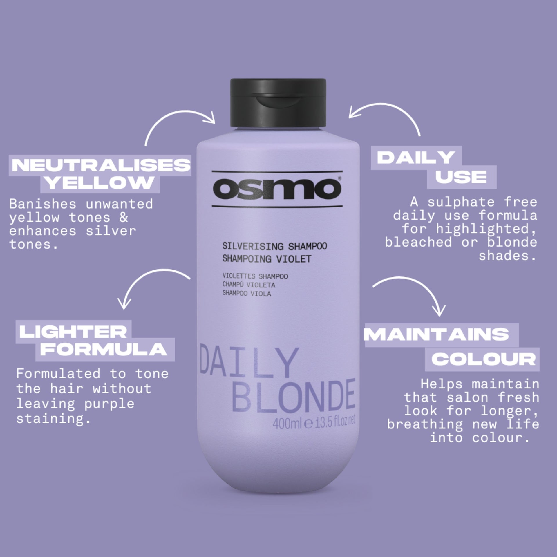 - Sulphate-free daily use formula designed to banish unwanted yellow tones.