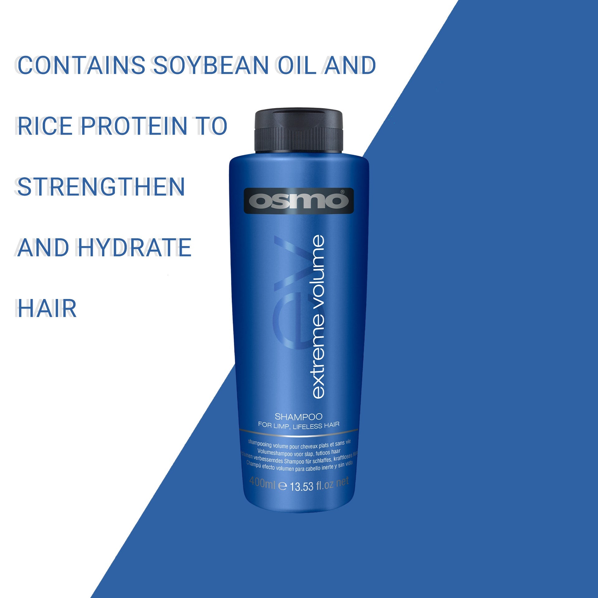 Osmo Extreme Volume Shampoo 400ml is expertly formulated to deliver incredible fullness, bounce, and shine to limp and lifeless hair. Its weightless formula gently cleanses while providing long-lasting hydration, utilising the natural strengthening properties of Soybean Oil and Rice Protein. Designed to thicken each strand, this shampoo gives your hair a noticeably voluminous look without leaving it feeling heavy or weighed down. Whether you're looking to boost your natural texture or enhance your styling results, this shampoo is the perfect addition to your hair care routine. Completely cruelty-free, it's ideal for those who prioritise ethical beauty solutions. With regular use, you can expect thicker, more manageable hair that shines with health and vitality. Suitable for all hair types, especially those with fine or limp hair in need of body and movement.