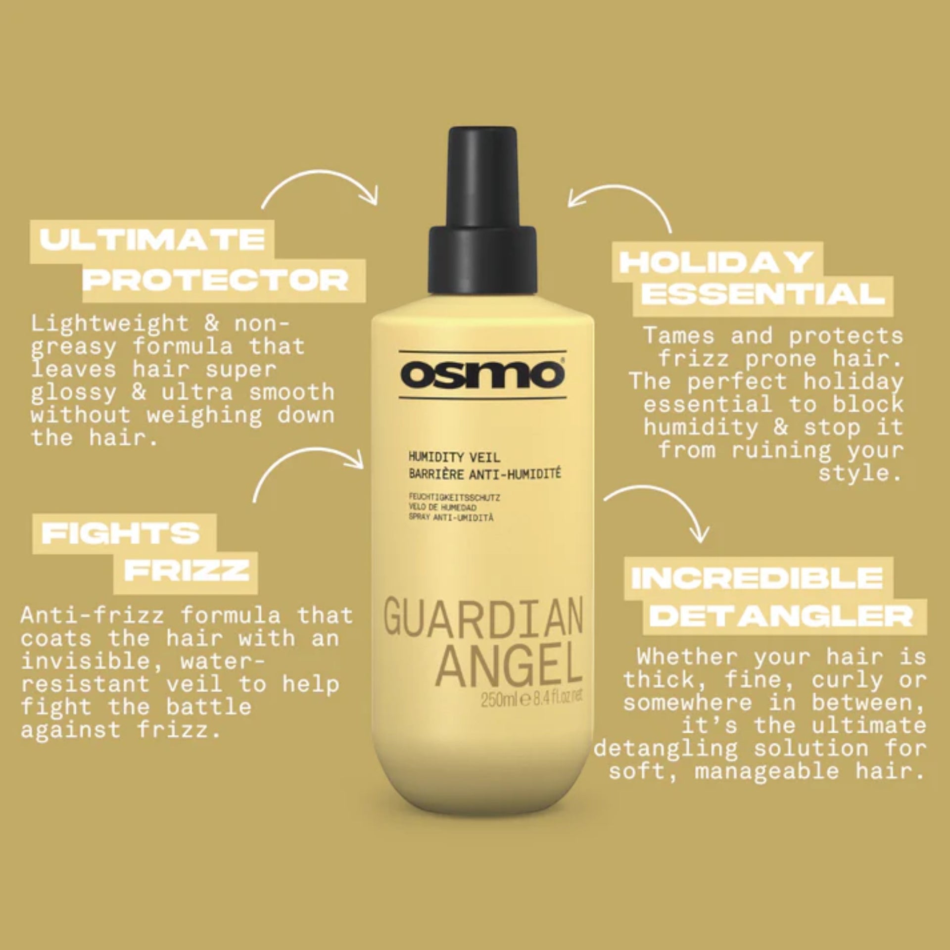 Protect your hair from the elements with this ultimate anti-humidity spray, designed to be your style's guardian angel. Its unique anti-frizz formula works by coating each hair strand with an invisible, water-resistant veil that helps to fight the battle against frizz. This lightweight and non-greasy spray is an incredible detangling solution for all hair types, whether your hair is thick, fine, or curly. It is the perfect holiday essential for taming and protecting frizz-prone hair, ensuring your style stays flawless no matter the weather.
