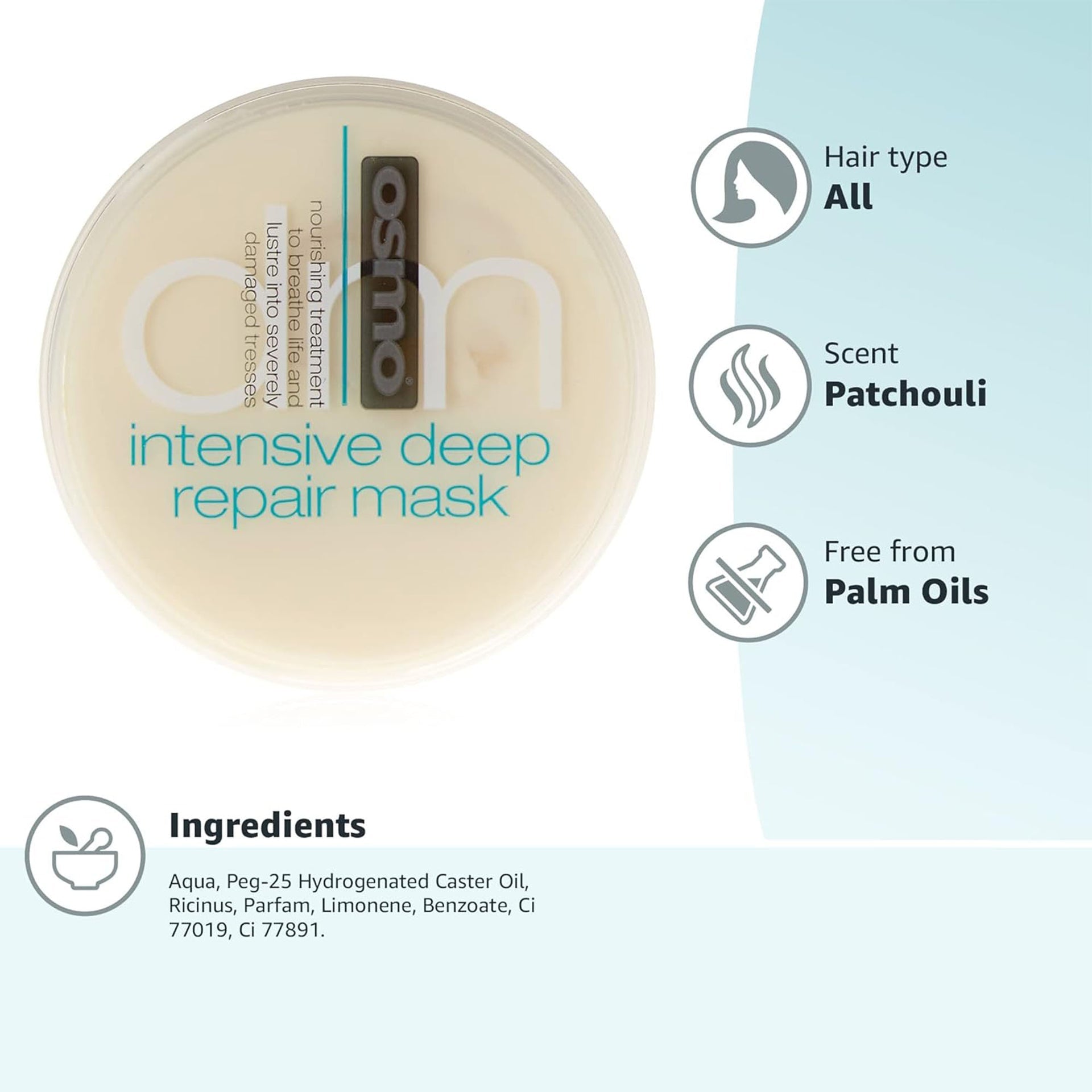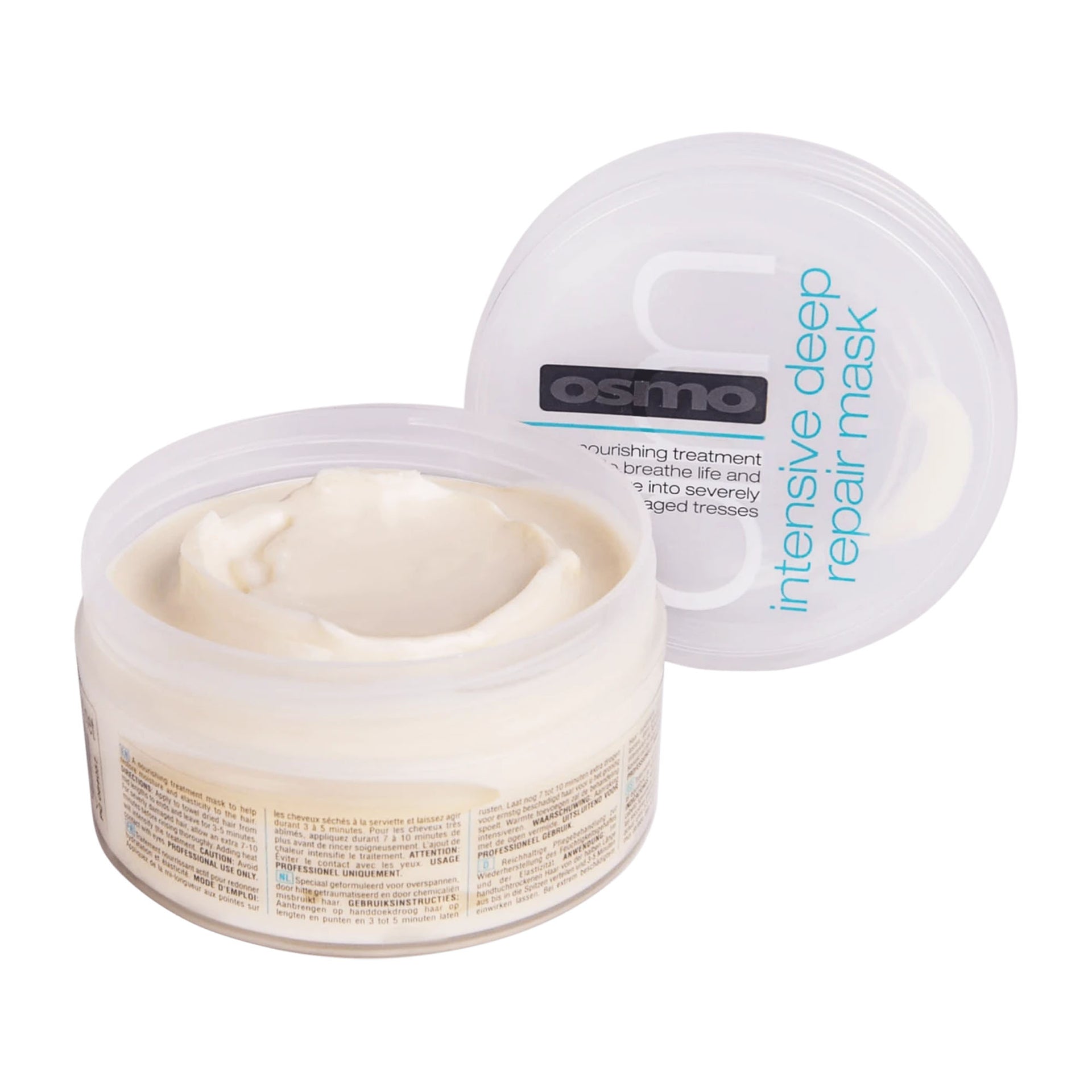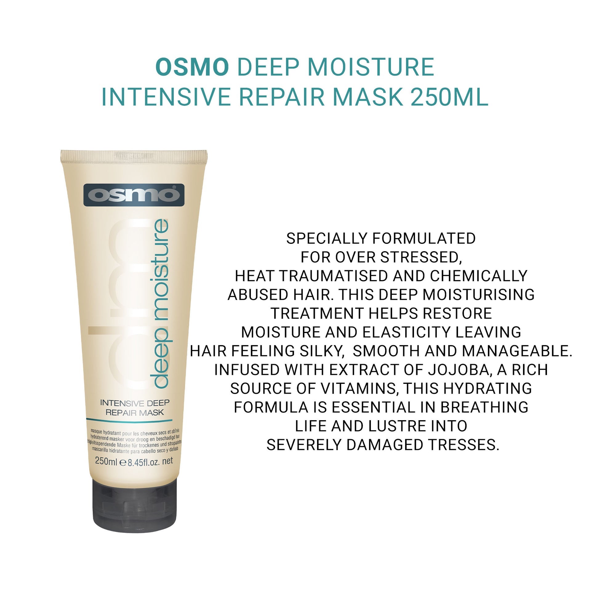 The Osmo Intensive Deep Repair Mask is a deeply moisturising treatment designed to breathe life back into over-stressed, heat-damaged, and chemically abused hair. Infused with extract of Jojoba, a rich source of essential vitamins, this hydrating formula helps restore moisture and elasticity, leaving hair silky, smooth, and manageable. Ideal for hair that has been traumatised by heat styling or chemical treatments, this intensive mask penetrates deep into the hair shaft to revitalise and repair. With every use, damaged tresses regain their lustre and strength for a healthier, more vibrant look.
