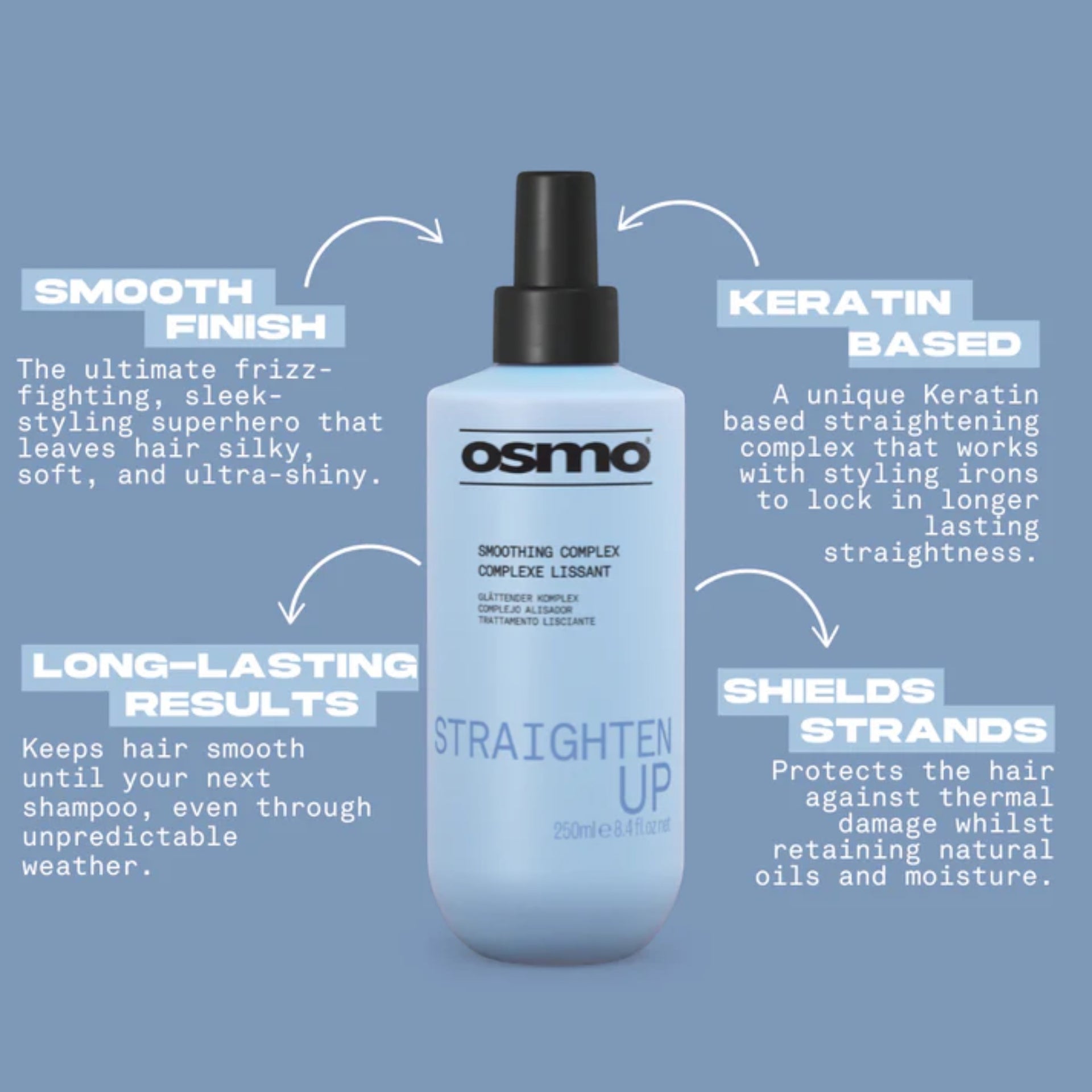 The Osmo - Straighten Up 250ml is the ultimate frizz-fighting superhero for achieving and maintaining beautifully straight, sleek styles that last. This smoothing fluid features a unique, keratin-based straightening complex that works in harmony with the heat of your styling irons to lock in a flawless, longer-lasting straightness. The advanced formula also provides an essential shield for your strands, protecting the hair from thermal damage during styling. It cleverly retains the hair's natural oils and moisture, ensuring your hair stays healthy while you style.