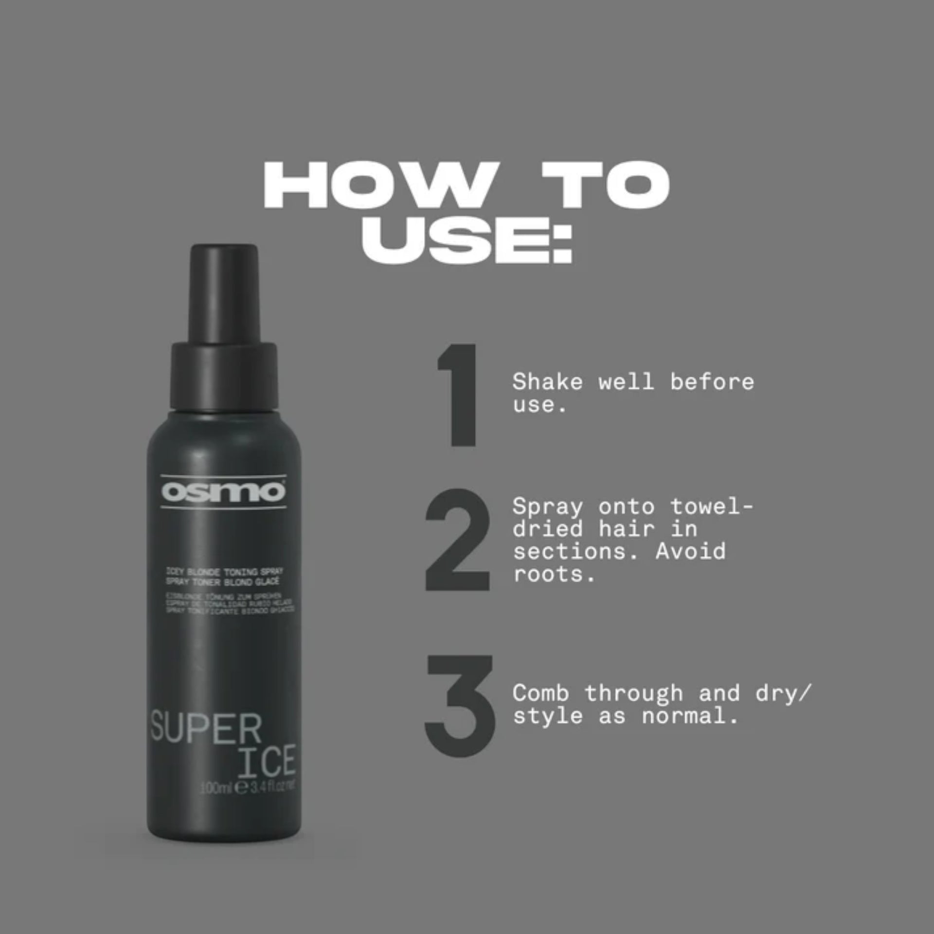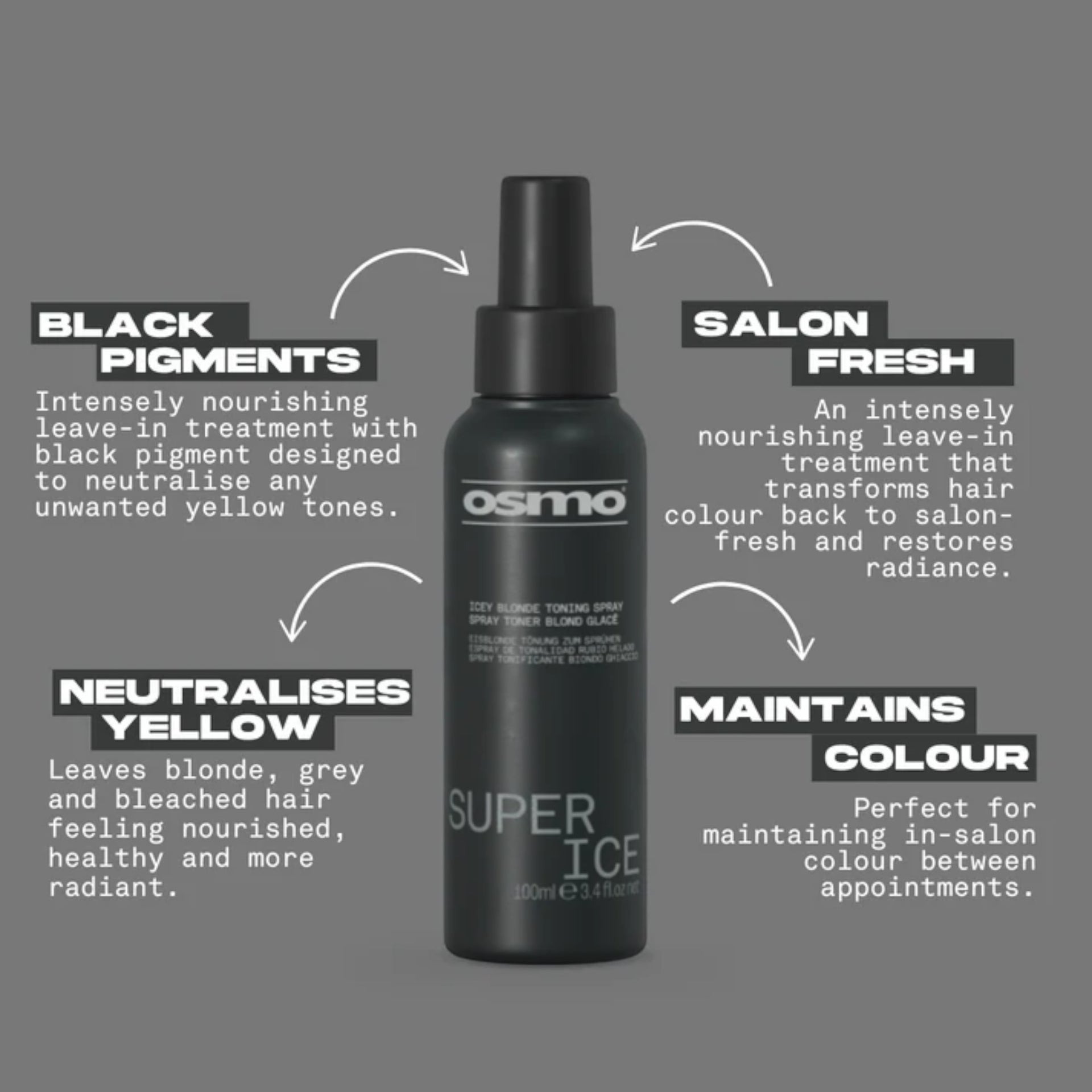 The Osmo - Super Ice Icey Blonde Toning Spray 100ml is an intensely nourishing leave-in treatment, expertly designed to neutralise unwanted yellow tones in the lightest shades of blonde, grey, and white hair. Its innovative formula is infused with powerful black pigments that work to counteract any pale, brassy tones, helping to restore a beautifully cool and radiant finish. This professional toning spray is the perfect way to maintain your in-salon colour between appointments, keeping your hair looking salon-fresh and vibrant. It transforms your colour back to its best while leaving it feeling deeply nourished and healthy.