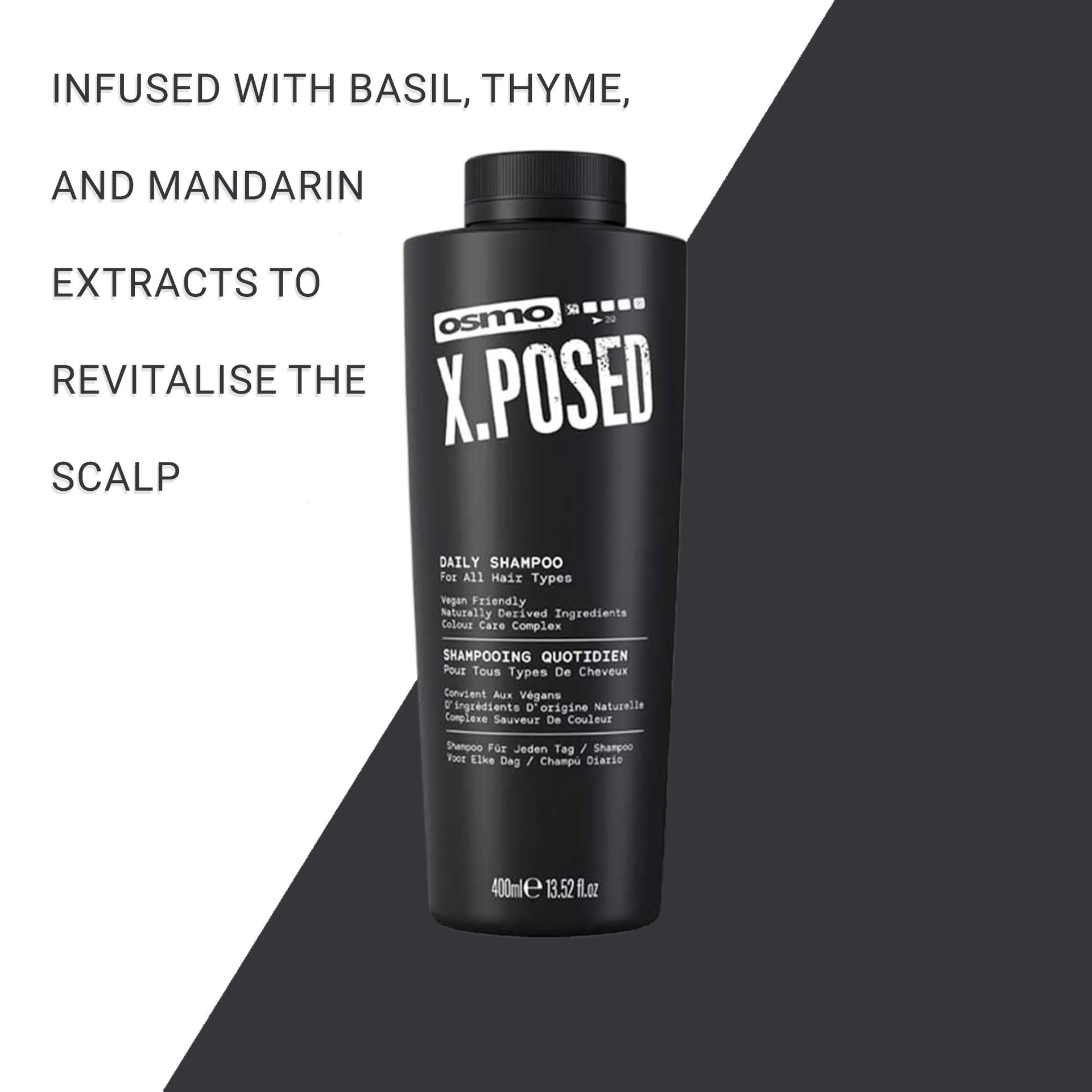 Osmo X.Posed Daily Shampoo is a gentle yet effective daily cleanser, formulated with 91% naturally derived ingredients, including Basil, Thyme, and Mandarin extracts. This refreshing shampoo helps to stimulate and revitalise the scalp, while promoting shine and vitality in your hair. With its invigorating citrus fragrance, it energises your hair day after day, leaving it feeling clean, fresh, and full of life. Perfect for those seeking a natural, eco-conscious hair care solution, this vegan-friendly shampoo is free from sulphates and parabens, ensuring it’s kind to both your hair and the environment. The formula works to maintain the natural balance of your scalp, providing hydration without any harsh chemicals. Available in both 400ml and 1000ml sizes, it’s ideal for daily use and suitable for all hair types. Whether you're looking to cleanse, refresh, or simply maintain healthy hair, this shampoo delivers outstanding results with every wash.