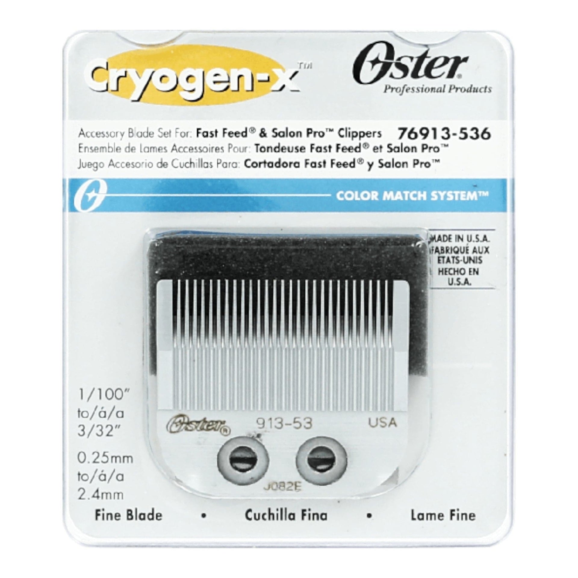 The Oster 76913-536 Cryogen-X Fine Blade is expertly designed to fit Oster Fast Feed and Salon Pro clippers, offering a cutting range from 0.25mm (1/100 inch) to 2.4mm (3/32 inch). Featuring a 25 tooth upper blade, this fine blade provides a close to medium length cut with exceptional precision. The Cryogen-X technology used in these blades freezes the steel to -150°C, resulting in significantly longer wear life and sustained sharpness for consistent quality performance.