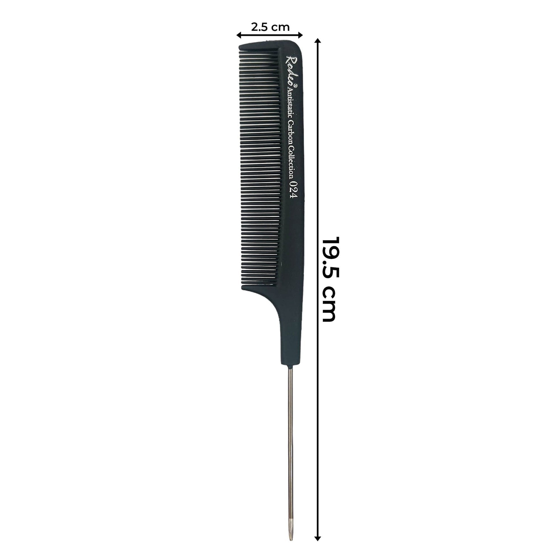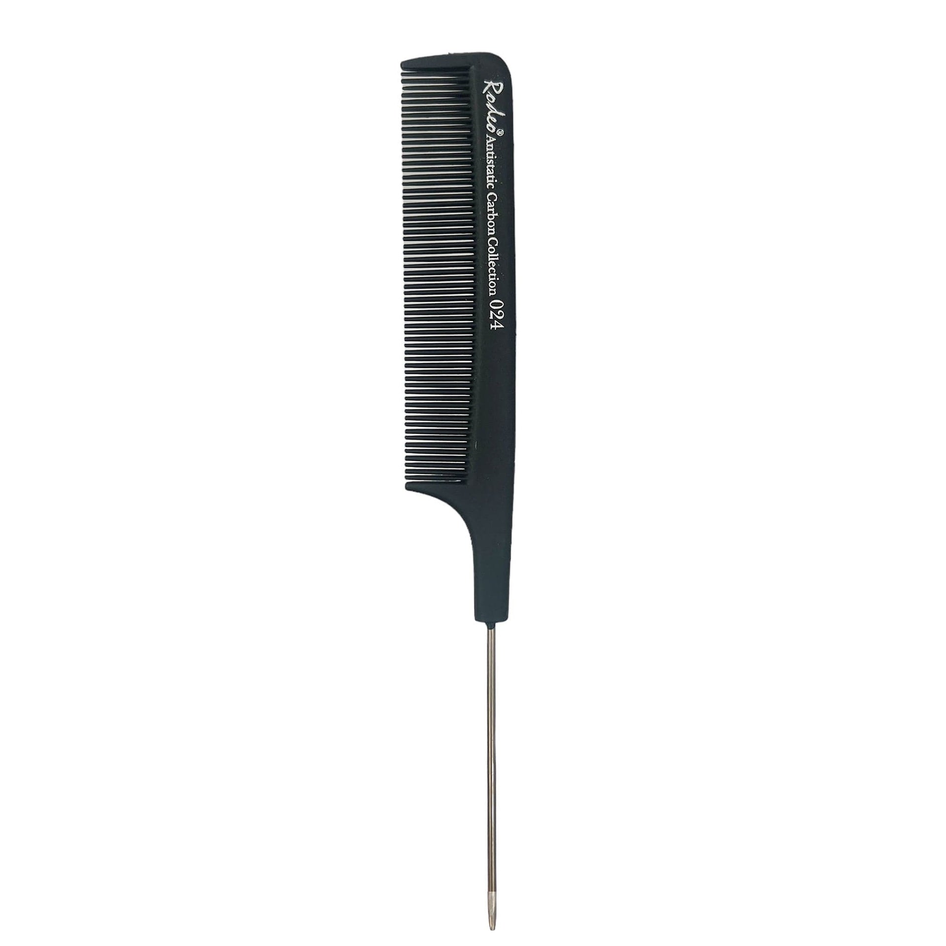 The Rodeo - Pin Tail Comb Fine Tooth collection offers professional-grade tools meticulously crafted from high-quality anti-static carbon for ultimate precision and durability. This premium material ensures the combs are both heat-resistant and flexible yet strong, making them ideal for use with heat styling tools in a busy salon environment. The fine teeth are designed to glide through the hair, maintaining moisture to enhance shine and softness for a smooth, silky result. The comb's anti-static properties help to prevent flyaways and frizz, giving you superior control during styling.