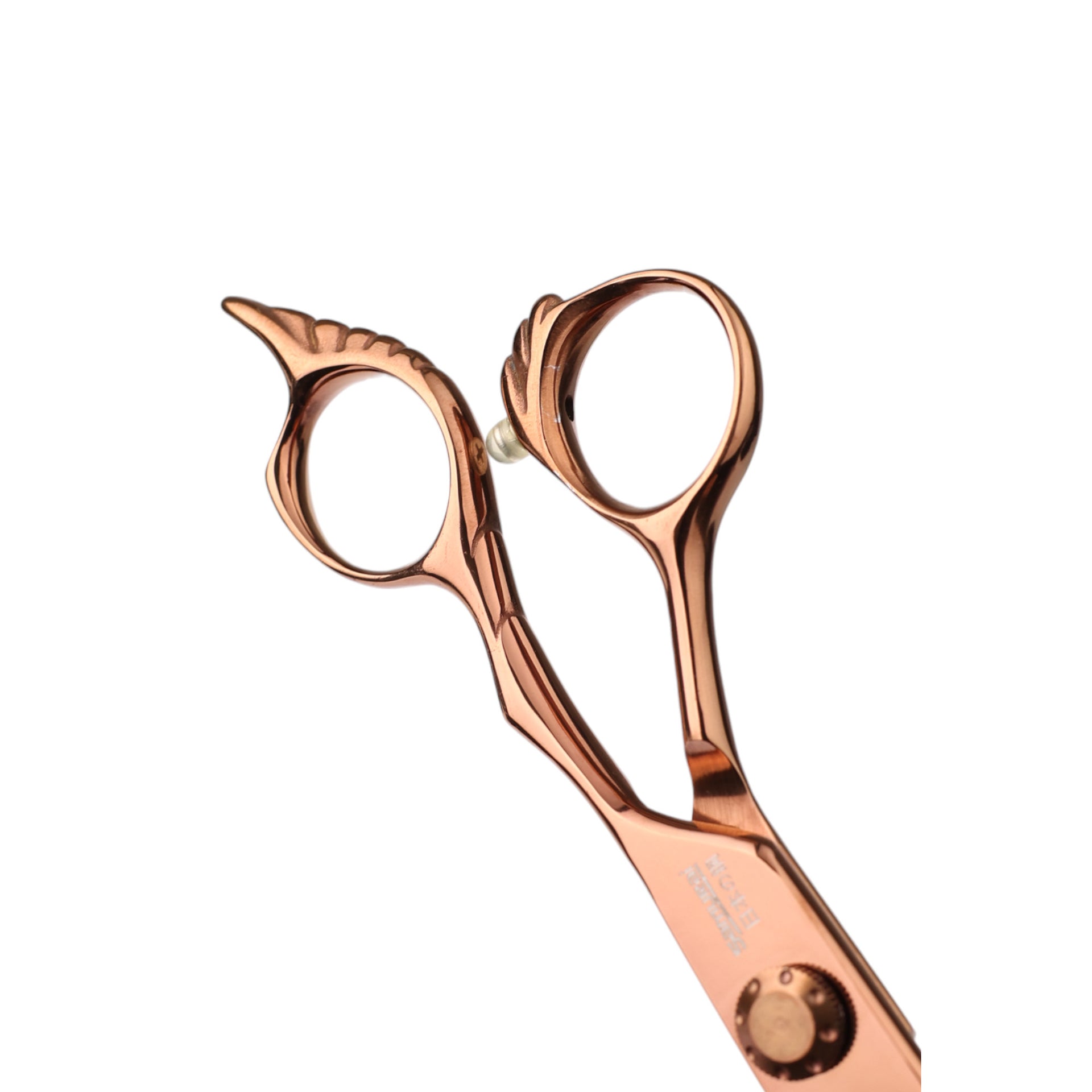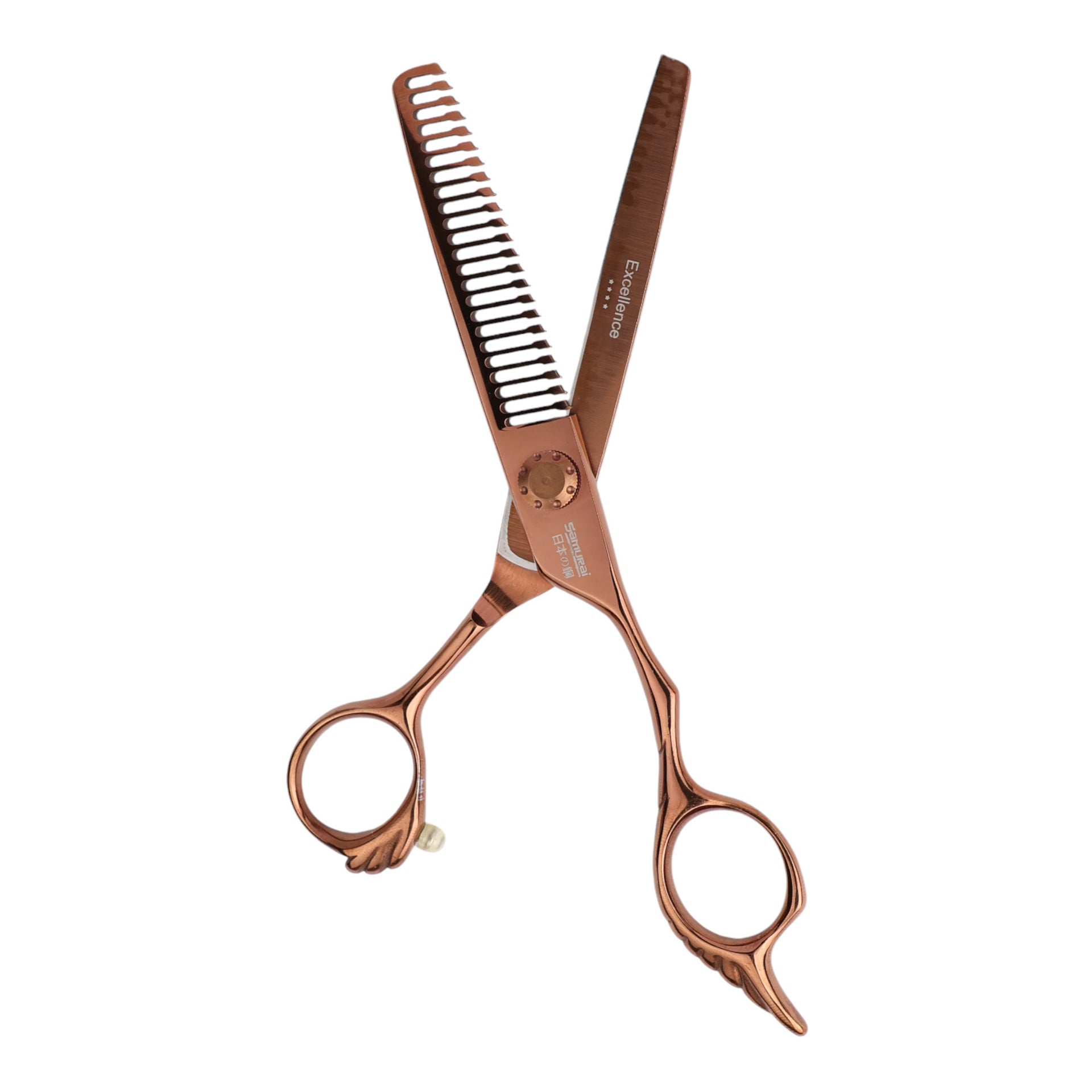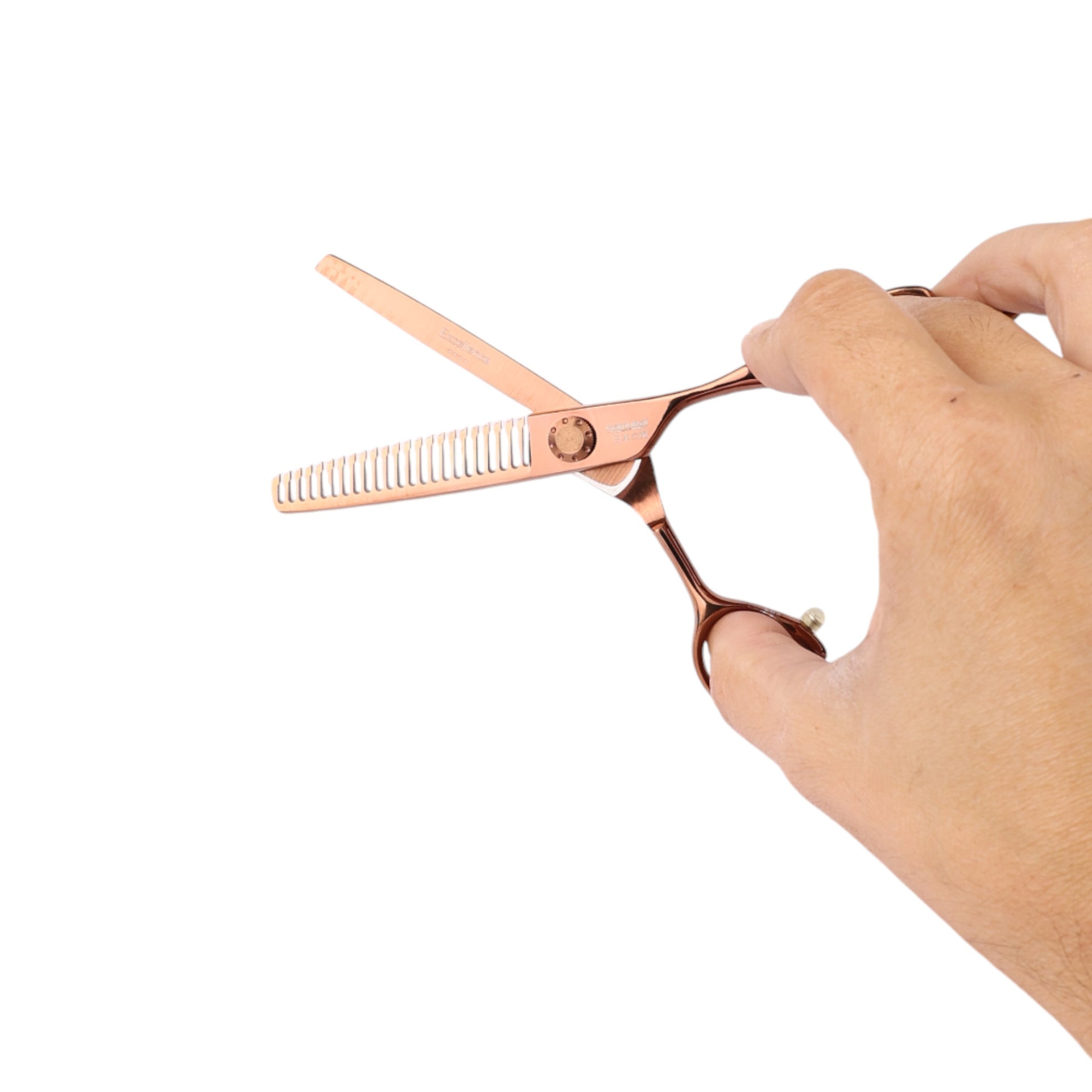 These Samurai Rose Gold Thinning Scissors are lightweight and well-balanced, offering excellent control for precision cutting on both wet and dry hair. Whether you're working on fine details or general thinning, these scissors allow for smooth and effortless cuts, ensuring professional results every time. The offset handle design provides an ergonomic advantage, reducing strain on the wrist and fingers. Ideal for both experienced stylists and those starting their hairdressing journey, these scissors are a must-have addition to any professional toolkit.