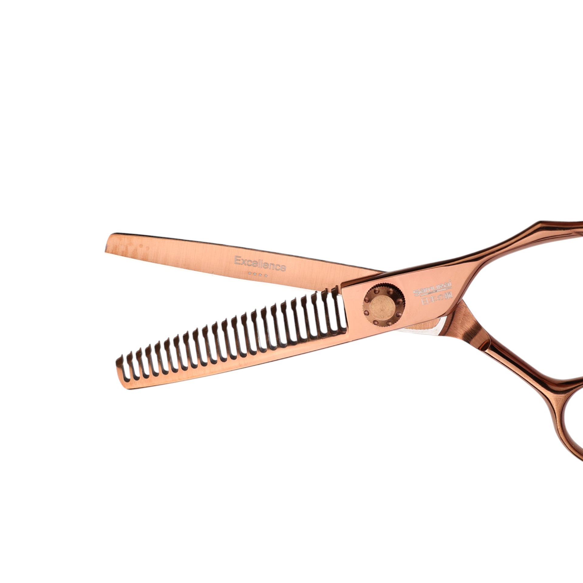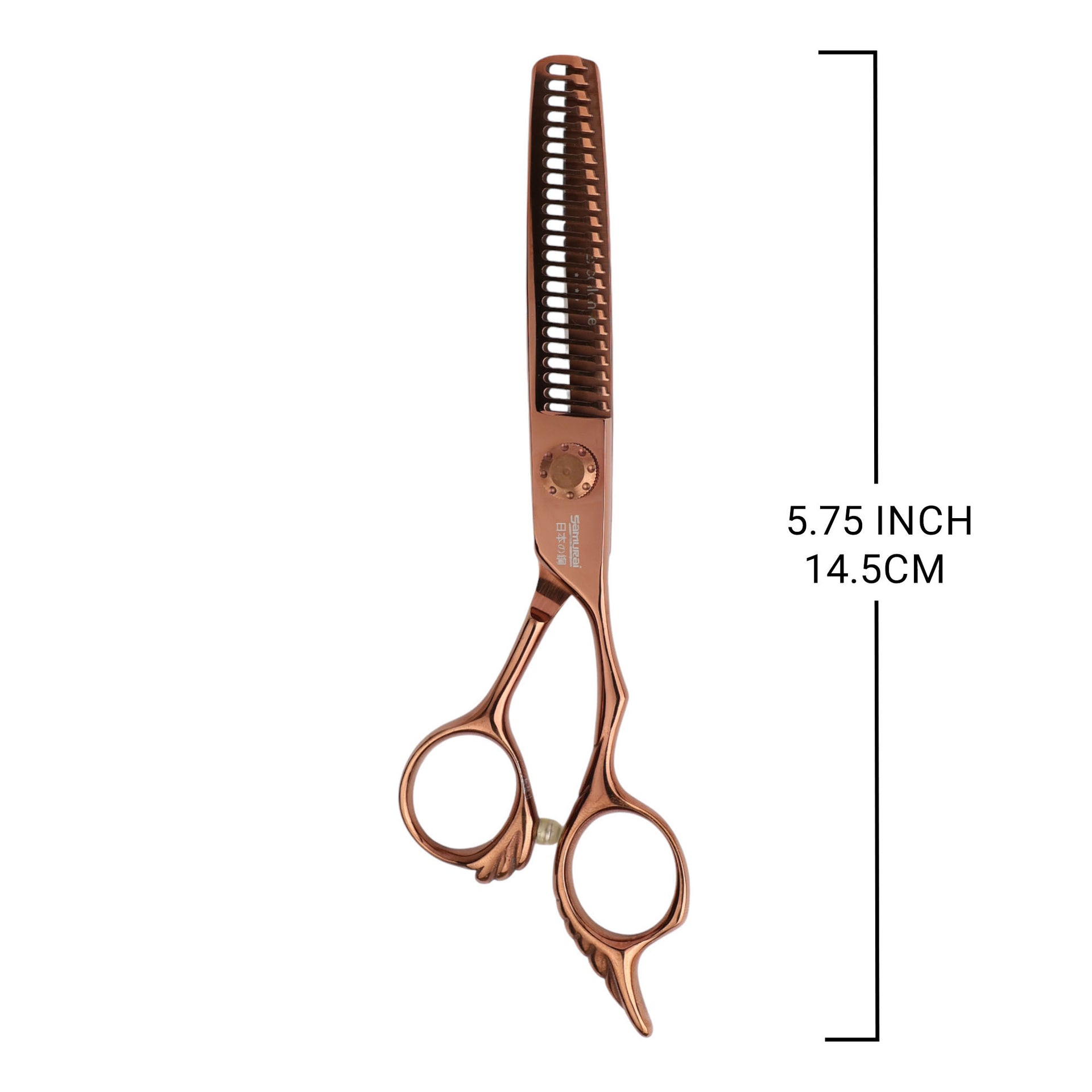 The Samurai 100-630 Classic Pro Rose Gold Premium Thinning Scissors combine elegance and precision for professional hairdressers who seek both style and performance in their tools. Made from superior 440c Japanese steel, these 5.75-inch (14.5cm) thinning scissors are designed to provide long-lasting sharpness and durability. The convex edge blades deliver clean, accurate thinning, making them perfect for reducing bulk, creating texture, and blending hair seamlessly. Their rose gold finish adds a touch of sophistication, while the ergonomic offset handle ensures a comfortable grip, minimising hand fatigue during extended use.