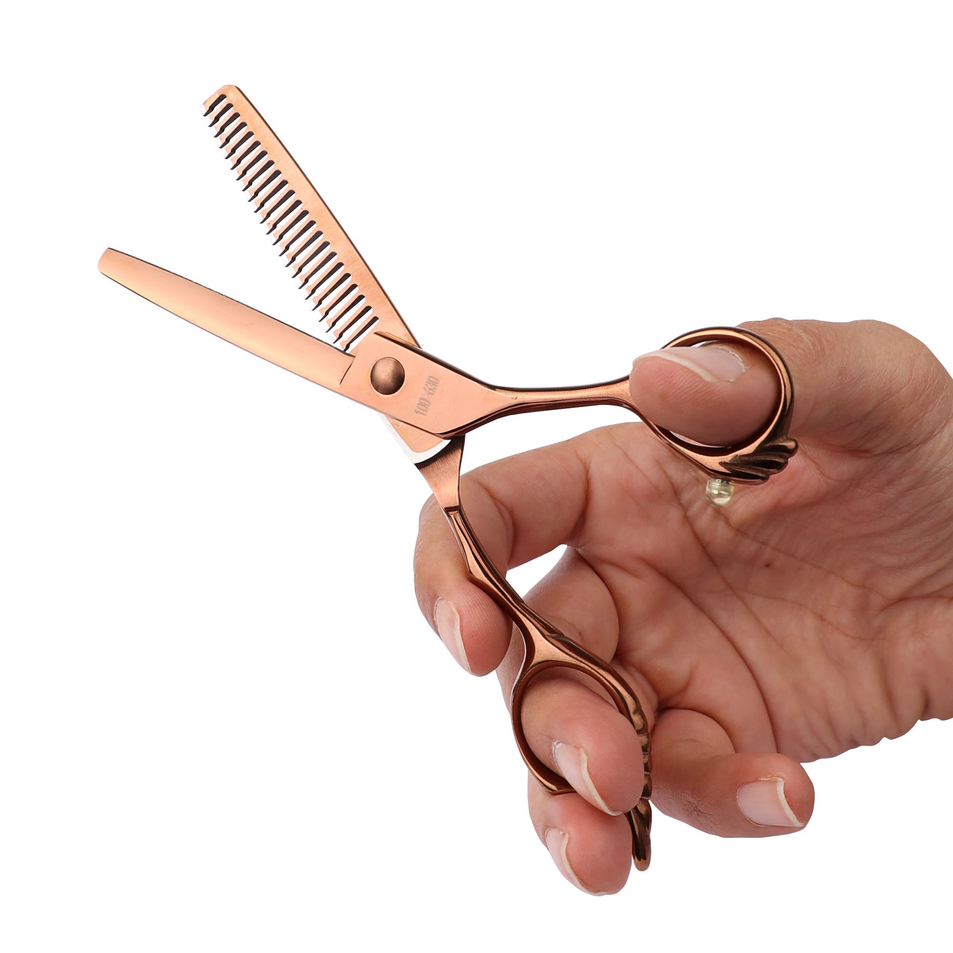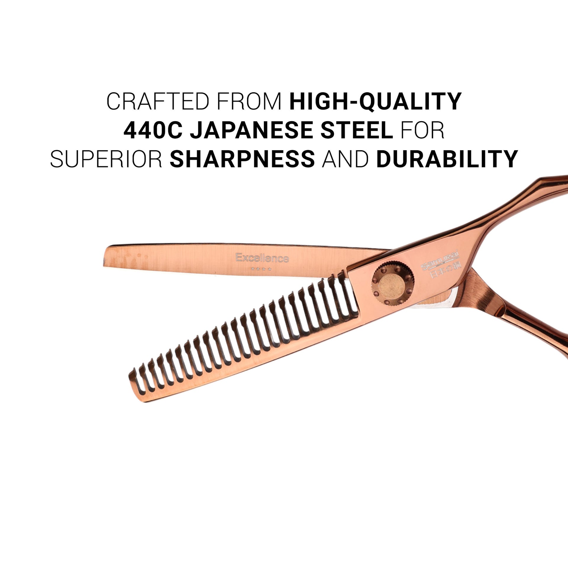Use the Samurai Rose Gold Thinning Scissors to reduce hair bulk and create soft, natural texture. Clean and oil regularly to maintain sharpness and durability.