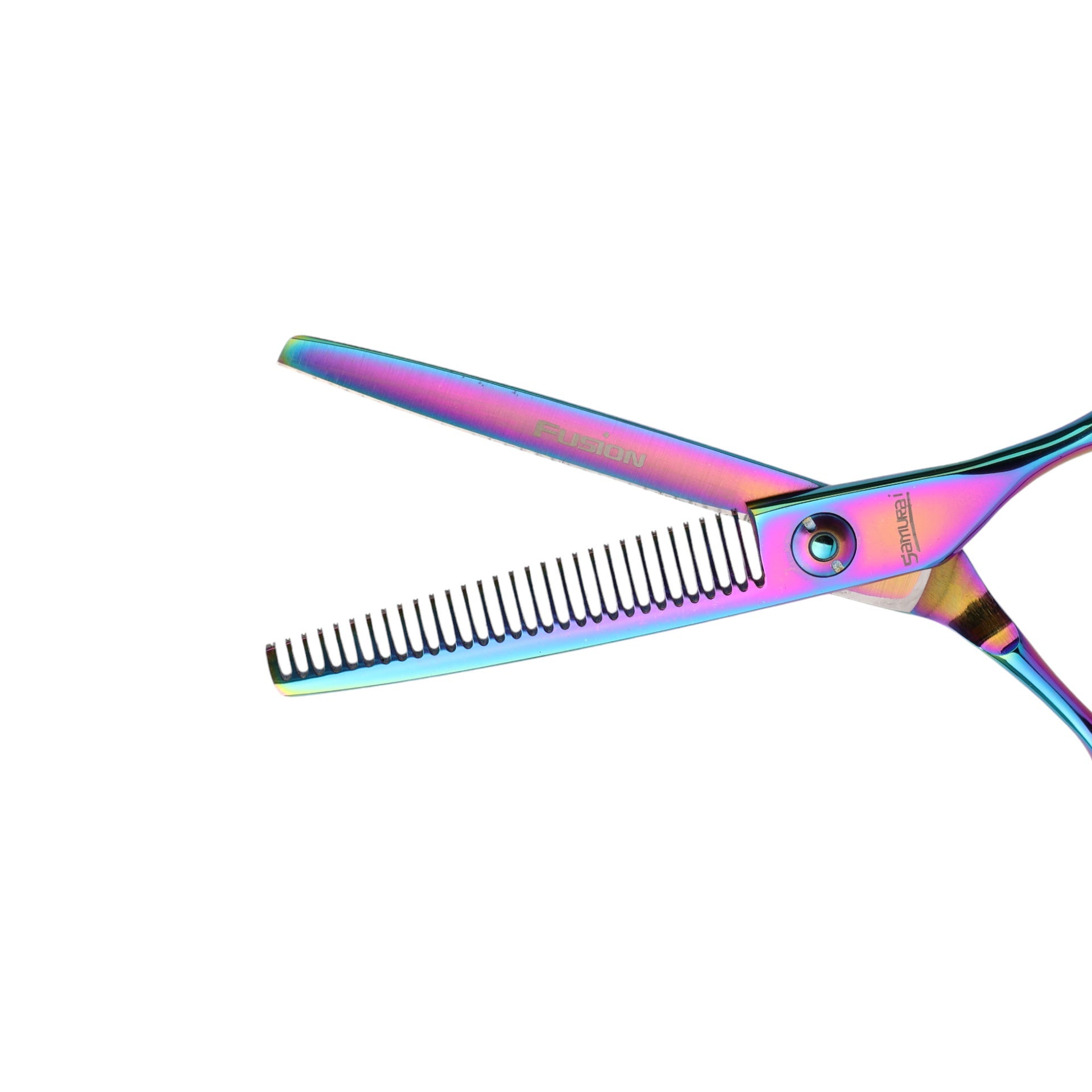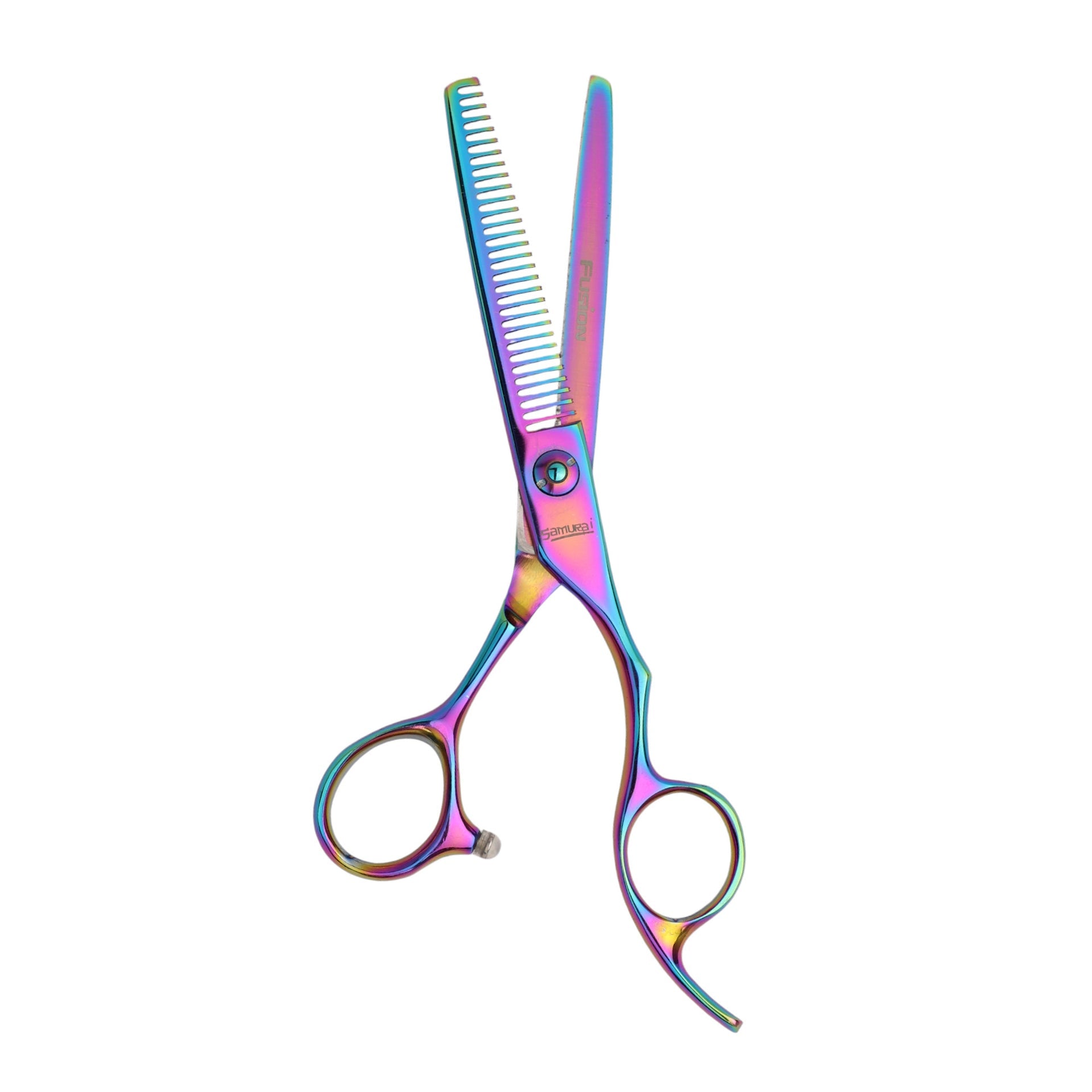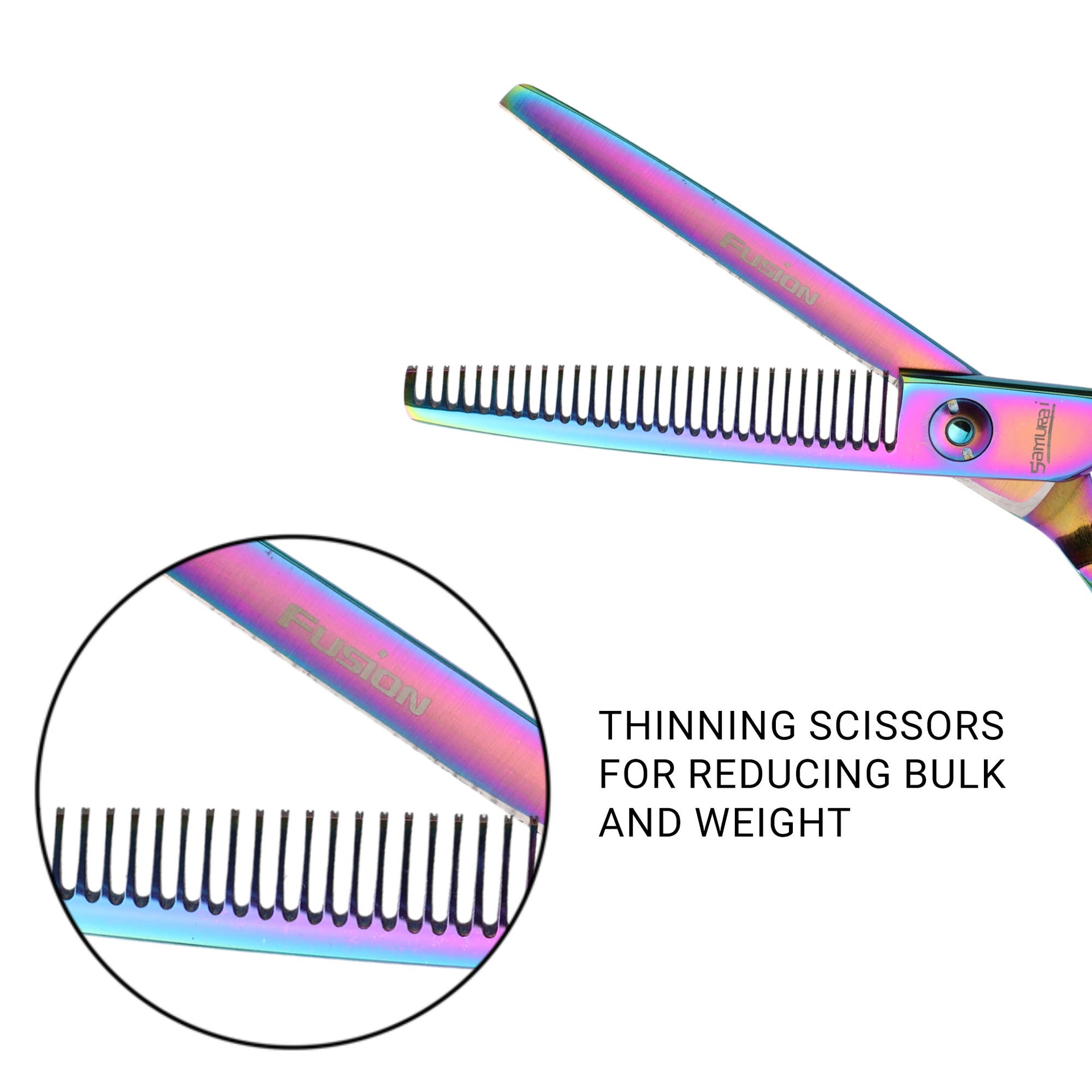 Use the Samurai Fusion Thinning Scissors to remove volume and blend lengths for a softer, more natural look. Clean and oil regularly to maintain top performance.