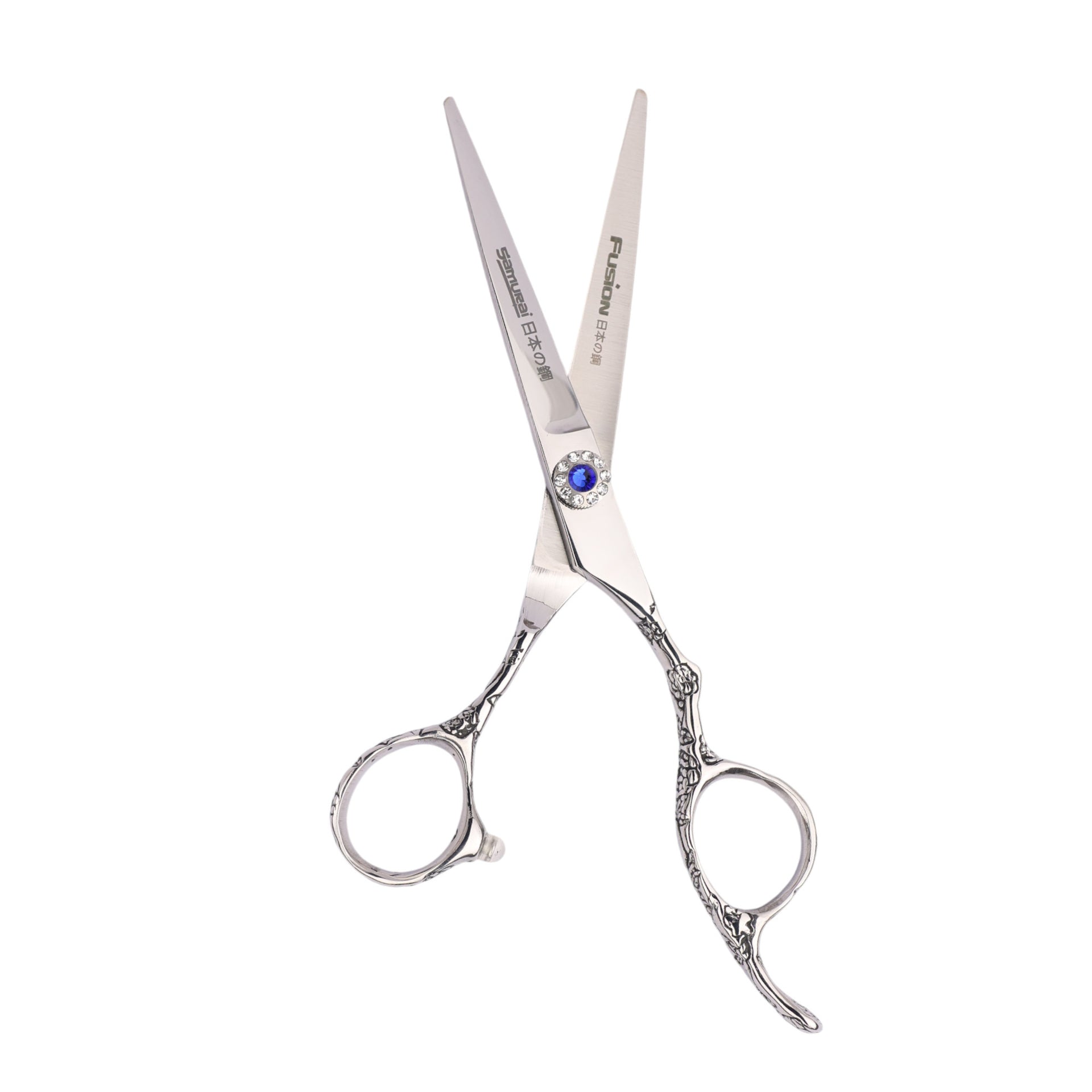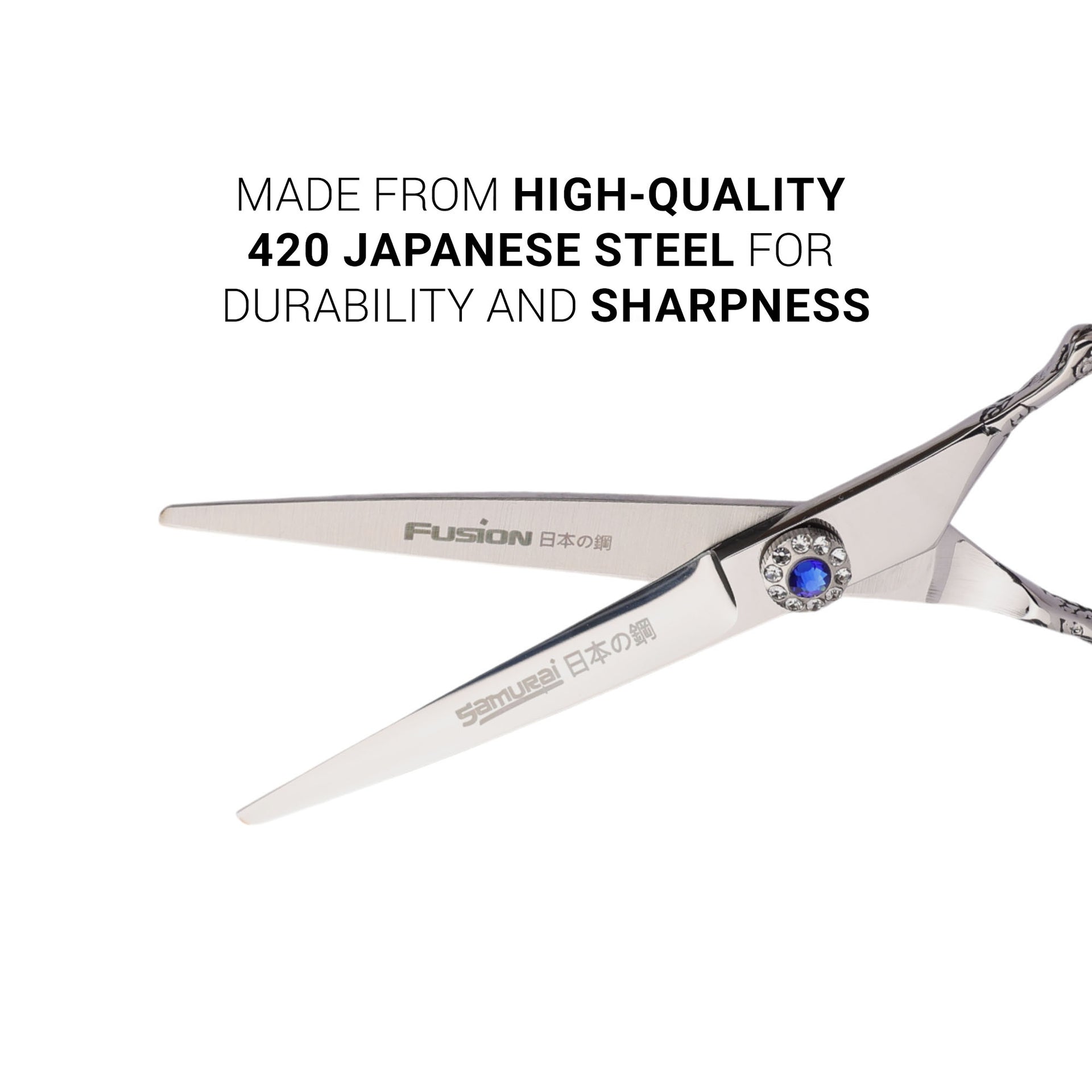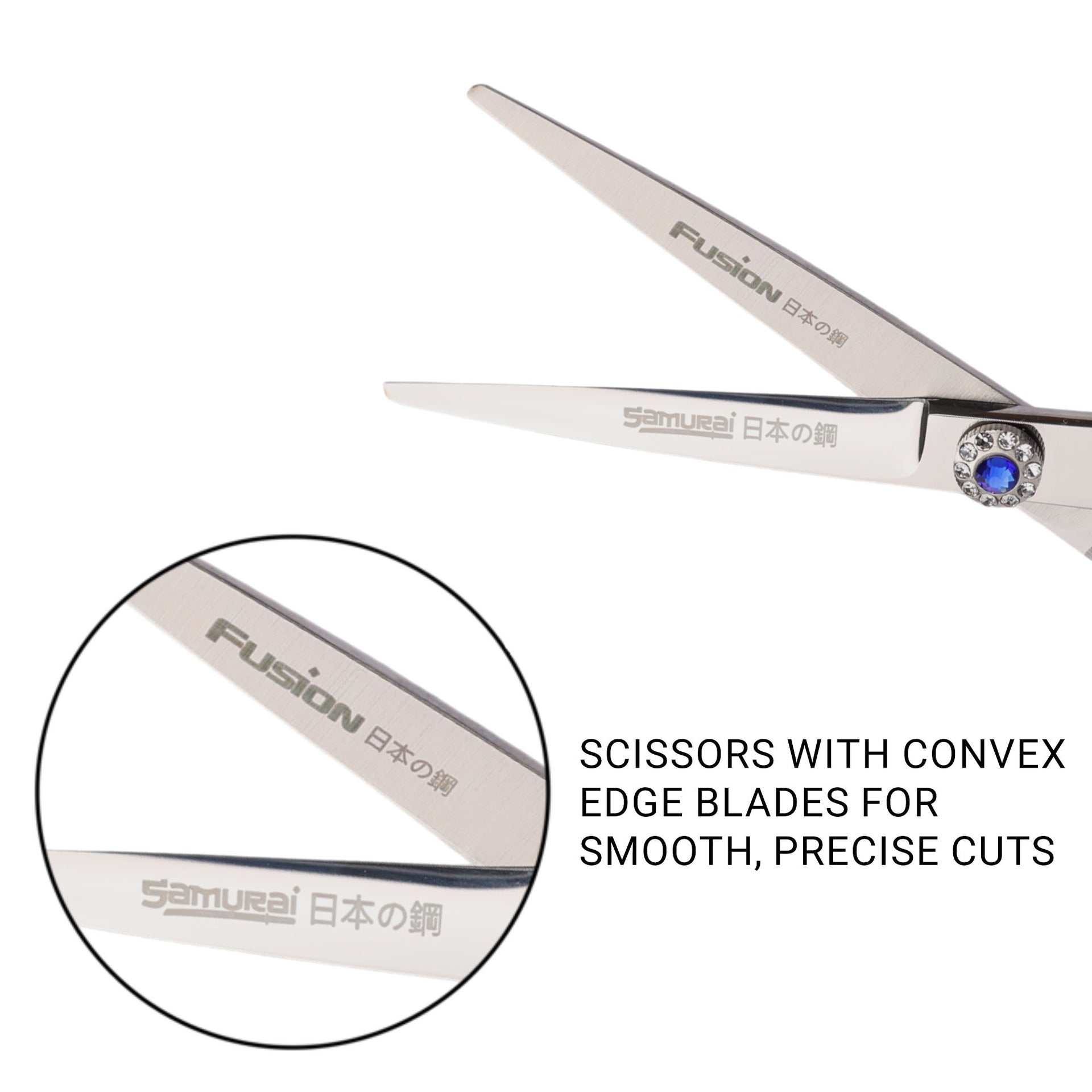 The Samurai 201-760 Fusion Jewel Scissors are crafted with precision and performance in mind, making them ideal for professional stylists. These 6-inch (16cm) scissors feature convex edge blades, delivering flawless results for both wet and dry cutting, as well as slicing techniques. Made from high-quality 420 Japanese steel, the blades are designed to maintain their sharpness even after extensive use, providing durability and reliability. With an ergonomic design, these scissors ensure comfort during long cutting sessions, reducing hand fatigue and allowing for greater control.