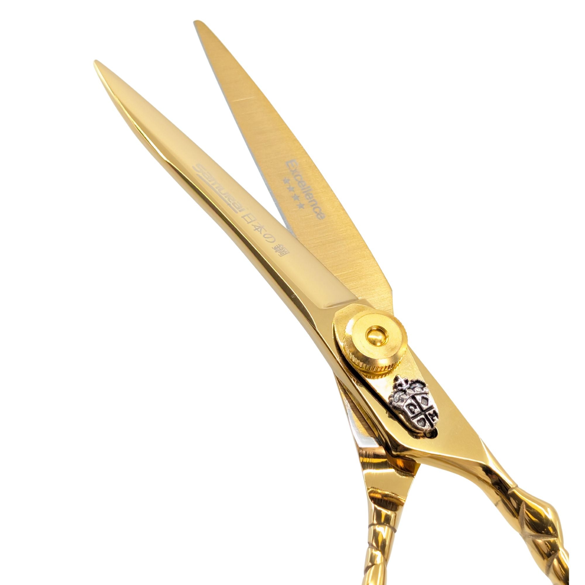 The Samurai - 6" Classic Pro Offset Scissor Gold (101-710) is a premium cutting tool for the professional stylist, combining flawless performance with a truly stunning design. These exquisite scissors are handmade from the finest Japanese steel, a material prized for its ability to hold an incredibly sharp and durable edge, ensuring reliable performance day after day. The blades are finished with a beautiful and hard-wearing gold titanium coating, which not only looks spectacular in your hand but also adds an extra layer of durability and corrosion resistance to your investment.
