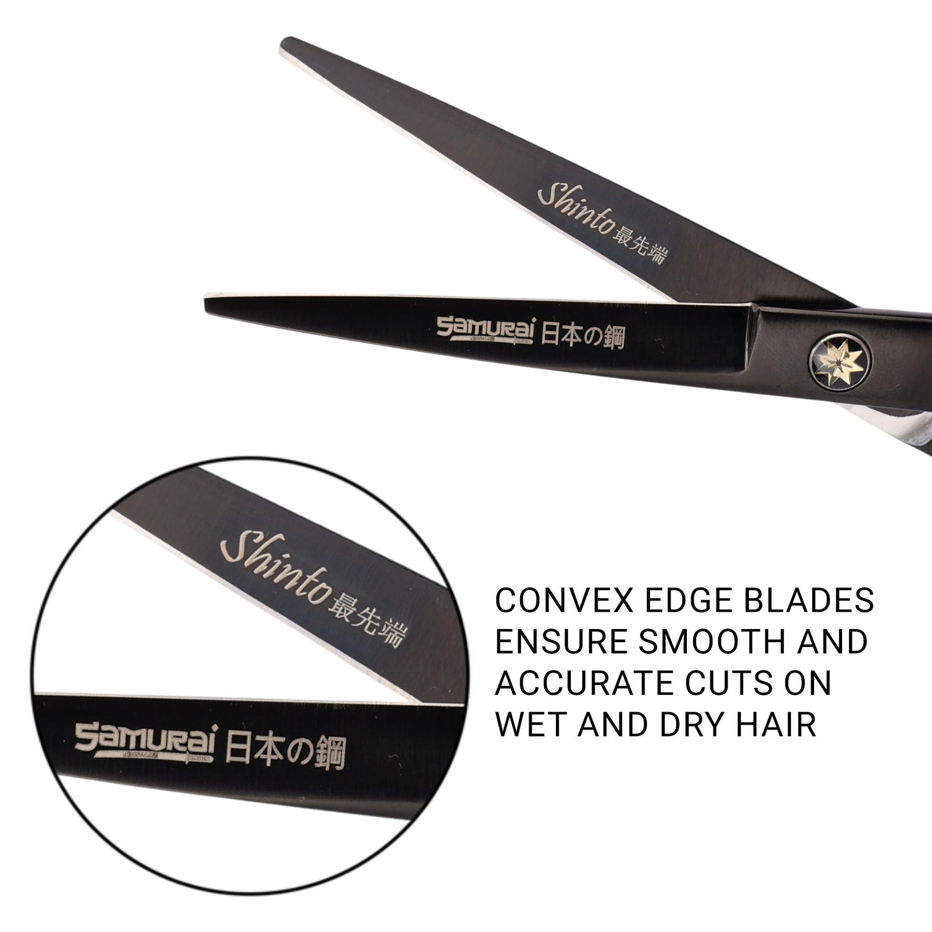Each pair of Samurai Shinto Black Scissors is well-balanced and lightweight, reducing hand fatigue and allowing for precise control over every cut. The convex edge blades are ideal for creating clean, professional results, making these scissors a must-have for any serious stylist. Whether you're cutting layers, trimming ends, or performing detailed haircuts, the Samurai Shinto Black Scissors will deliver consistent, reliable performance. Their durable construction means they will remain sharp and effective even after extensive use, making them a long-lasting investment for any salon professional.
