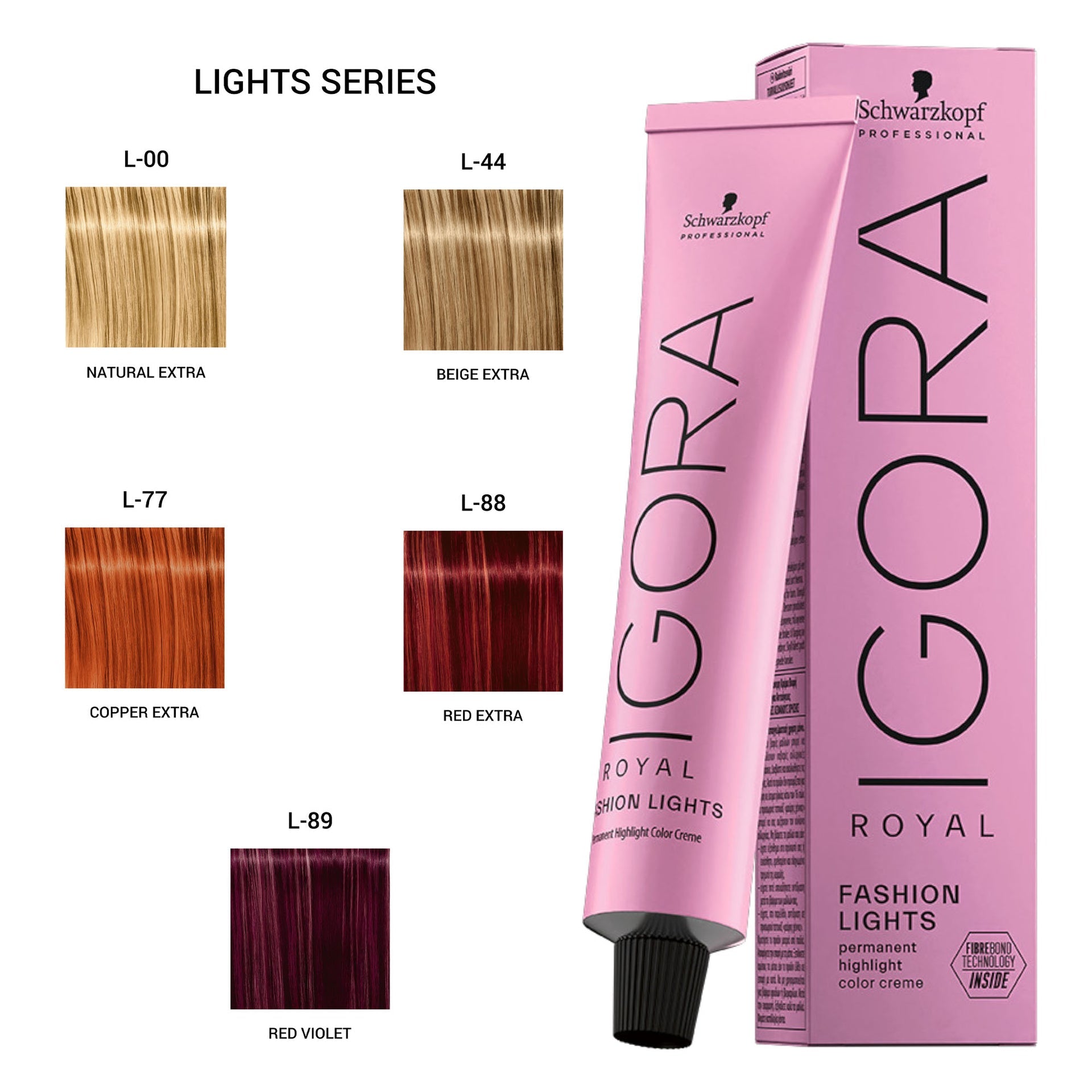 - Colour Palette: Fashion Lights Series - Offers a range of intense highlight shades including L-00 Natural Extra, L-44 Beige Extra, L-77 Copper Extra, L-88 Red Extra, and L-89 Red Violet.