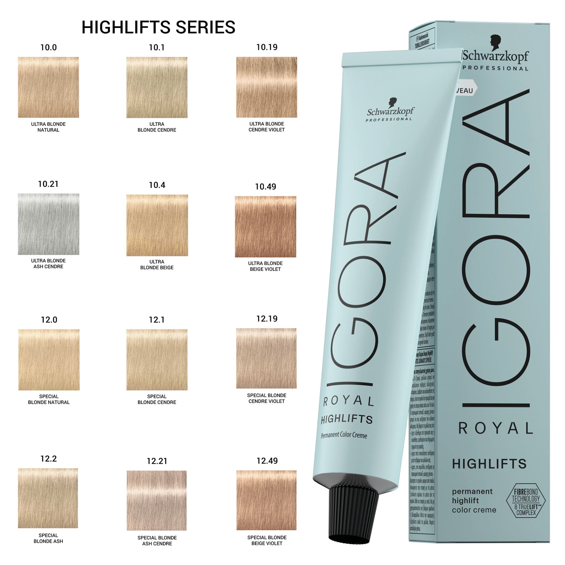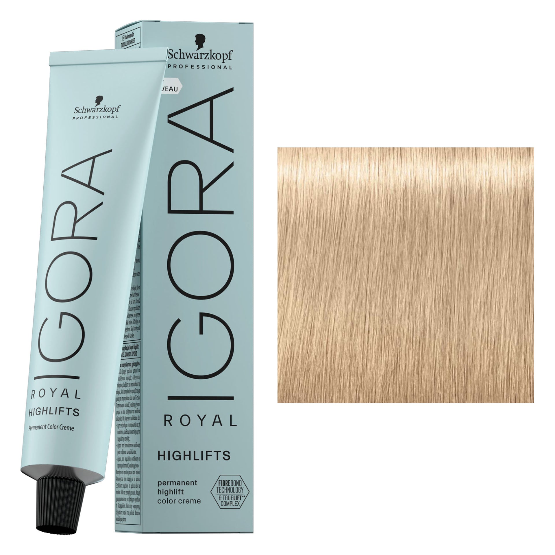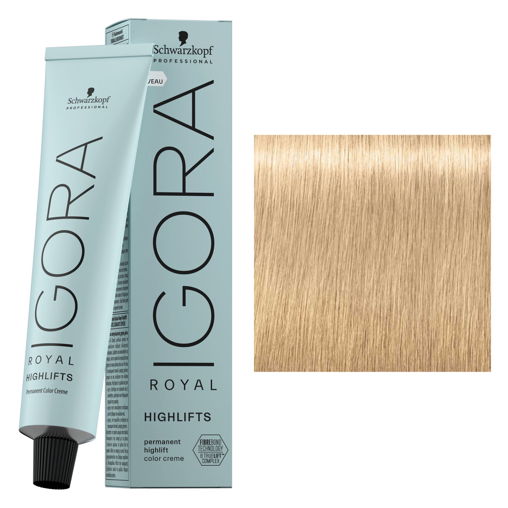 For professional use only. Mix the IGORA ROYAL Highlifts Permanent Hair Colour creme with the appropriate IGORA ROYAL Oil Developer (typically 9%/30 Vol. or 12%/40 Vol., sold separately) in the recommended ratio. Apply the mixture evenly to dry, unwashed hair, process according to the specific instructions for the chosen shade and desired lift, then rinse thoroughly.