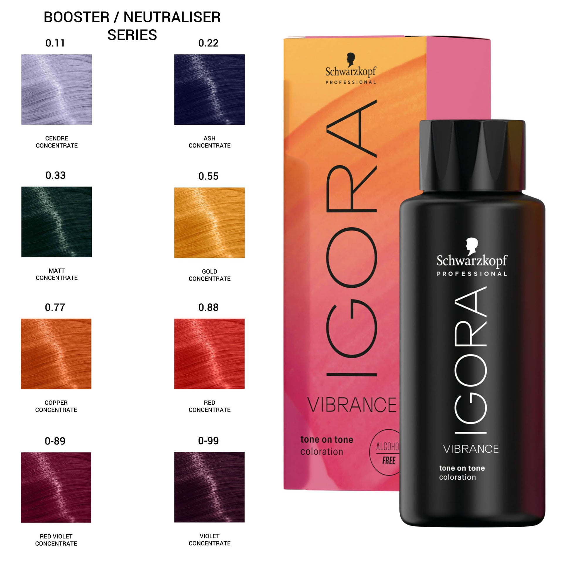 - Purpose: Technical additives for demi-permanent hair colouring; used to boost specific tones or neutralise unwanted undertones in conjunction with other IGORA VIBRANCE shades.