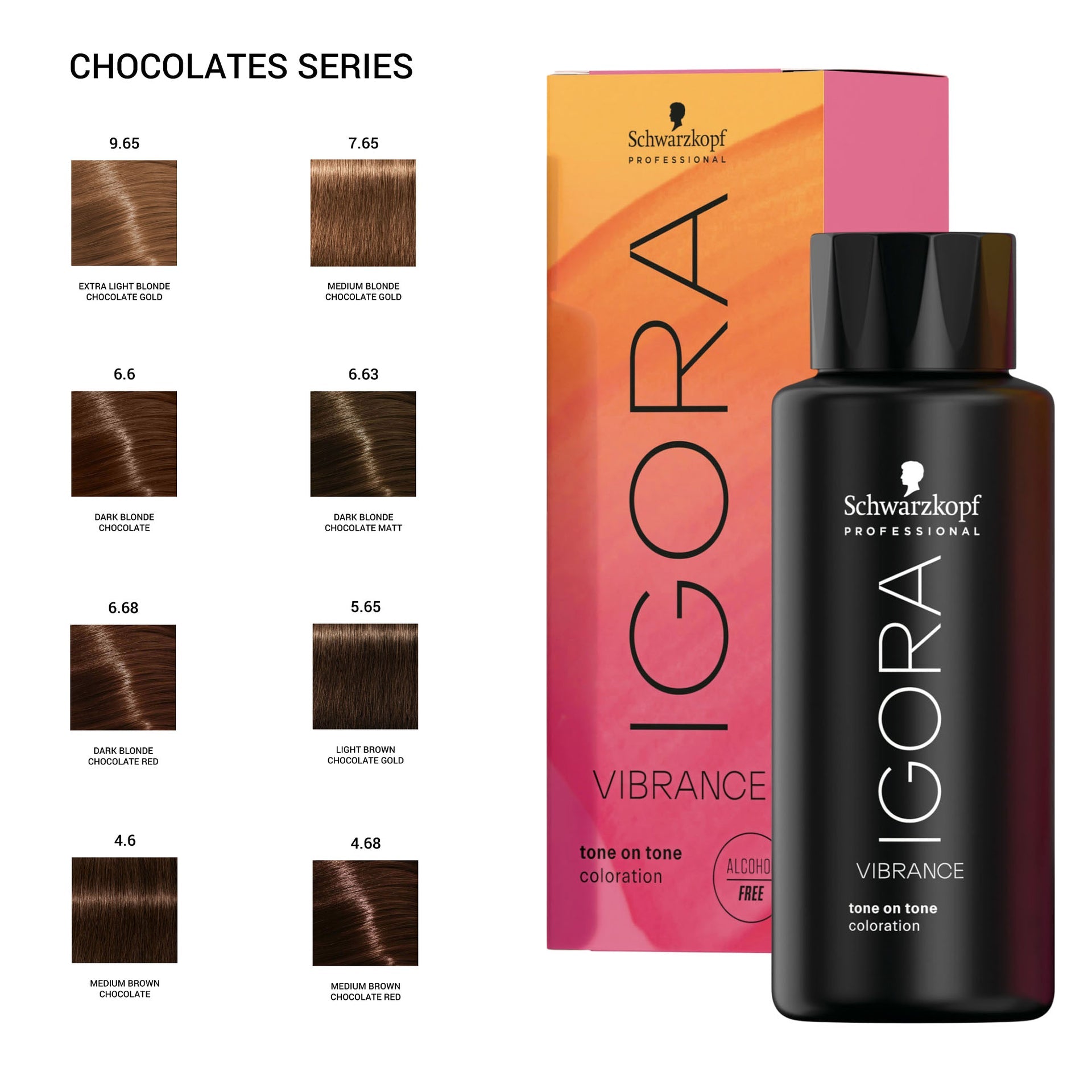 - Colour Palette: Chocolates Series - Includes a variety of rich brunette shades such as Extra Light Blonde Chocolate Gold (9-65), Medium Blonde Chocolate Gold (7-65), Dark Blonde Chocolate (6-6), Dark Blonde Chocolate Matt (6-63), Dark Blonde Chocolate Red (6-68), Light Brown Chocolate Gold (5-65), Medium Brown Chocolate (4-6), and Medium Brown Chocolate Red (4-68).