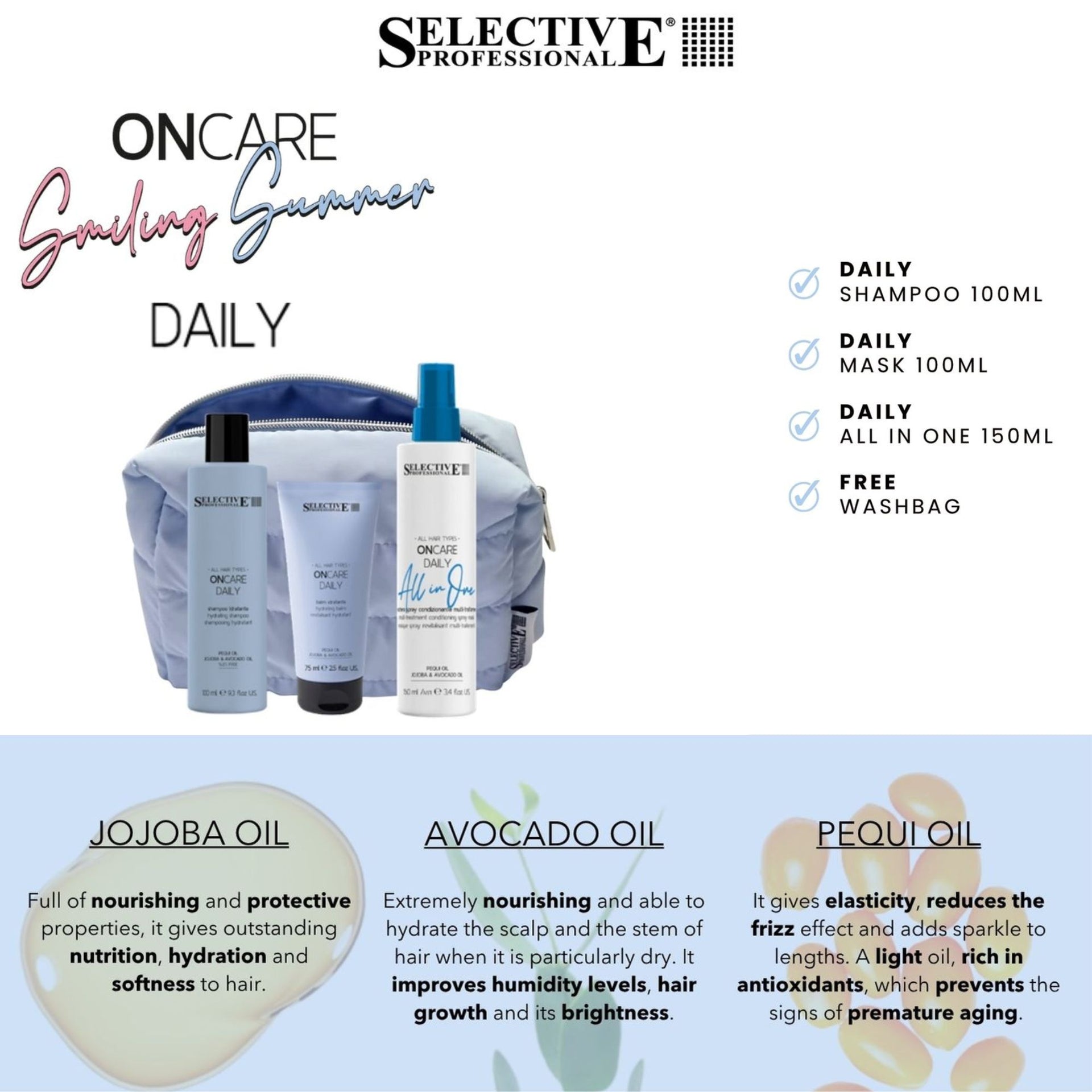Keep your hair perfectly hydrated and nourished every day with the Selective Professional - OnCare Daily Smiling Summer Kits. Specially designed for all hair types, this essential travel set provides the gentle care needed for frequent washing, making it perfect for an active lifestyle. Its advanced formula is enriched with a powerful trio of natural oils: Jojoba, Avocado, and Pequi. These ingredients work in synergy to restore moisture, improve elasticity, and give outstanding softness to the hair. It effectively combats dryness and dullness, leaving your hair feeling refreshed, revitalised, and beautifully healthy day in, day out.