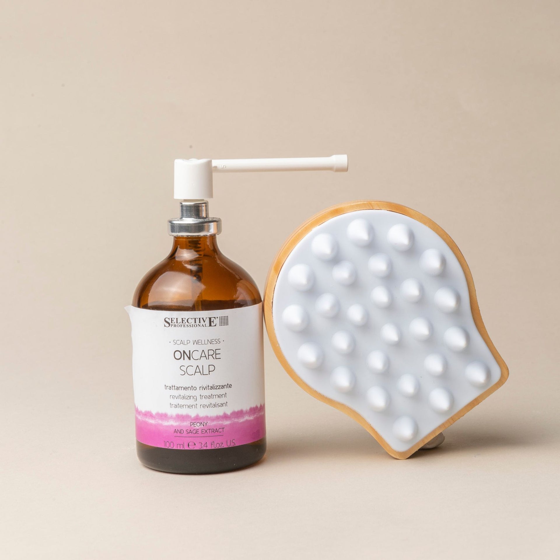 The Selective Professional OnCare Scalp Revitalizing Treatment offers a sophisticated, no-rinse solution for those concerned with hair thinning and loss due to stress, seasonal changes or early-stage pattern hair loss. This professional-grade 100ml spray delivers powerful active ingredients directly to the follicles, where they work continuously to stimulate cellular regeneration and strengthen hair from the root. At the heart of this innovative formula is Redensyl, a breakthrough complex of four molecules (DHQG, EGCG2, Glycine and Zinc) clinically proven to reactivate stem cells in hair bulbs and promote new growth. Unlike conventional treatments that only address symptoms, this targeted therapy works at the cellular level to create a healthier scalp environment that supports stronger, thicker hair growth. The lightweight formula absorbs quickly without weighing down hair, making it suitable for daily use as both a treatment for existing thinning and a preventative measure against future hair loss.