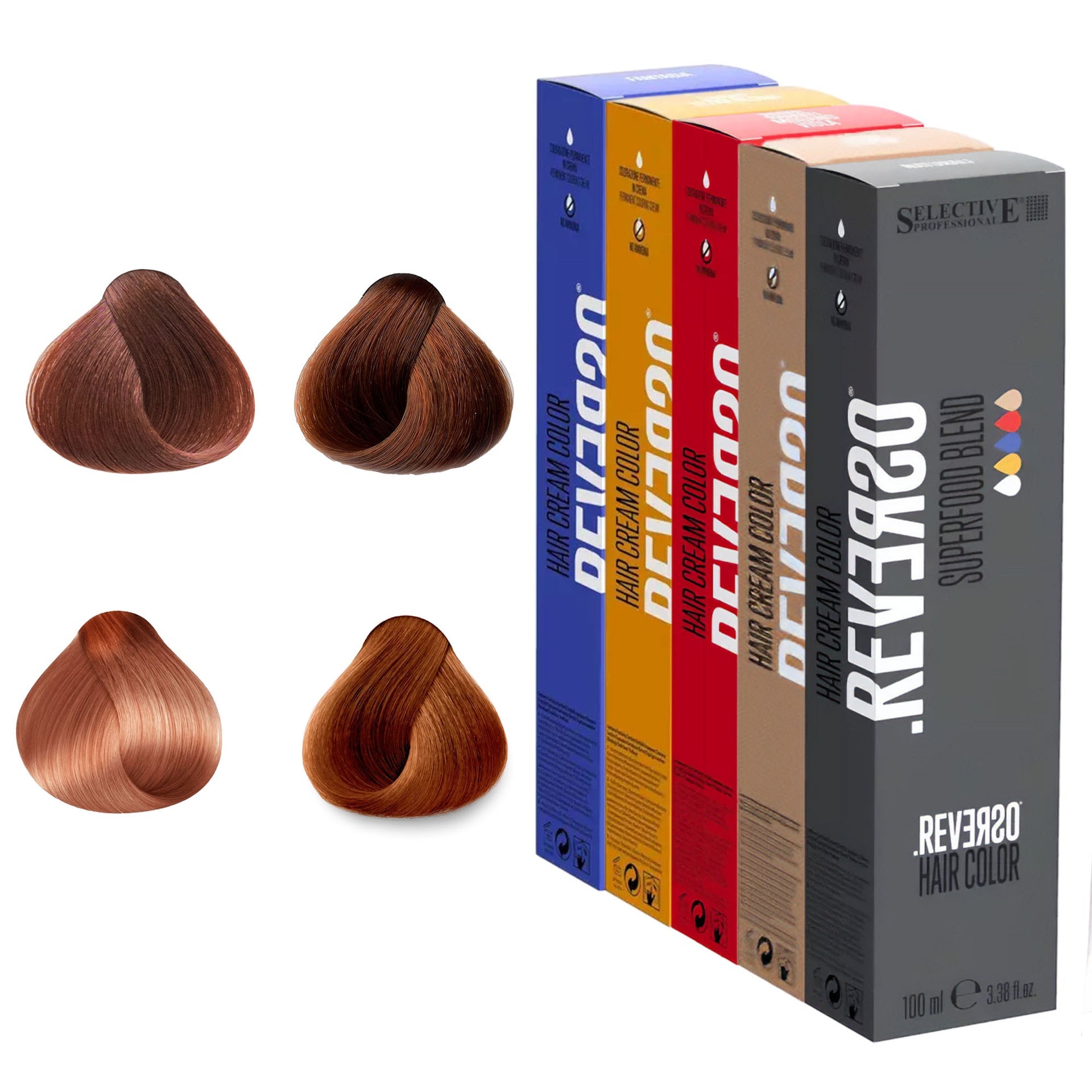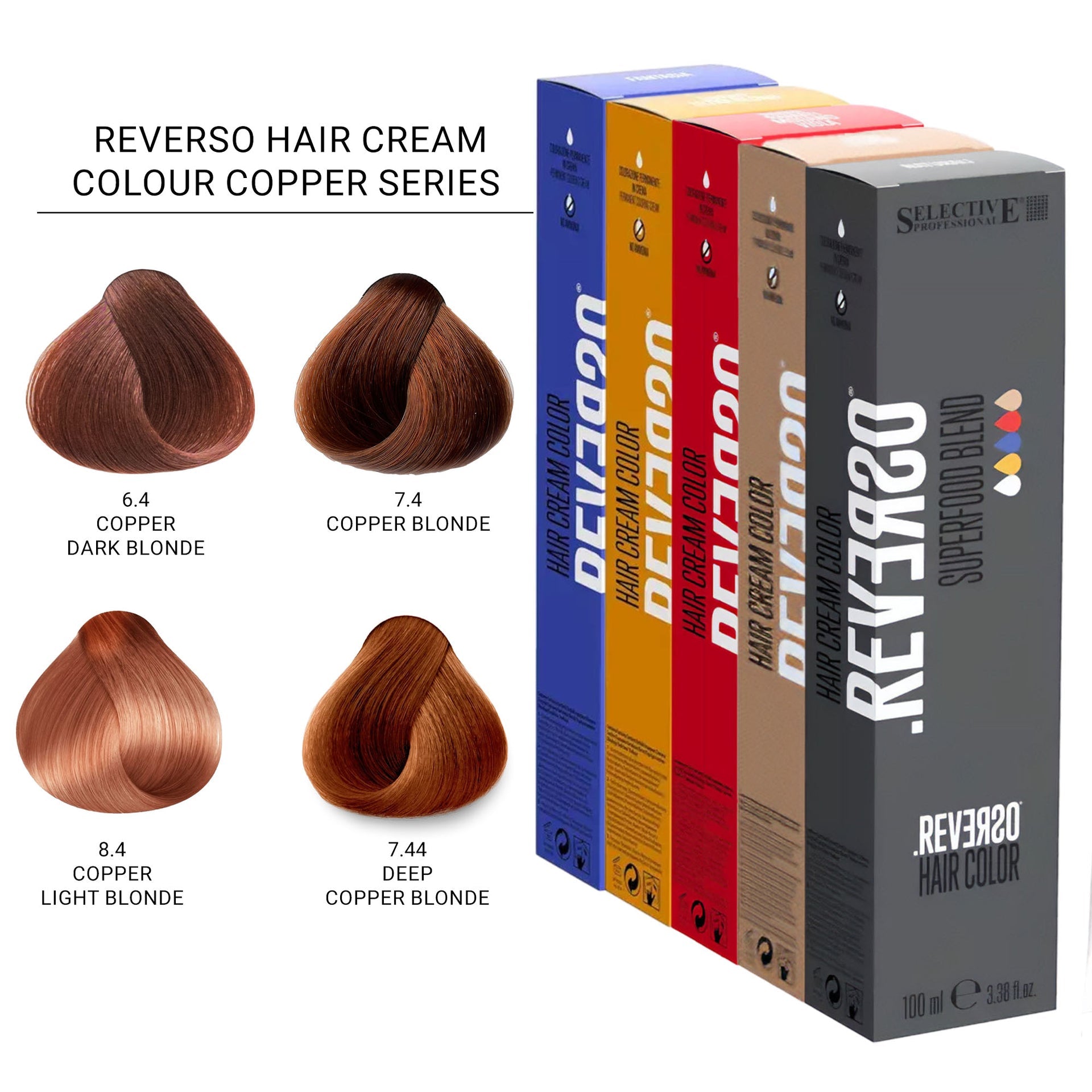 The Selective Professional Reverso Hair Cream Colour 100ml from the Copper Series is a premium, ammonia-free permanent hair dye that provides vibrant and long-lasting copper tones. Enriched with a unique blend of Superfoods extracts, including avocado, ginger, and red fruits, this innovative formula nourishes the hair while delivering striking colour results. Free from both ammonia and PPD, it ensures a gentler application process, respecting the hair’s natural structure and leaving it soft, smooth, and healthy-looking. Perfect for professional use, the Reverso Hair Cream Colour guarantees 100% grey coverage with deep, radiant pigments, offering salon-quality results that last. Its superfood-infused formula also promotes hydration and shine, making hair more manageable and visibly healthier after just one application.