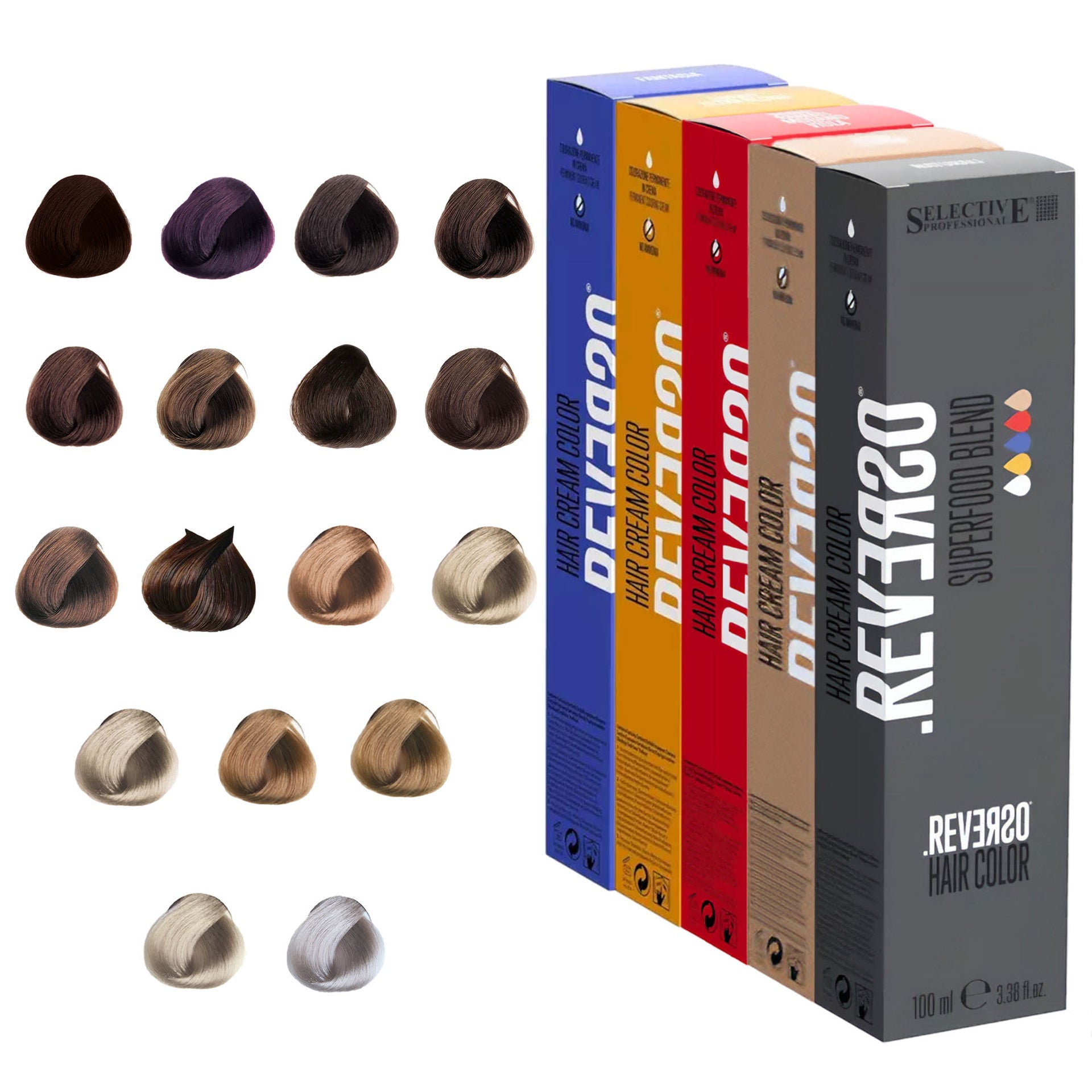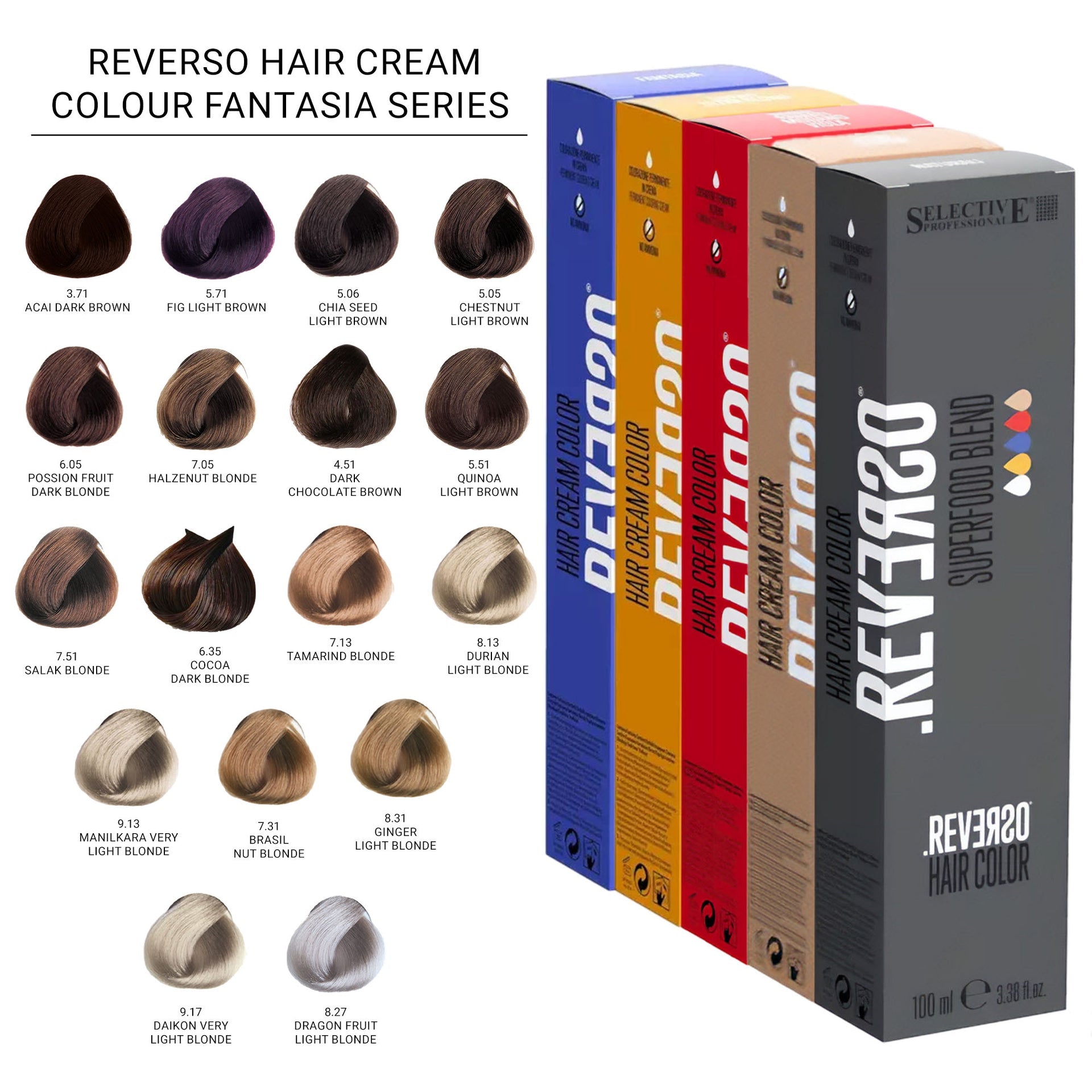 The Selective Professional Reverso Hair Cream Colour 100ml from the Fantasia Series is a high-performance, ammonia-free permanent hair dye designed to deliver vibrant, long-lasting colour. Enriched with a unique blend of Superfoods extracts, including avocado, ginger, and red fruits, this formula nourishes and revitalises hair while providing full, radiant coverage. Free from both ammonia and PPD, the Reverso Hair Cream Colour offers a gentle yet effective application that respects the hair’s natural structure, leaving it soft, silky, and healthier from the very first use. It guarantees 100% grey coverage and provides a bold, rich colour that is ideal for professional results.