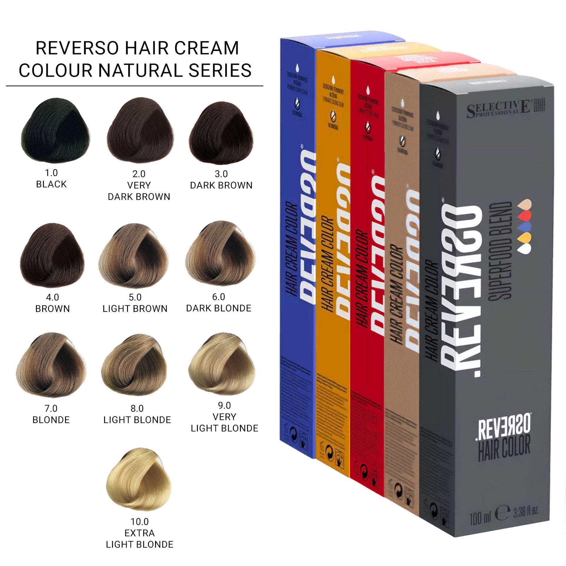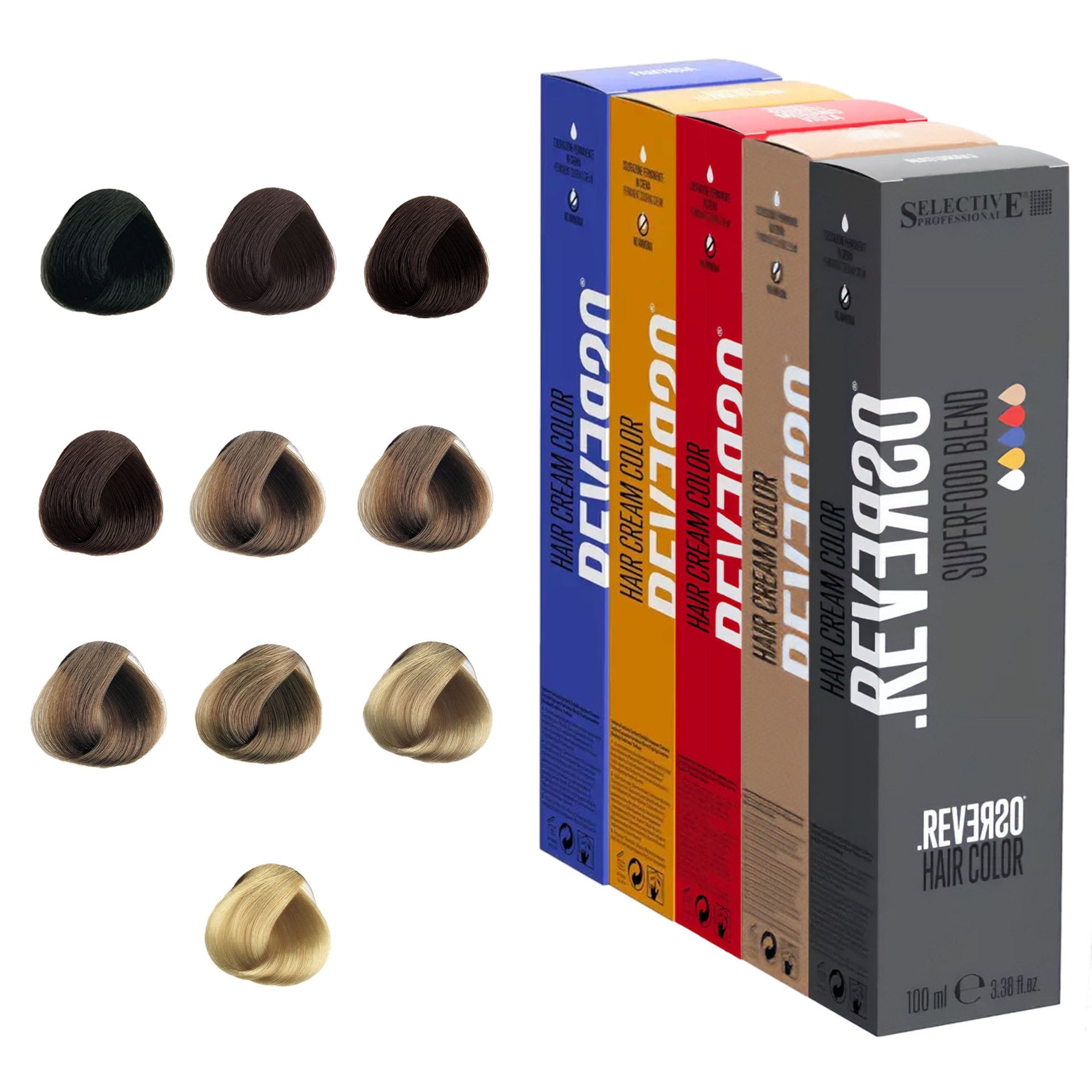 The Selective Professional Reverso Hair Cream Colour 100ml from the Natural Series offers an innovative, ammonia-free formula designed to deliver brilliant, long-lasting colour while deeply nourishing the hair. Enriched with an exclusive blend of fresh Superfoods extracts, including avocado, ginger, and red fruits, this permanent hair colour provides complete grey coverage and ensures a radiant, healthy appearance. The absence of ammonia and PPD creates a more gentle and sensory experience for both the client and the hairdresser, protecting the hair fibre throughout the colouring process. With 48 stunning shades available, the Reverso Hair Cream Colour is ideal for achieving rich, vibrant tones while maintaining hair health. Its rich pigments penetrate deeply, ensuring colour longevity and a smooth, glossy finish. Whether you're covering greys or enhancing your natural colour, this product ensures professional results with every use.